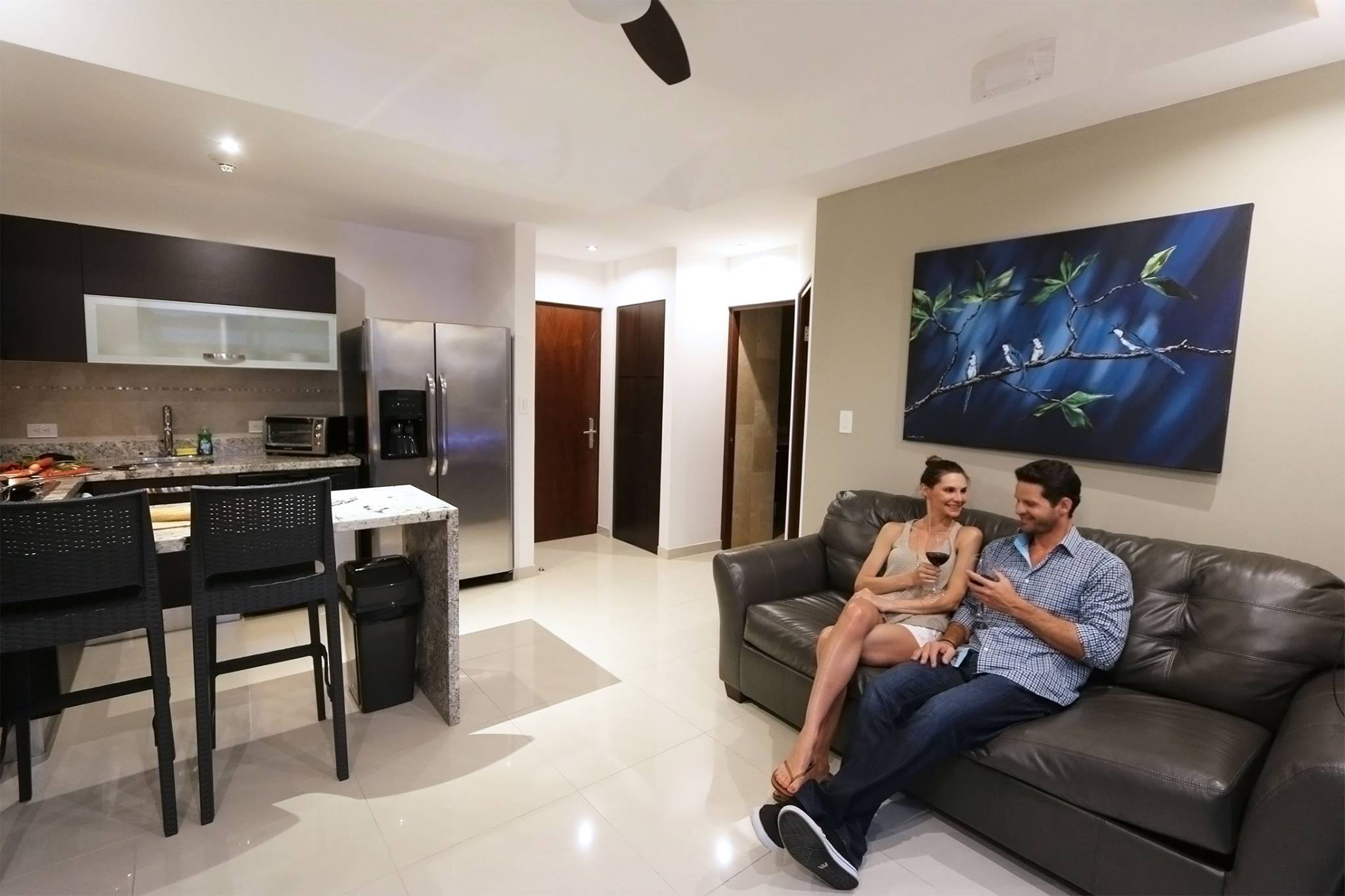 Bedroom with a Queen size bed, closet with safe box, flat screen TV & balcony Fully-equipped kitchen with gorgeous granite counter tops Living room with leather sofa-bed, flat screen TV & balcony Marble bathroom with onyx sink and double entrance door Washer & Dryer in suite