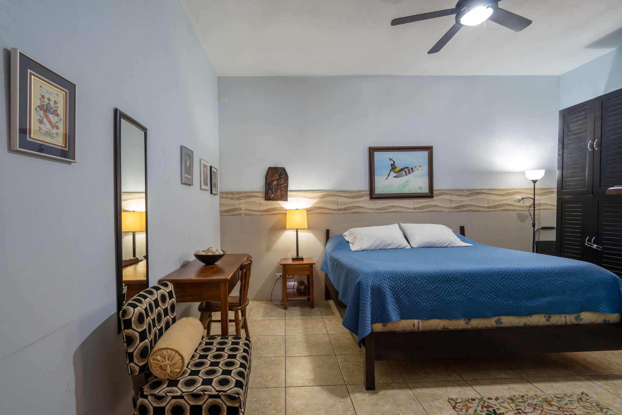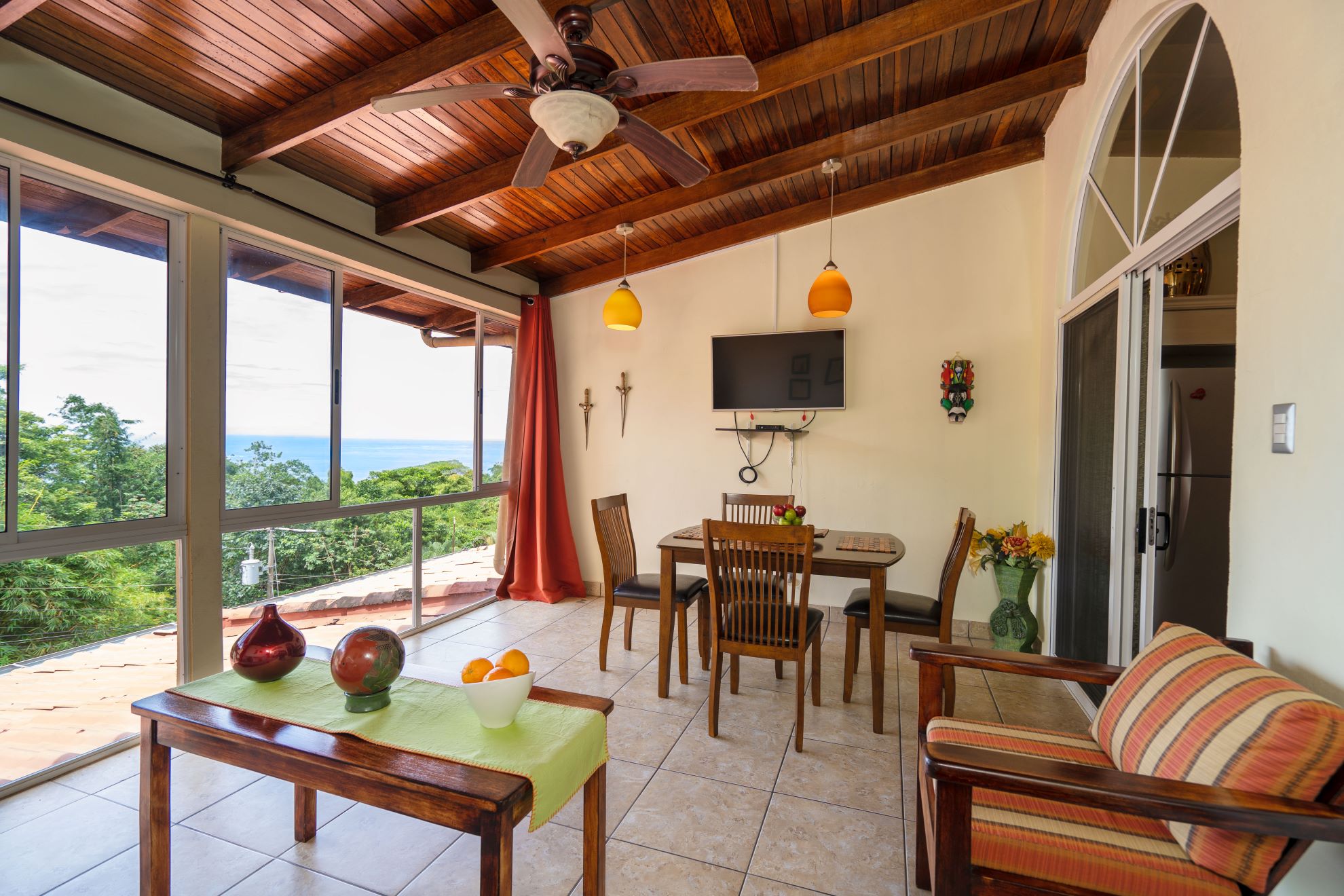 Centrally located in the heart of Manuel Antonio, Villas El Parque is positioned on a hillside with elevated views of the Manuel Antonio beach and the Pacific Ocean. This Condominium Villa is uniquely favored, compared with the other villas, since it is about 800 sq. ft., all on one level. This includes one large dedicated bedroom (with king bed and large closets), and 2 additional independent sleeping areas, each with sofa beds, large TV, and separate air conditioners. The condo can sleep up to 6. This makes it a perfect home or vacation rental for a family or group of friends.
