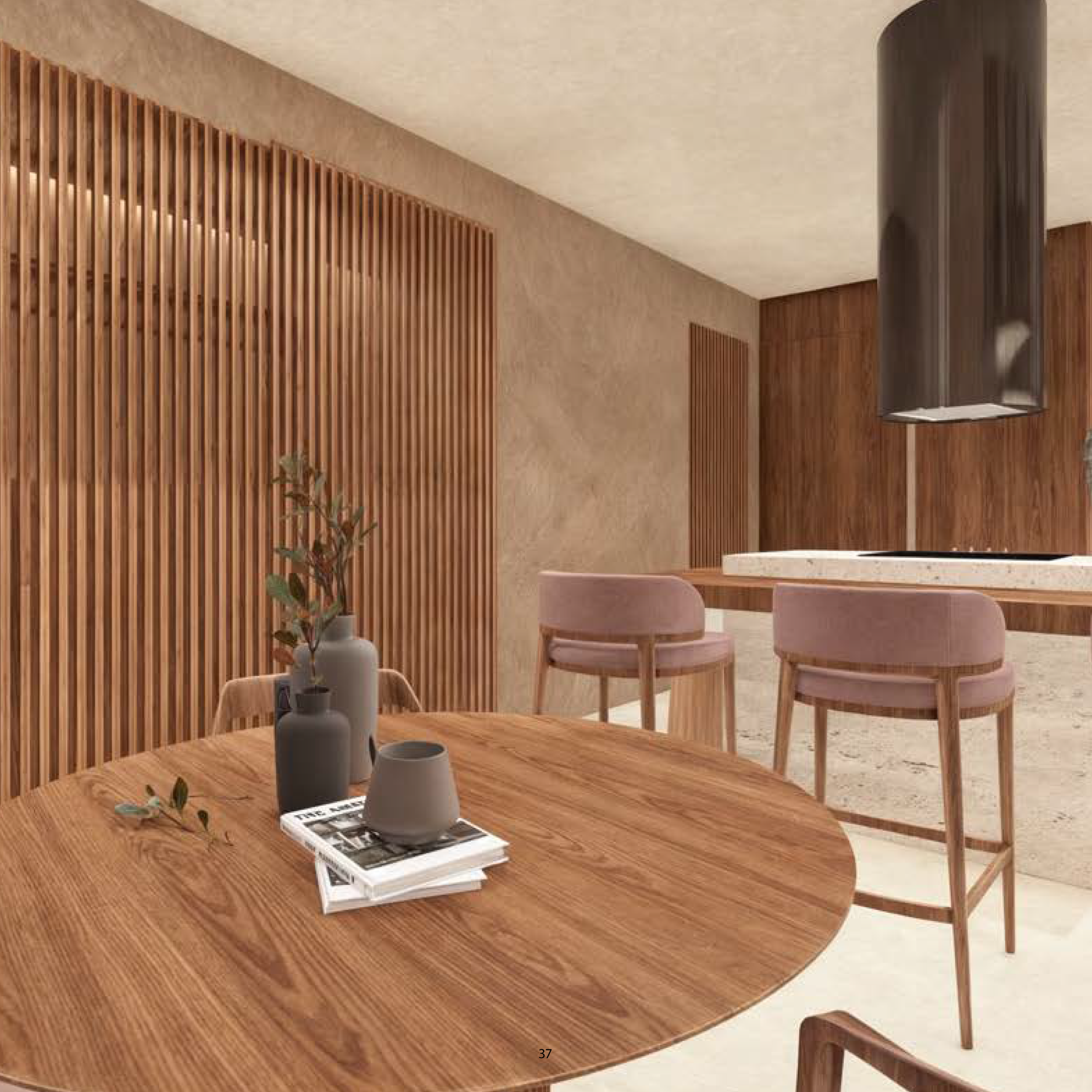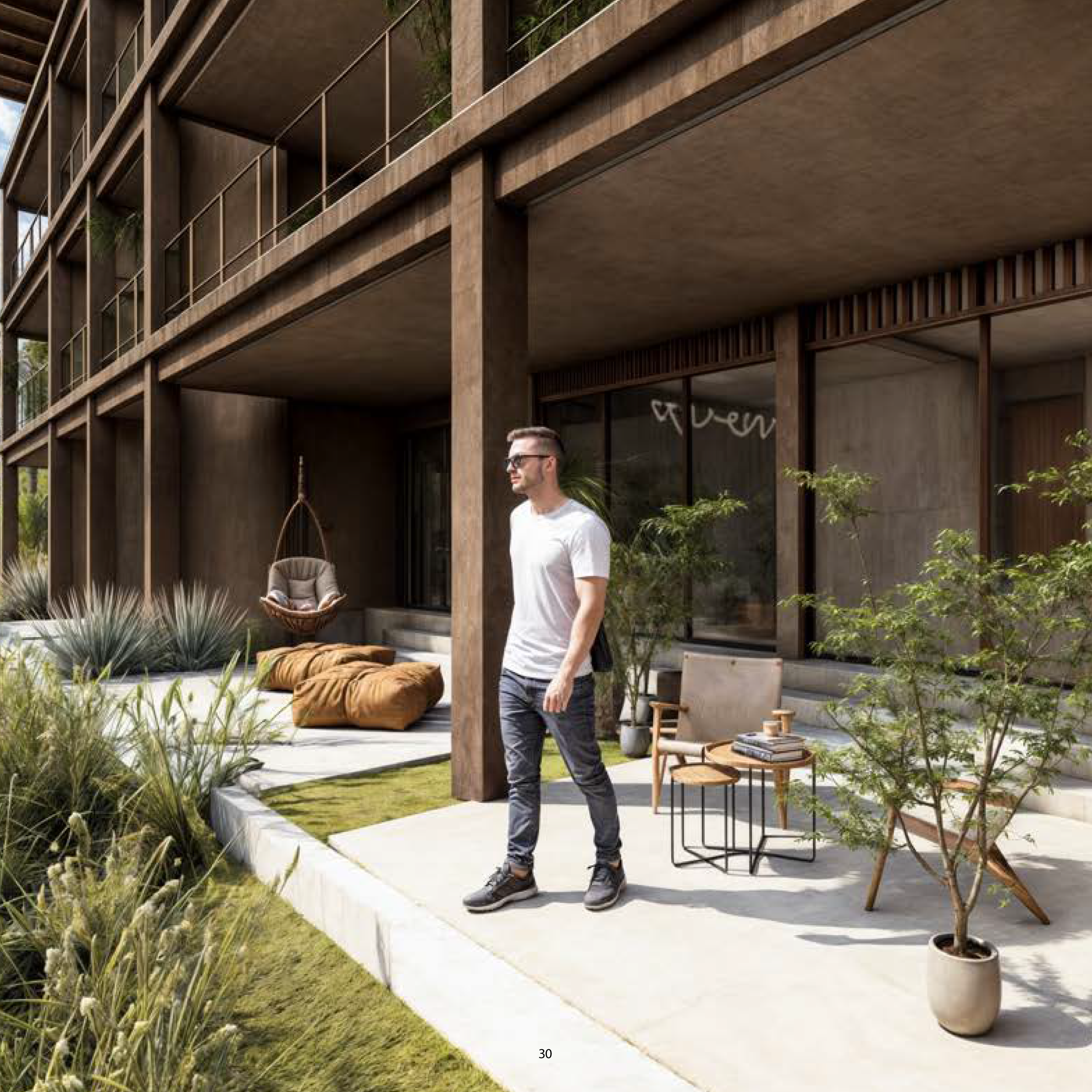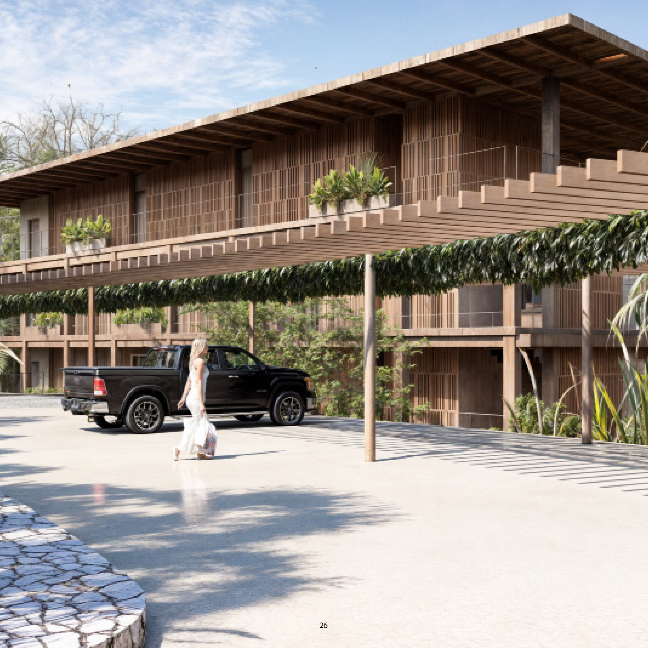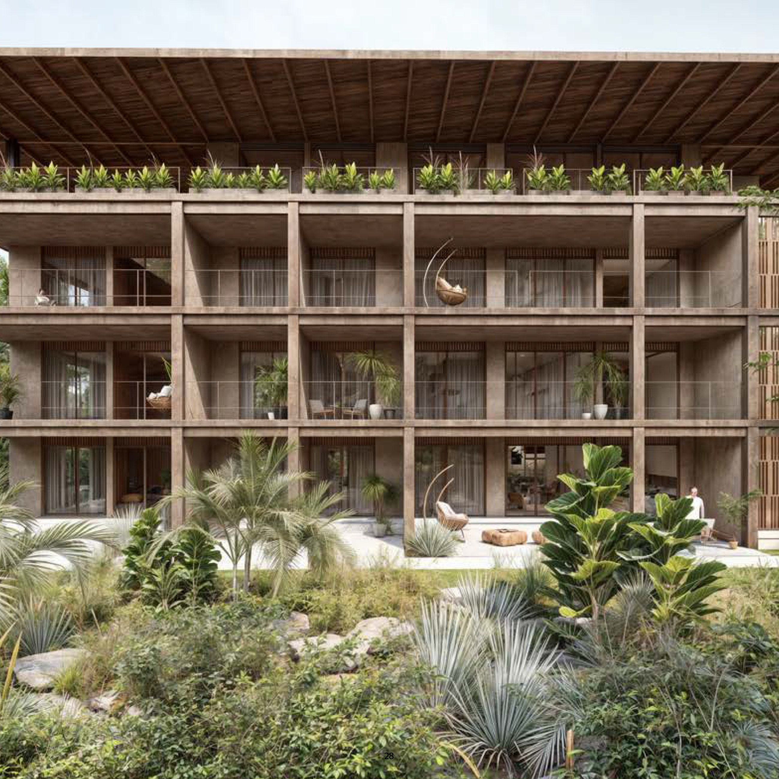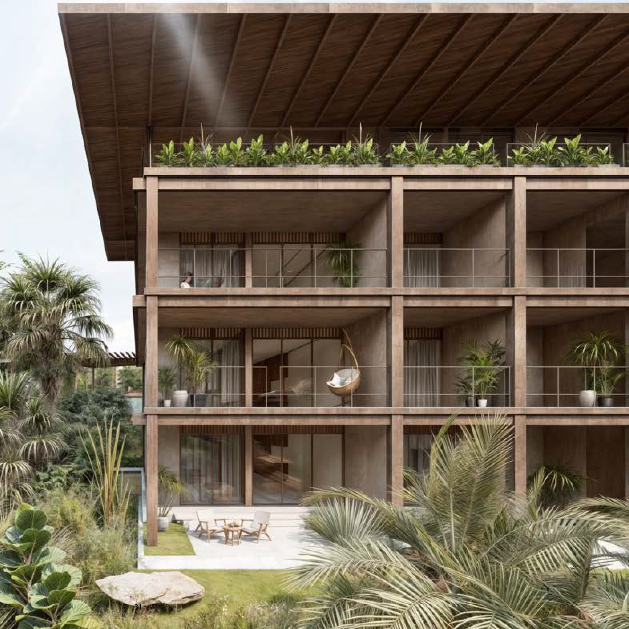 • Natural wood screens provide privacy while promoting airflow and supporting sustainable design.
