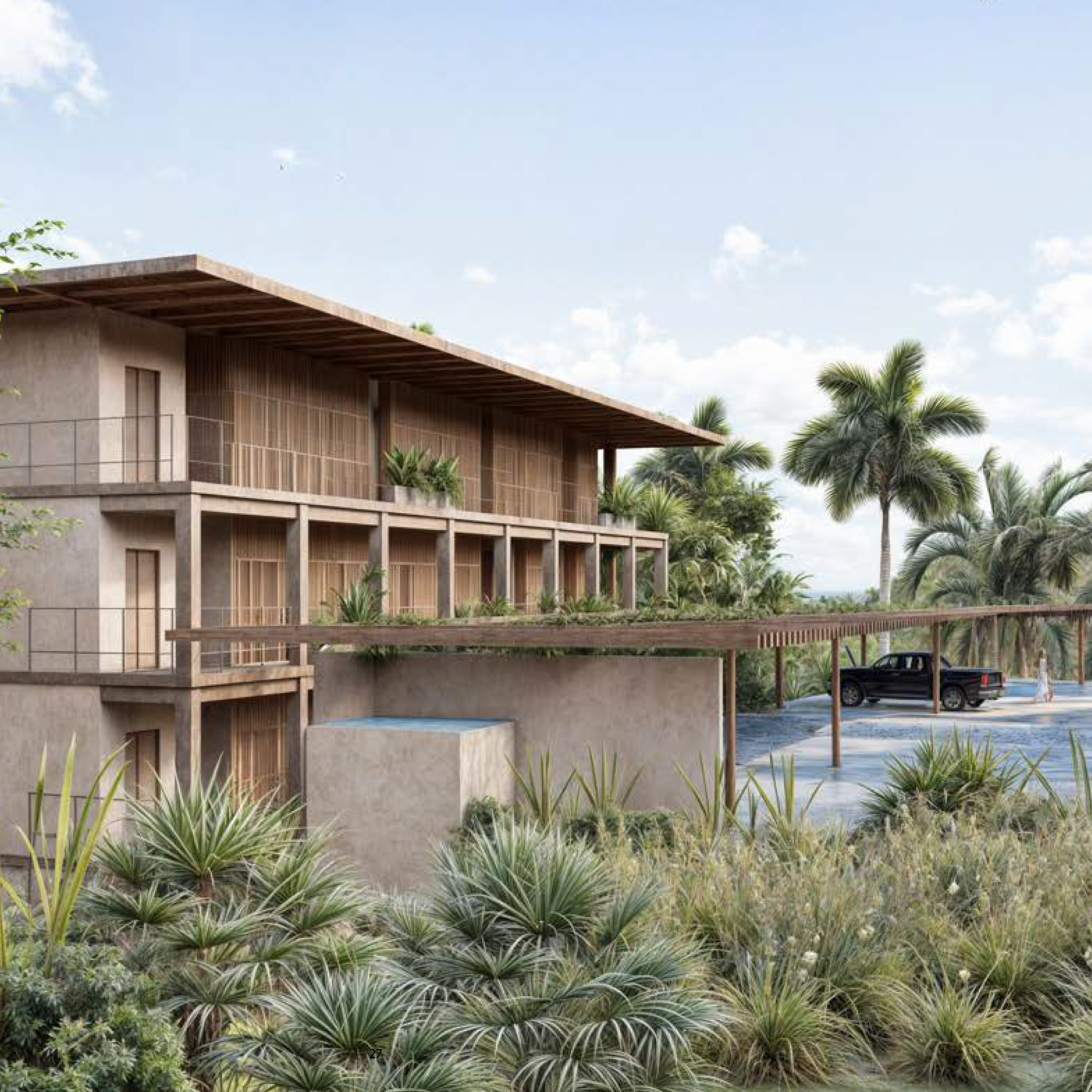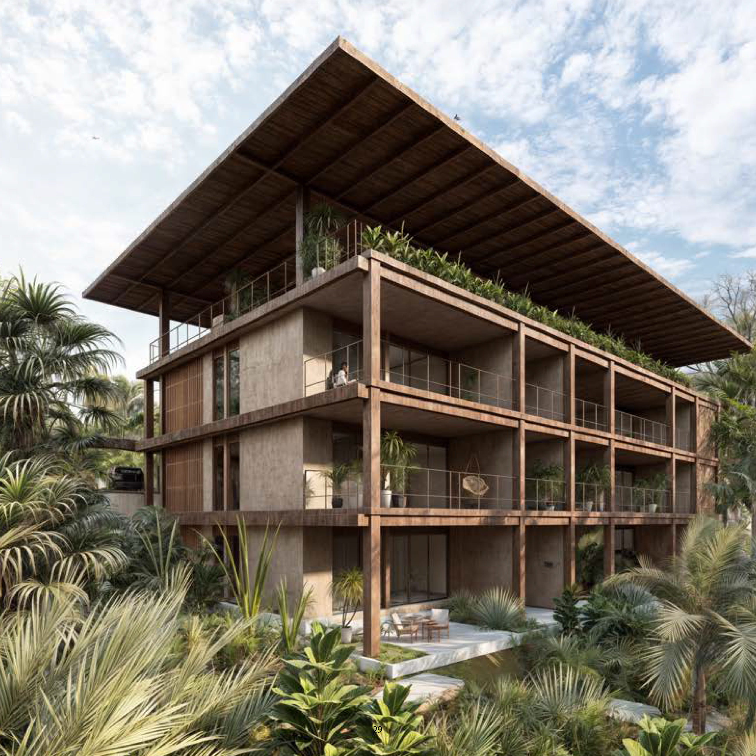 The design integrates a rear corridor that connects to a shared outdoor patio, which cools the air before it enters the building, creating a naturally regulated microclimate. Centralized utilities and grouped wet areas further optimize the building’s efficiency, reducing construction complexity and environmental impact. Durable materials like concrete and natural wood were selected for their ability to withstand the test of time while requiring minimal maintenance. These materials also enhance the building’s aesthetic, blending seamlessly with the surrounding landscape. Los Nidos is more than just a place to live—it is a model of sustainable and practical design, providing residents with a home that balances beauty, functionality, and respect for the environment.