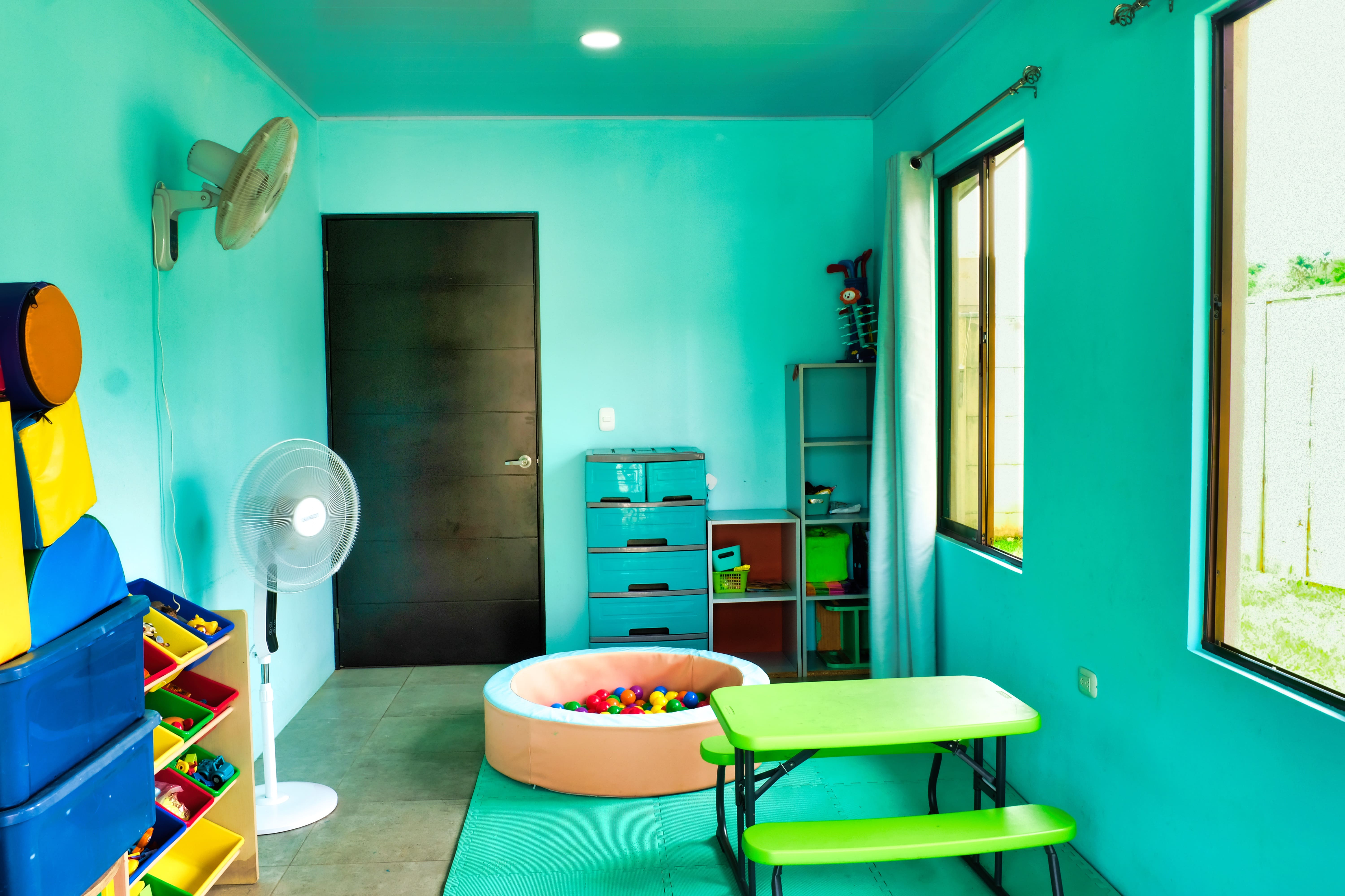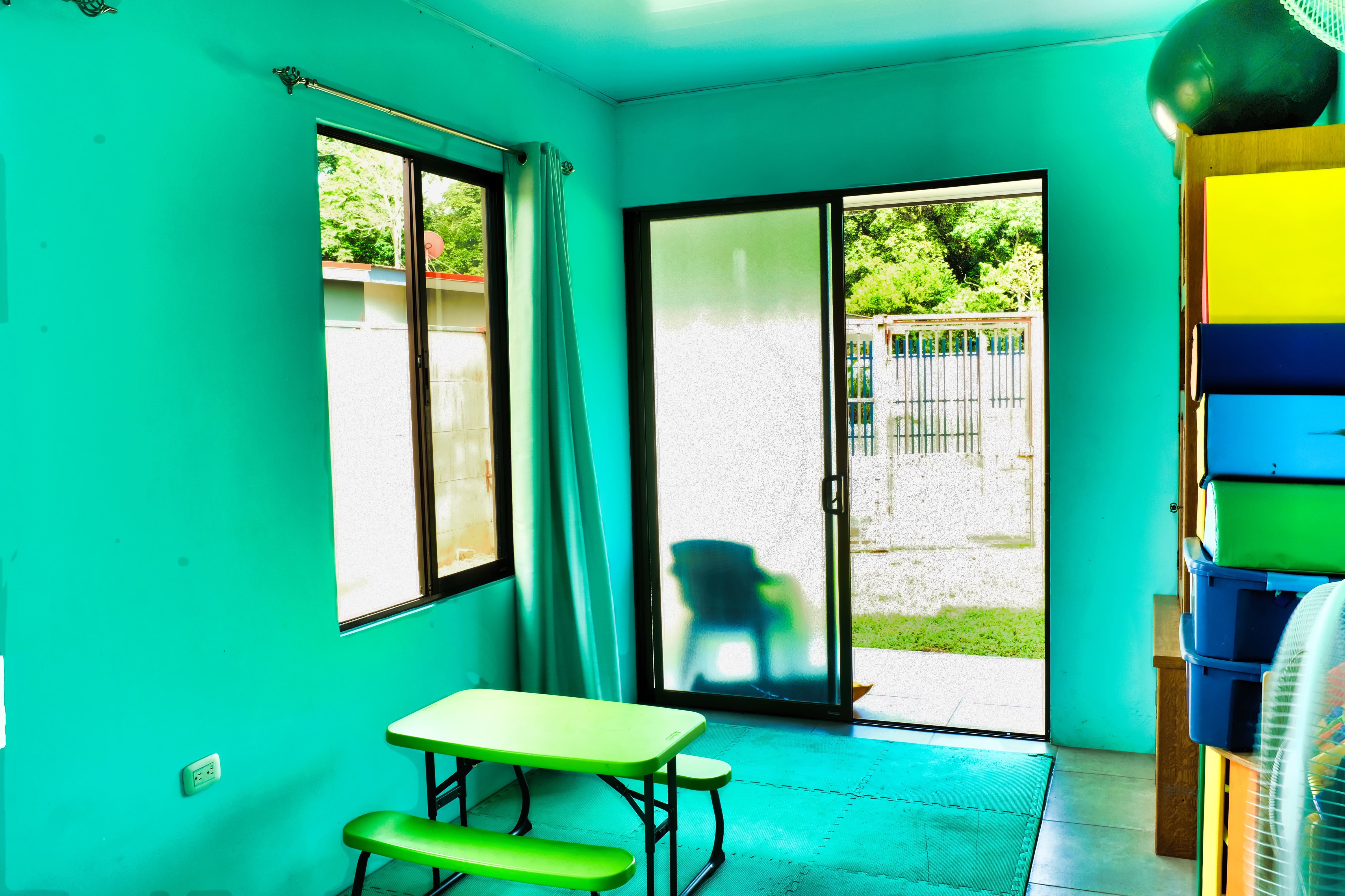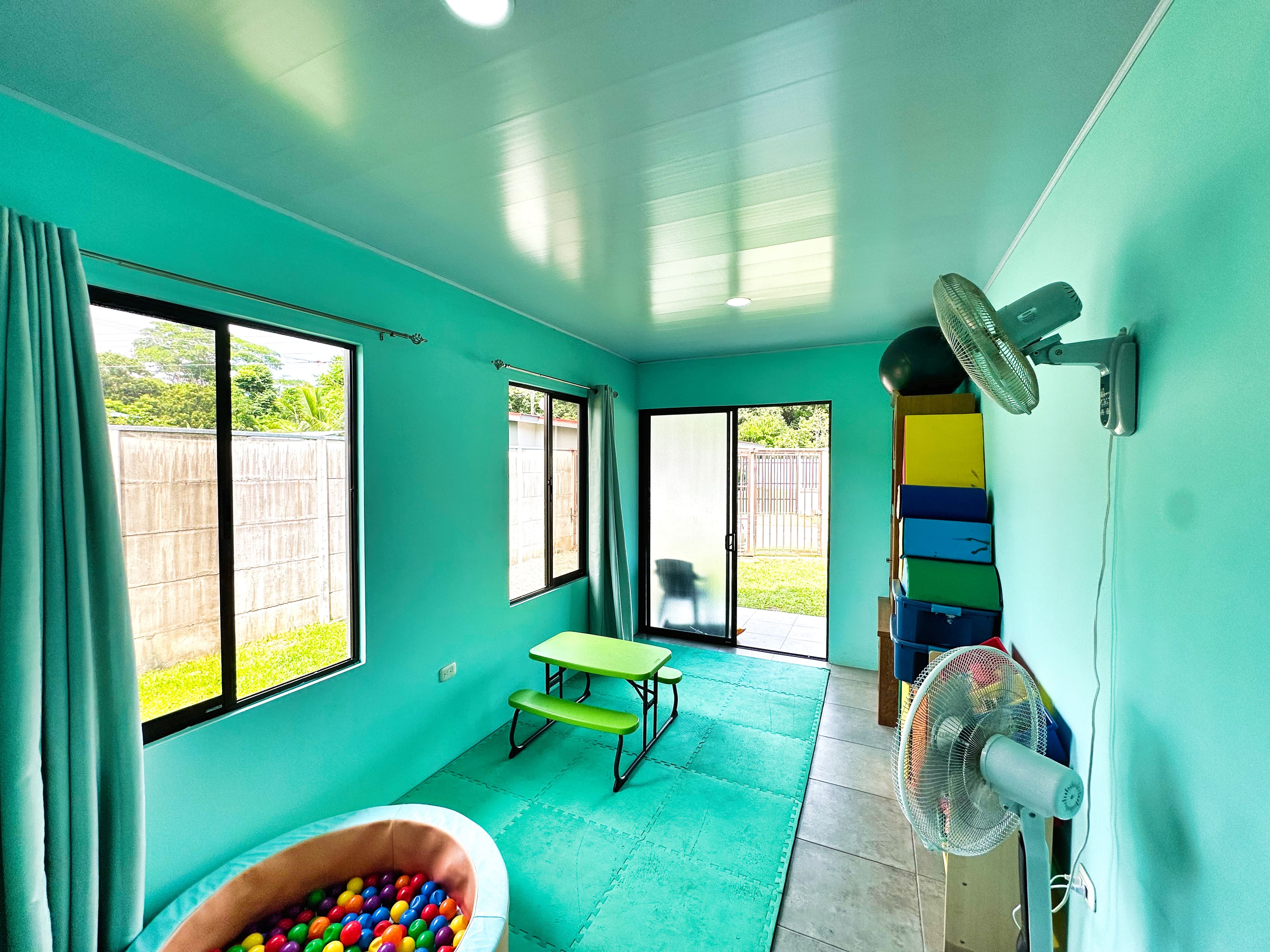 Spanning 646 square feet on a generous 275-square-meter lot, the residence features durable construction with high aluminum frames, ensuring longevity and low maintenance in the tropical climate. Step inside to find a versatile living area currently utilized as an educational space for children with special needs—easily convertible back to a cozy living room for relaxation or entertaining. The well-appointed kitchen boasts essential appliances, including a refrigerator, stove, and oven, complemented by a practical island with a non-granite countertop, perfect for meal prep or casual dining.