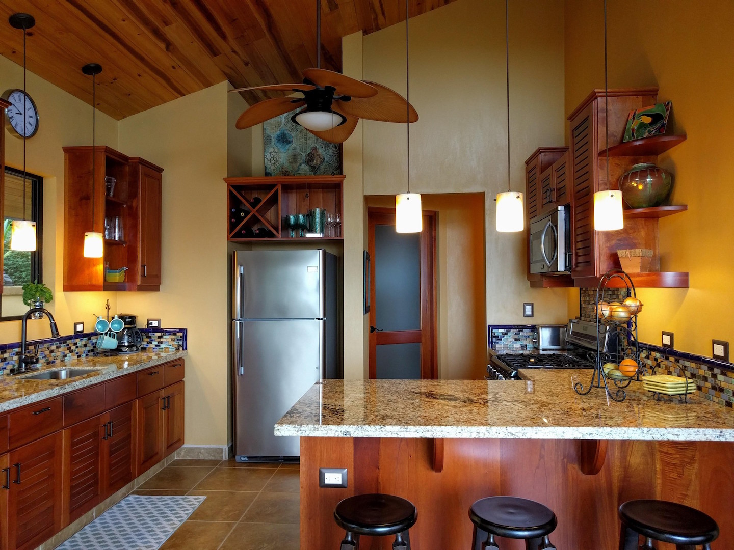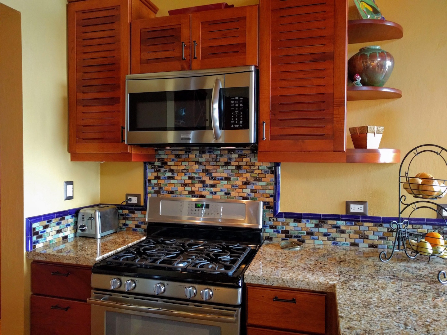 This 2015 custom built casita comes fully furnished and turnkey. You’ll feel like you’ve traveled to a Caribbean paradise in every part of the 1,000 square foot casita, starting with the courtyard. The private front courtyard features some seating in the shade, where you can enjoy the water fountain and gardens. It features ocean views from every room, with many large windows to bring in natural light and the ocean breeze. It also includes high golden pine ceilings and locally made hardwood cabinets. The open concept kitchen and living room open up to the back terrace. The kitchen features granite countertops and a granite island with bar stool seating. It also features hand-crafted Italian tile backsplash, Alabaster pendant lighting, and Frigidaire stainless steel appliances.