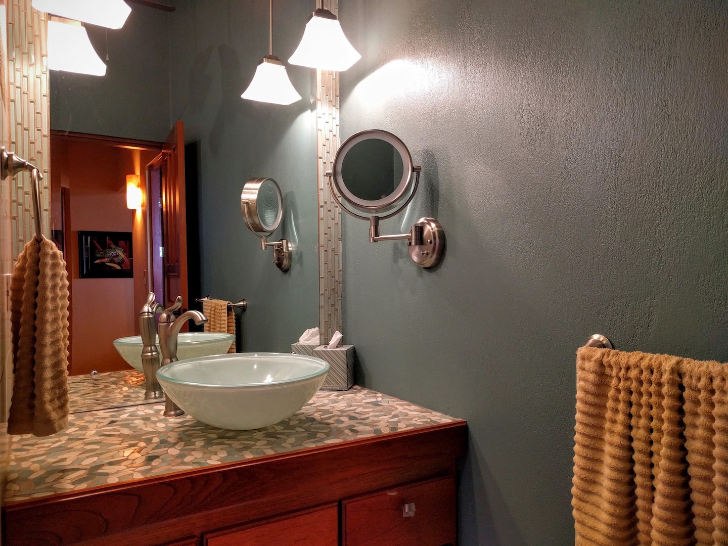The bedroom features a queen bed frame with high-quality linens. The window seat is ideal for reading a good book and hearing the ocean waves. The bedroom also features a dehumidified walk-in closet and an en-suite bathroom with a walk-in shower. Only the bedroom has air conditioning, but the rest of the rooms have ceiling fans. Between the ceiling fans and the number of windows, the casita gets quality airflow.