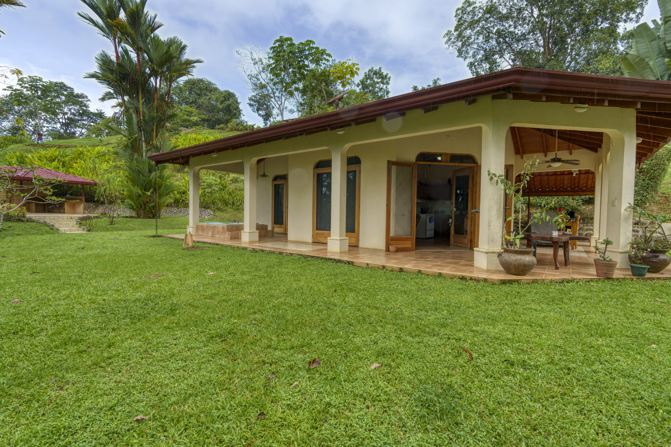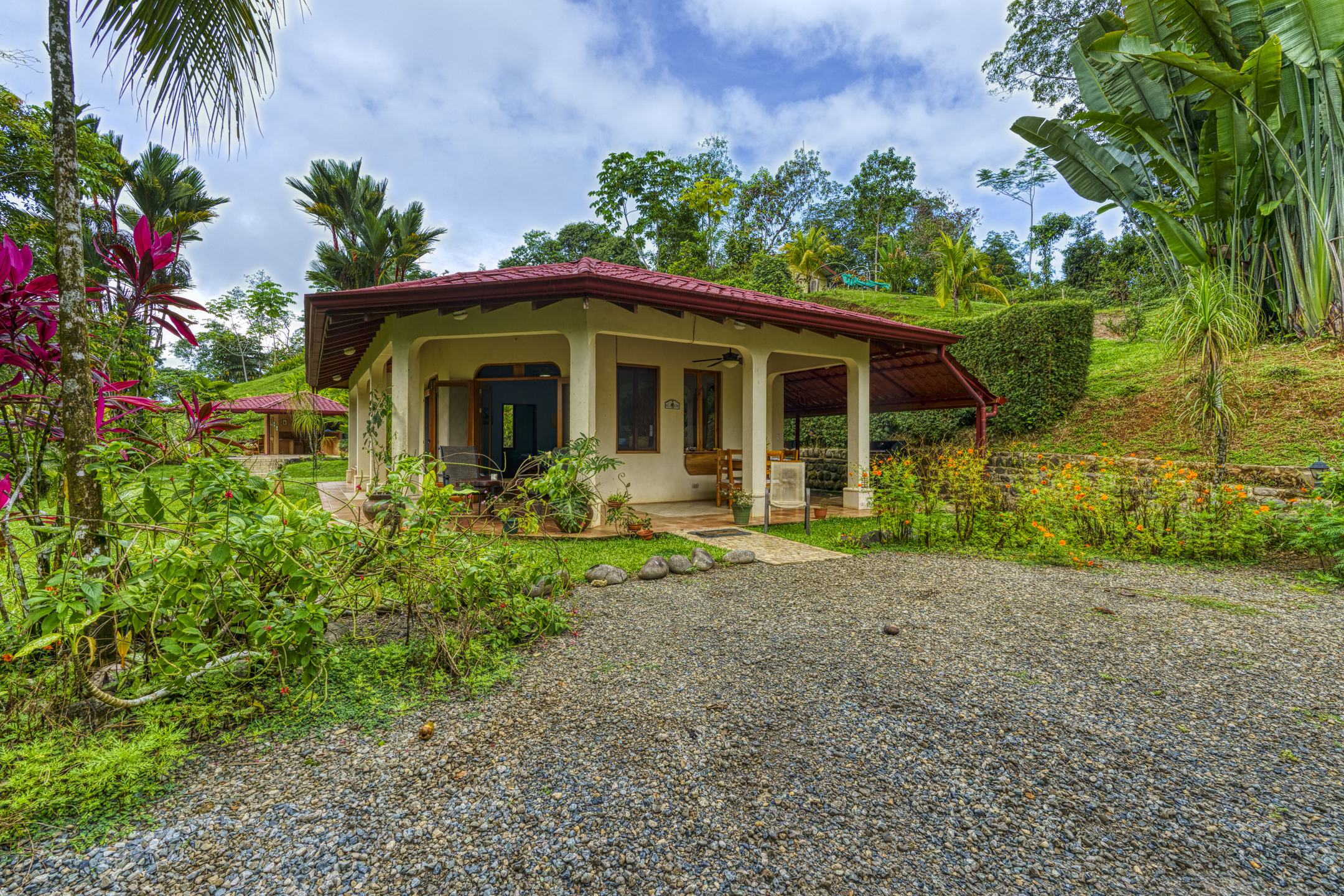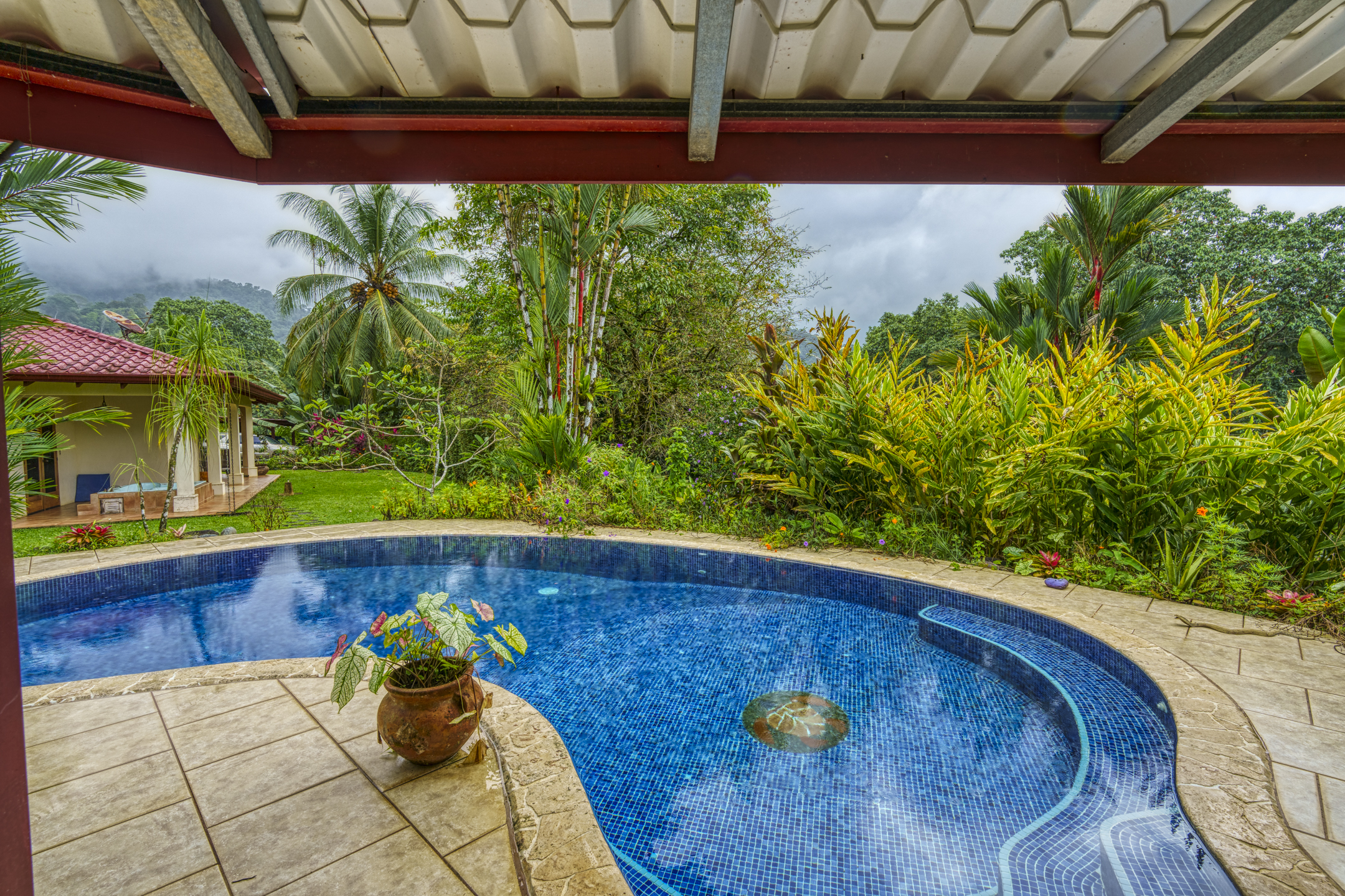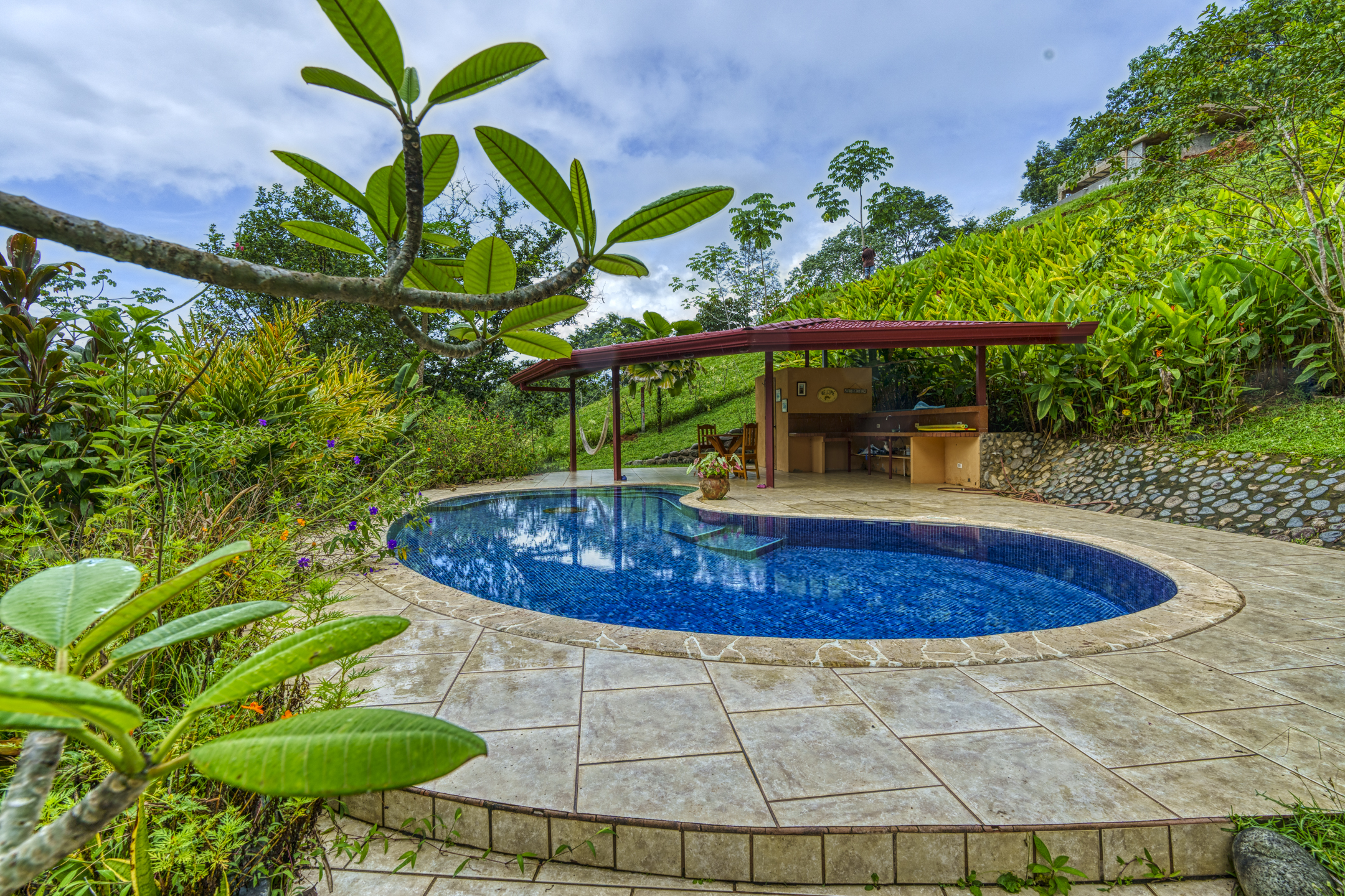 Fall in love with this 1bed, 1bath home with room to expand. This beautiful villa is located in a gated community, up the mountain in Ojochal. Owners will enjoy a spectacular jungle and mountain view that will make you smile each day! Property features a sparkling swimming pool, with a large patio and outdoor kitchen area - great for entertaining! Grounds are meticulously maintained and on it, you will find things such as water apples, guava, cinnamon, and more! Inside is open and spacious and features high wood ceilings, lots of windows for natural light and plenty of ceiling fans. The bedroom is very roomy and is air-conditioned. Enjoy breakfast out on your patio enjoying the wonderful sounds of the jungle & the majestic views!
