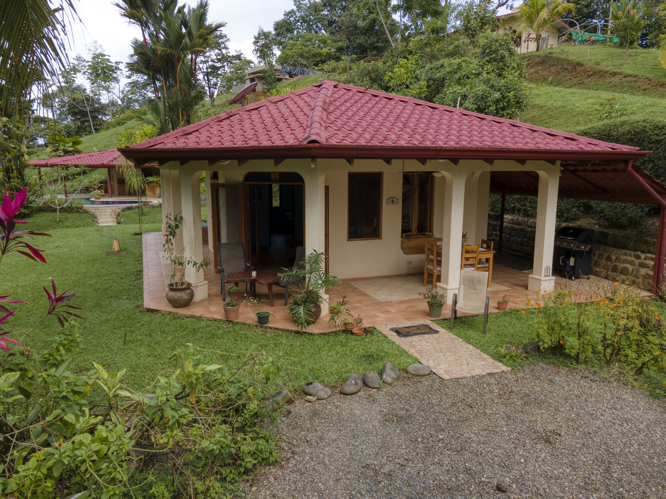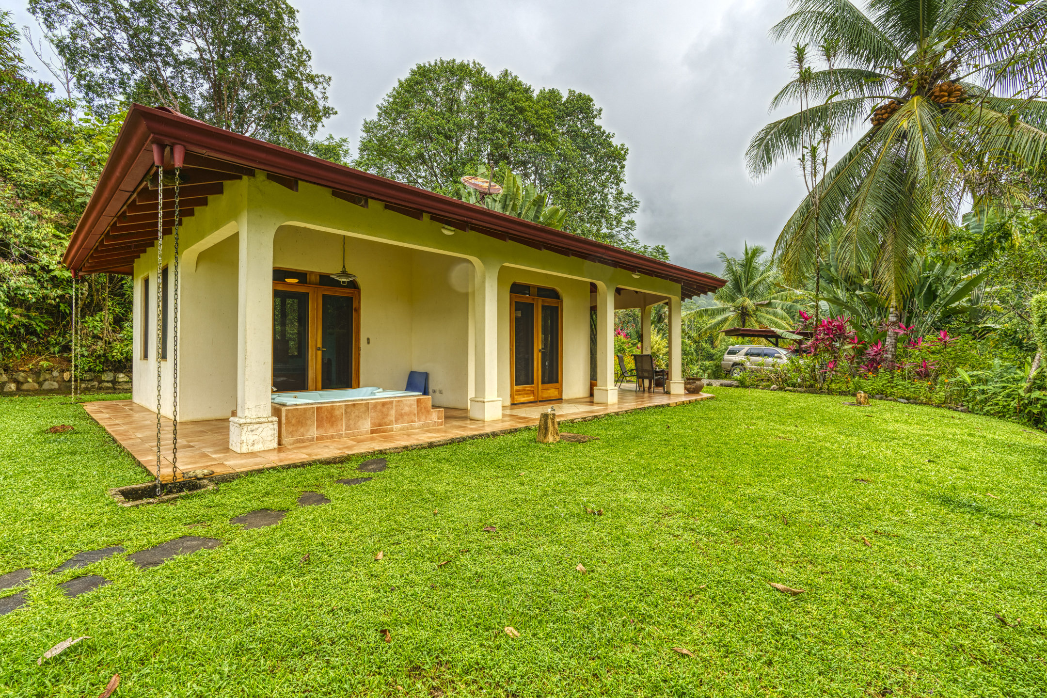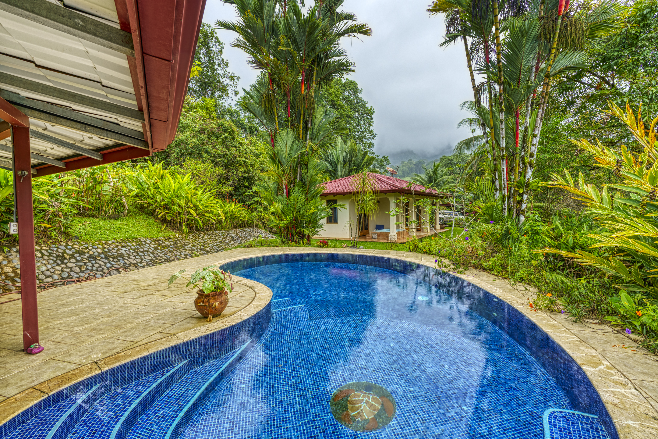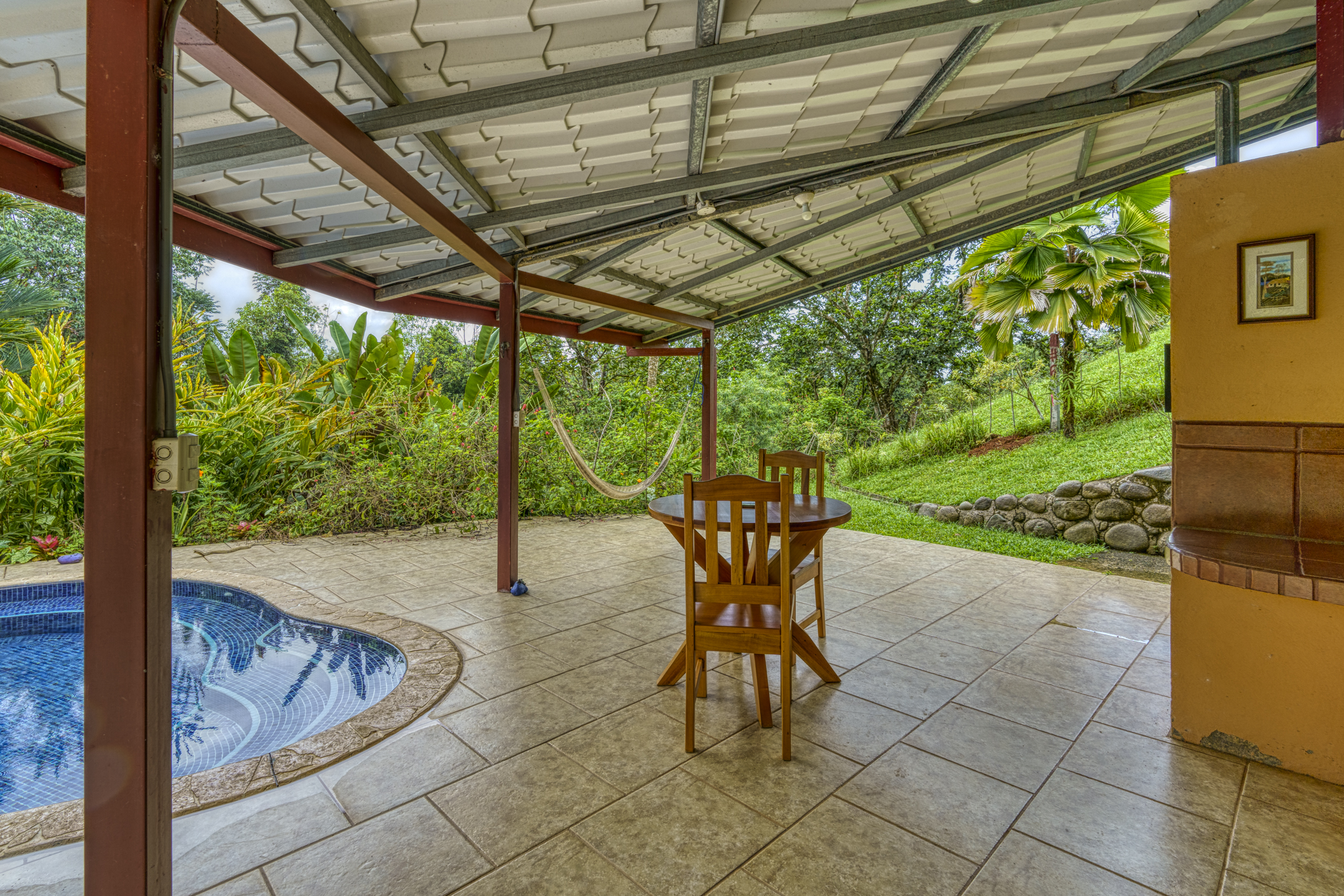 Fall in love with this 1bed, 1bath home with room to expand. This beautiful villa is located in a gated community, up the mountain in Ojochal. Owners will enjoy a spectacular jungle and mountain view that will make you smile each day! Property features a sparkling swimming pool, with a large patio and outdoor kitchen area - great for entertaining! Grounds are meticulously maintained and on it, you will find things such as water apples, guava, cinnamon, and more! Inside is open and spacious and features high wood ceilings, lots of windows for natural light and plenty of ceiling fans. The bedroom is very roomy and is air-conditioned. Enjoy breakfast out on your patio enjoying the wonderful sounds of the jungle & the majestic views!