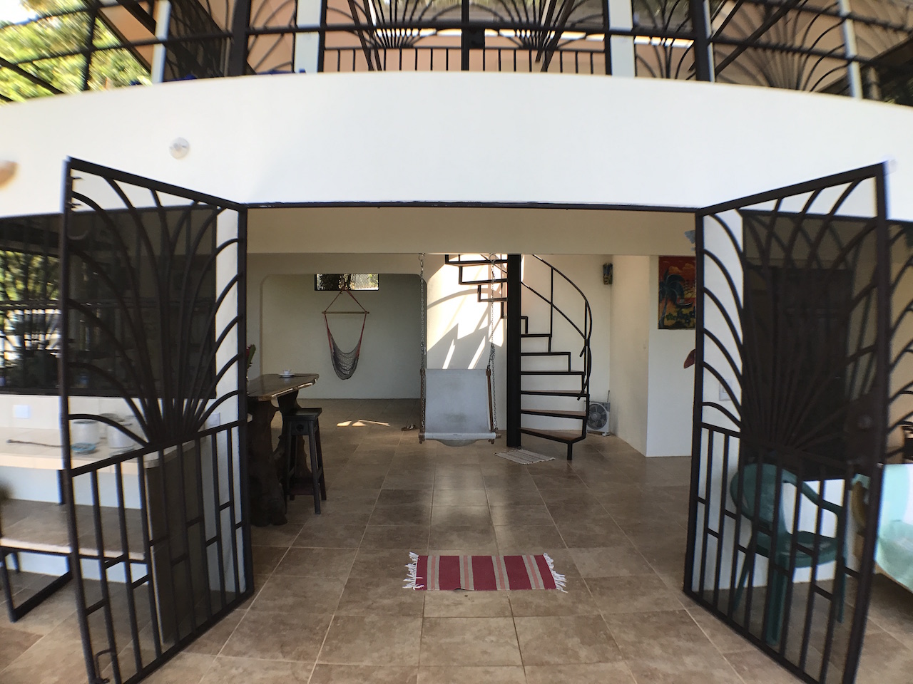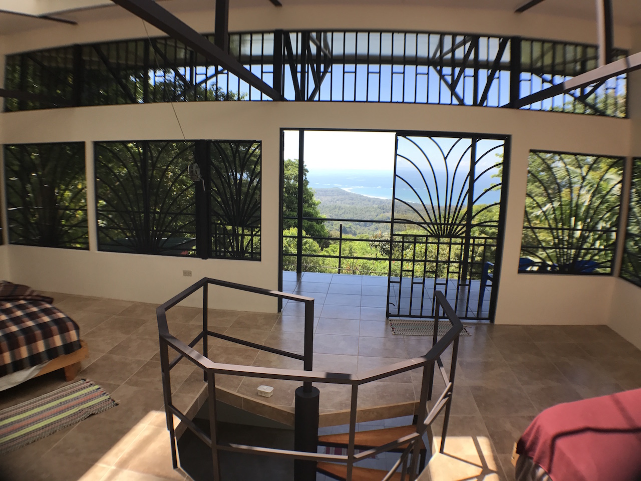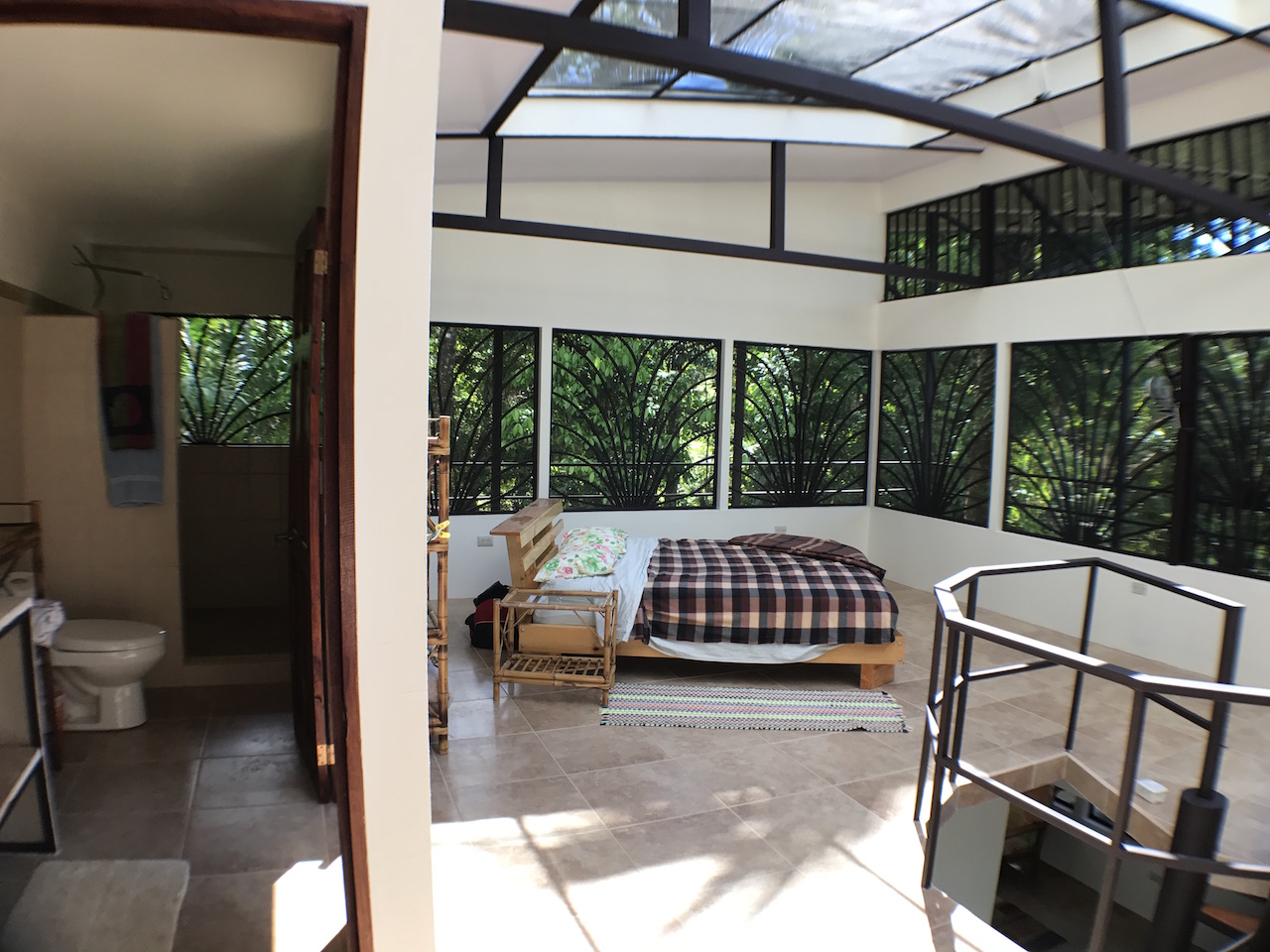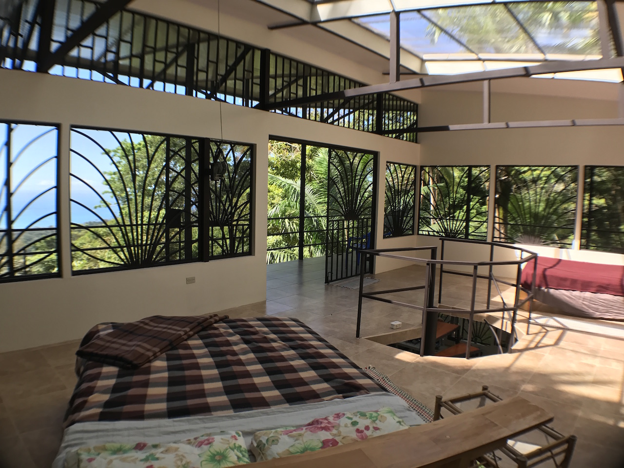 Up the spiral staircase is the upstairs bedroom, which is currently one large open room with a full bathroom. This area is large enough to create 2 separate bedrooms or an office/bedroom space. The surrounding rainforest and ocean view is enjoyed easily through the double doors which open onto the wrap around deck. For true nature lovers, the roof retracts to open up the sky light for those who dream of sleeping under the stars while living in the Costa Rican rainforest.