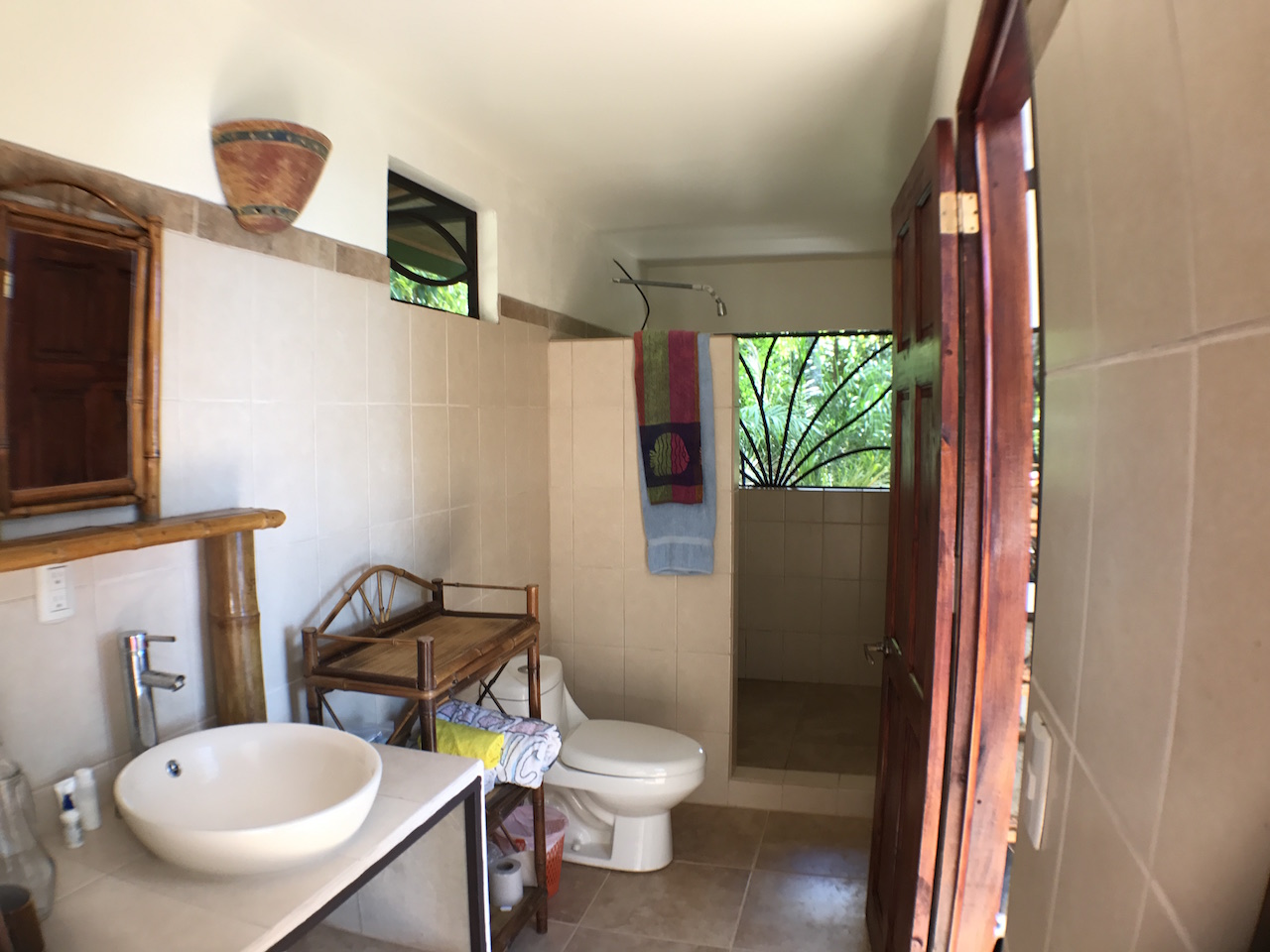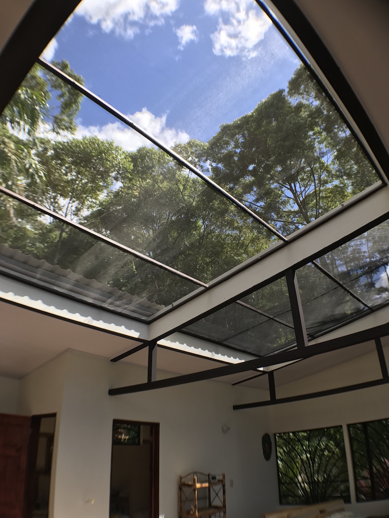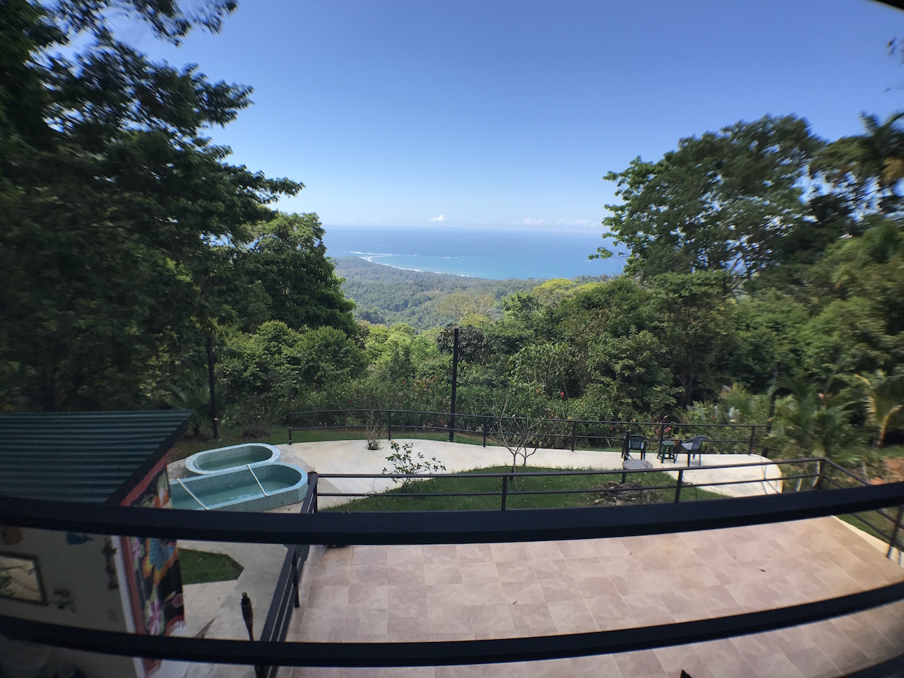 Up the spiral staircase is the upstairs bedroom, which is currently one large open room with a full bathroom. This area is large enough to create 2 separate bedrooms or an office/bedroom space. The surrounding rainforest and ocean view is enjoyed easily through the double doors which open onto the wrap around deck. For true nature lovers, the roof retracts to open up the sky light for those who dream of sleeping under the stars while living in the Costa Rican rainforest.