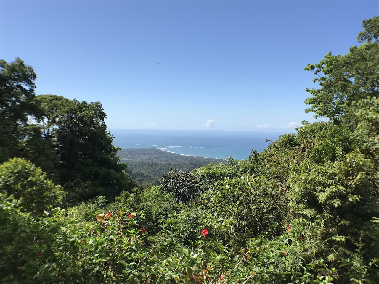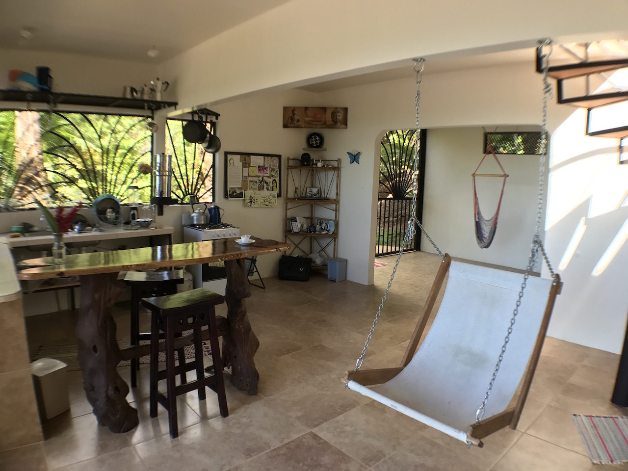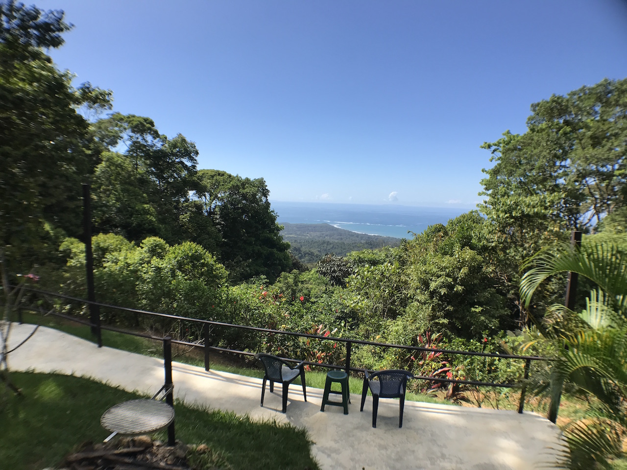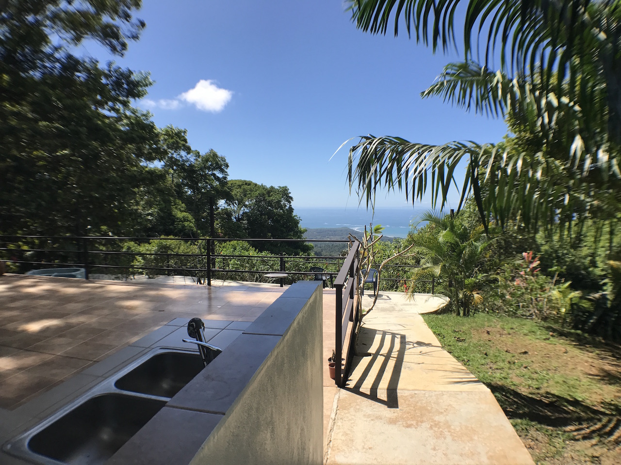 Up the spiral staircase is the upstairs bedroom, which is currently one large open room with a full bathroom. This area is large enough to create 2 separate bedrooms or an office/bedroom space. The surrounding rainforest and ocean view is enjoyed easily through the double doors which open onto the wrap around deck. For true nature lovers, the roof retracts to open up the sky light for those who dream of sleeping under the stars while living in the Costa Rican rainforest.