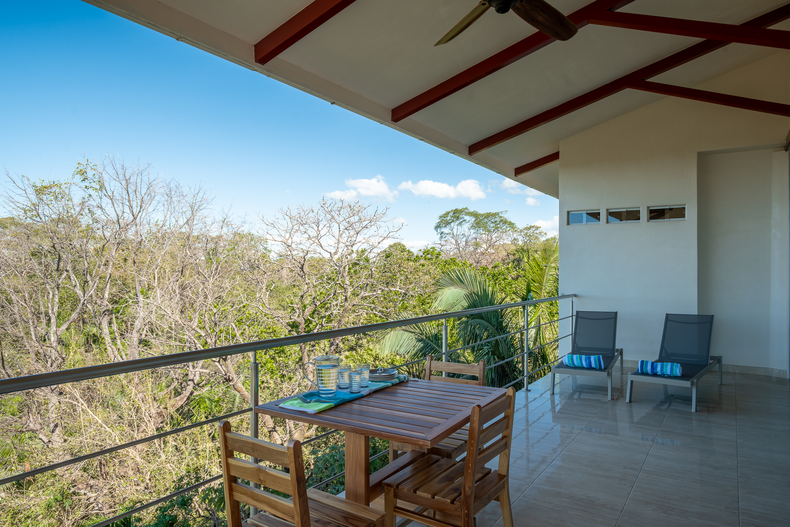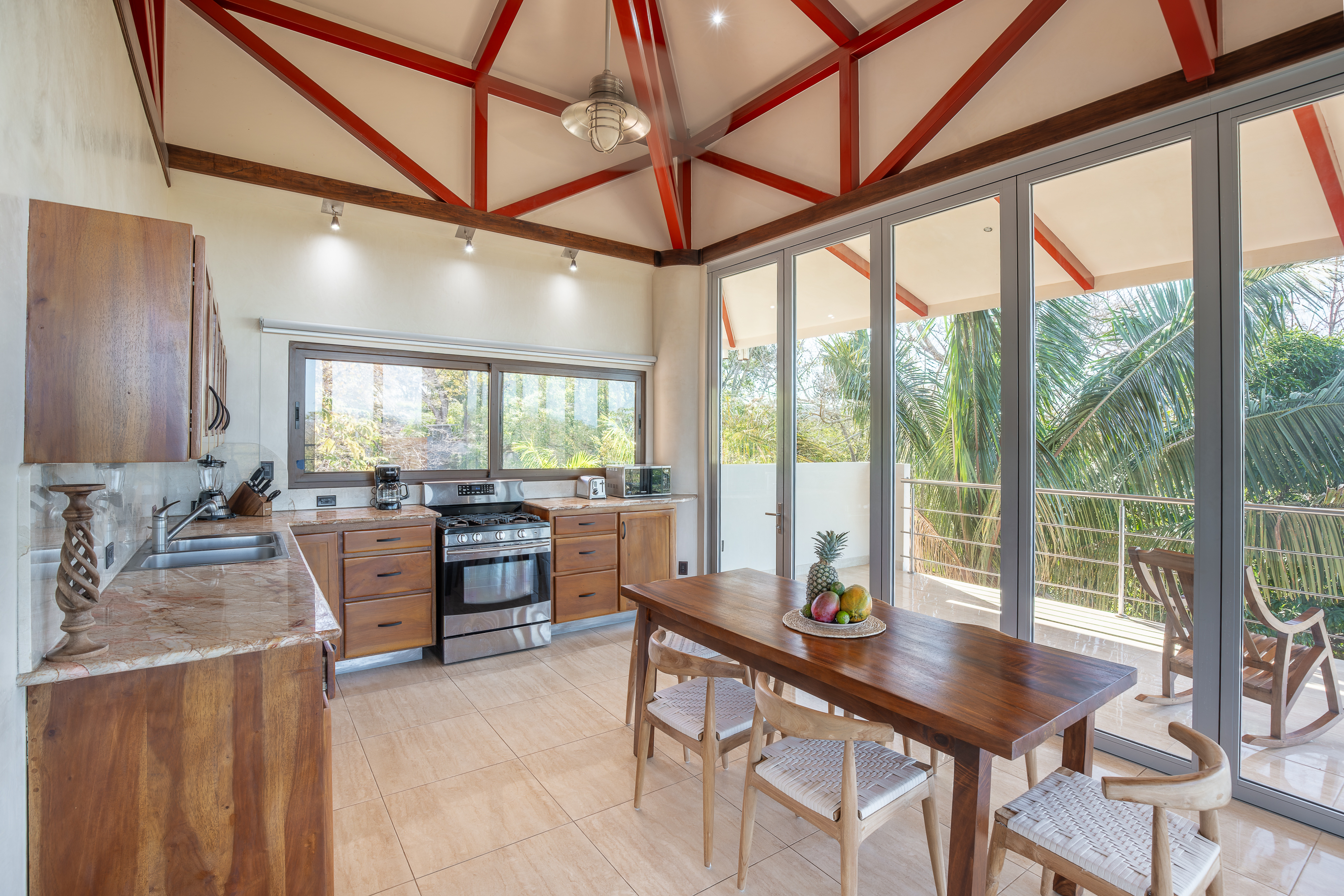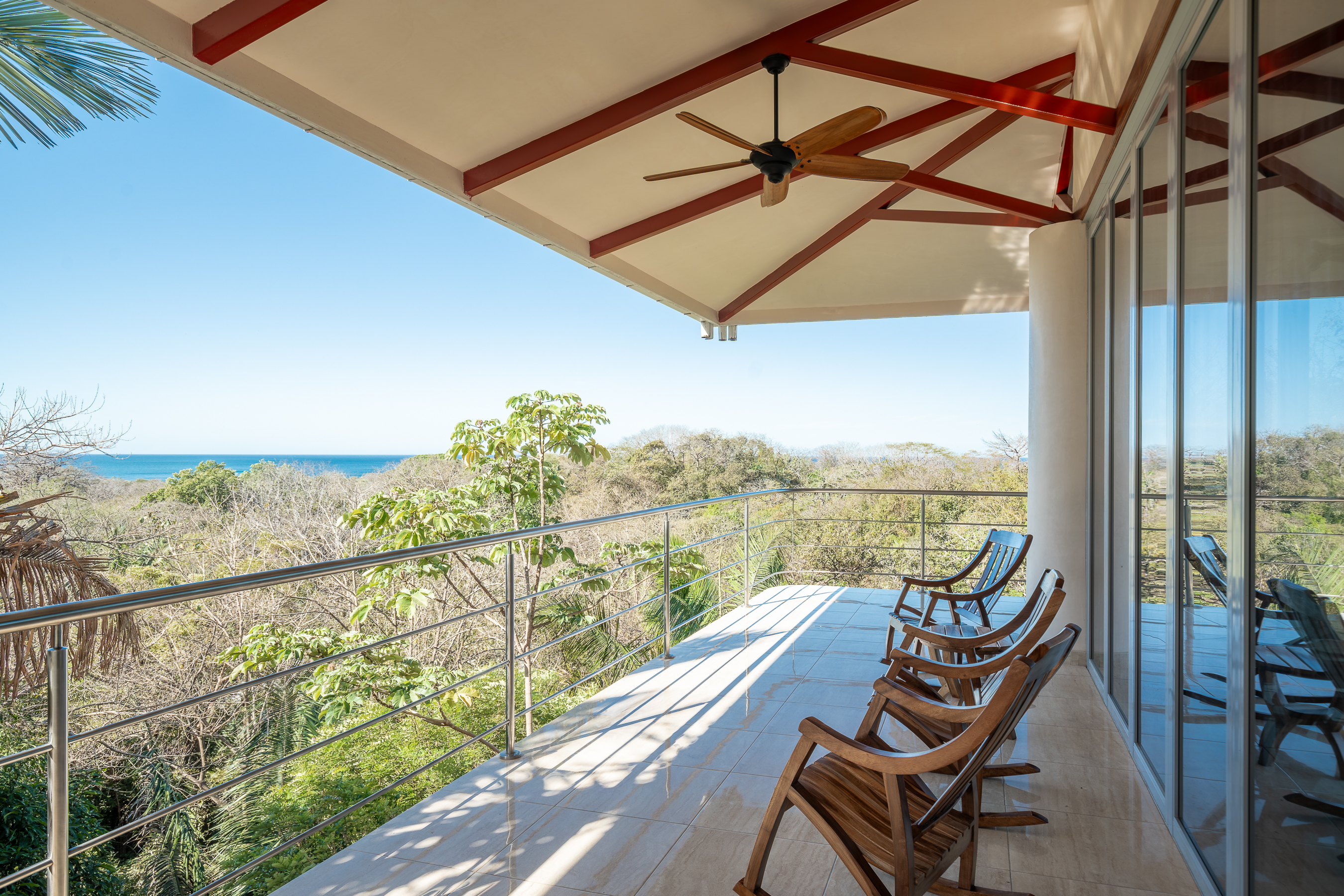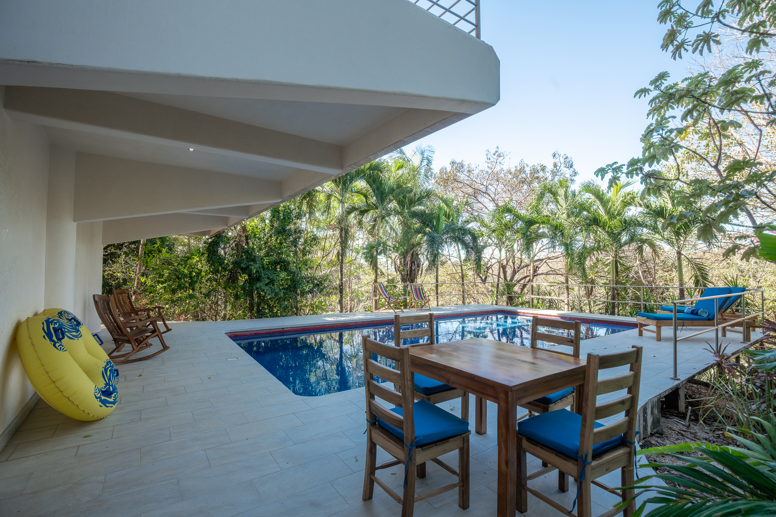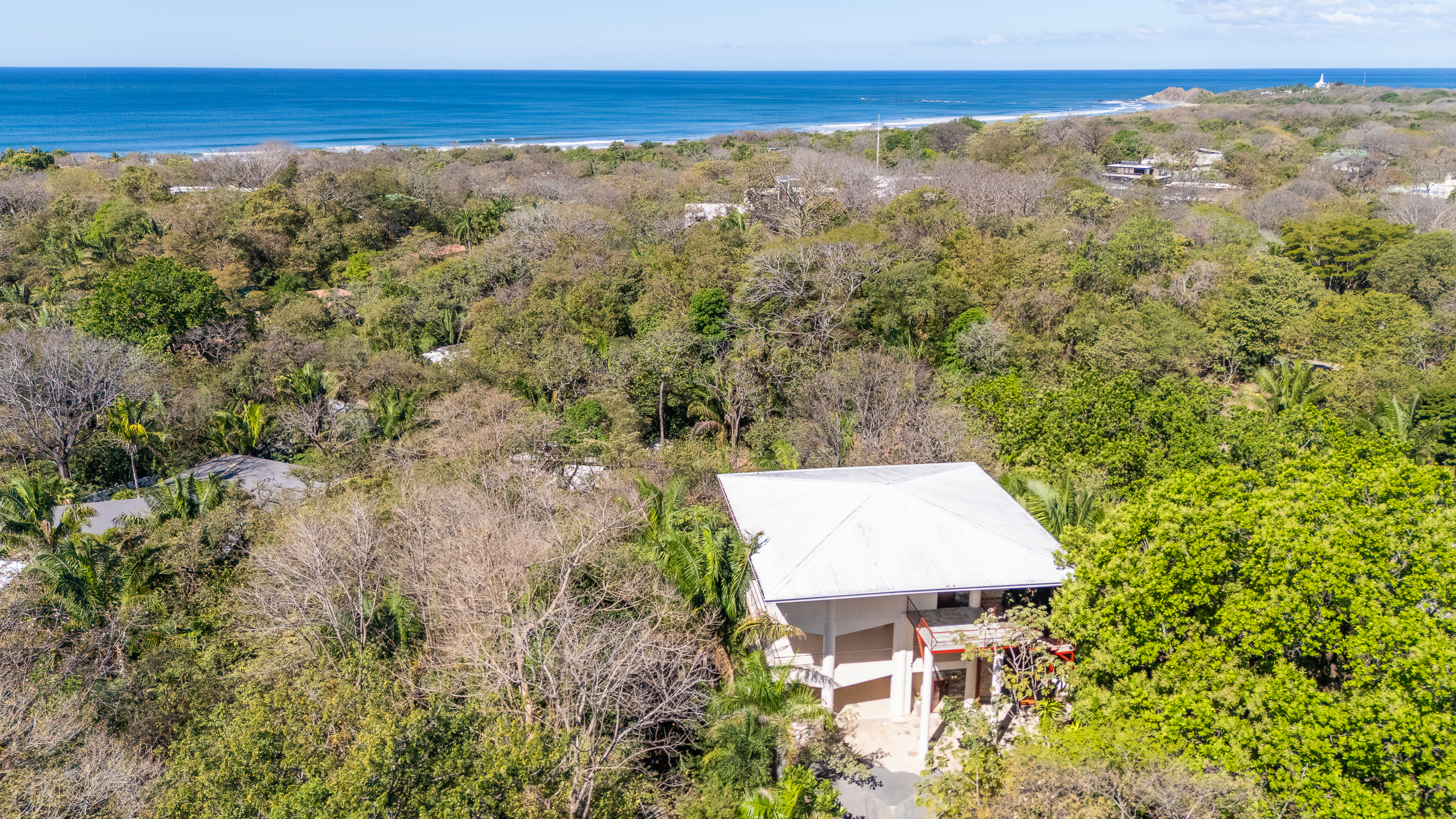 Stunning ocean views are yours from the contemporary-styled, quiet, elevated and breezy, Sky House at Kahakai in Nosara's K-Section. Located on one of the largest lots in the K-Section, the floor to ceiling glass nana-walls open to unobstructed views of mature jungle trees frequented by monkeys and abundant birdlife. Enjoy tranquil surroundings, far from street noise, yet walking distance to the Baker's Beach entrance of Playa Guiones. With a bicycle, ATV, or golf cart, you can easily access Main Street or North Guiones on backroads for shopping and restaurants without the need to cross or use the Highway; and for those who enjoy long walks, the well-known and scenic jungle trails, and the beach, can be used to discover the various neighborhoods, each offering a distinct personality; or, explore the tide pools and the tranquil beaches of south Guiones. Aside from the ease of enjoying all that Nosara has to offer, guests may find the Sky House to be a destination in itself -- sunsets are spectacular from the terrace, wildlife viewing is enhanced by the adjacent undisturbed and undeveloped lot, and the 5 x 10 meter swimming pool is perfect for relaxing or swimming laps. The Sky House is equipped with a king-size bed and is well-suited for an active couple looking for a spectacular living space in Nosara with easy access to Guiones Beach.