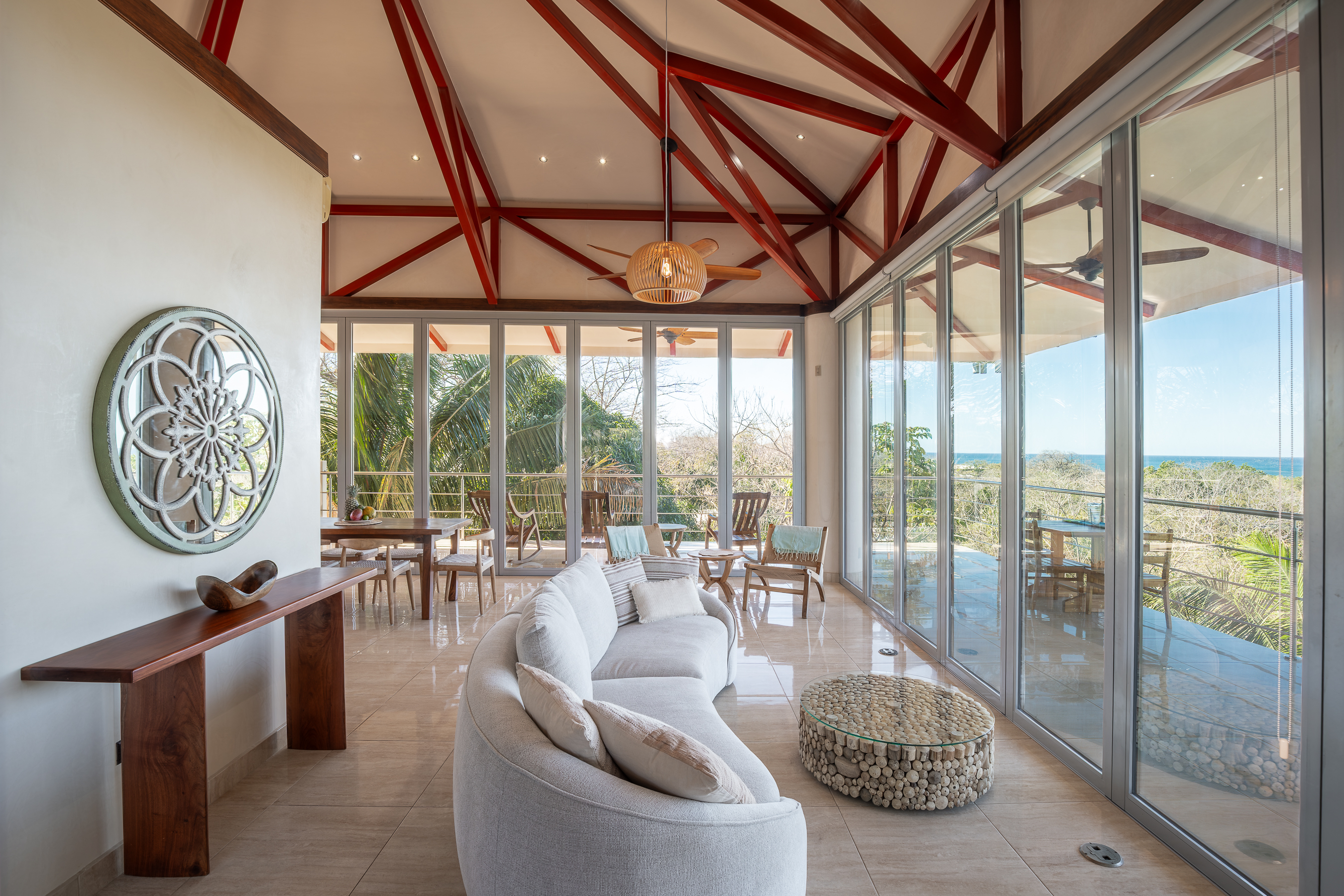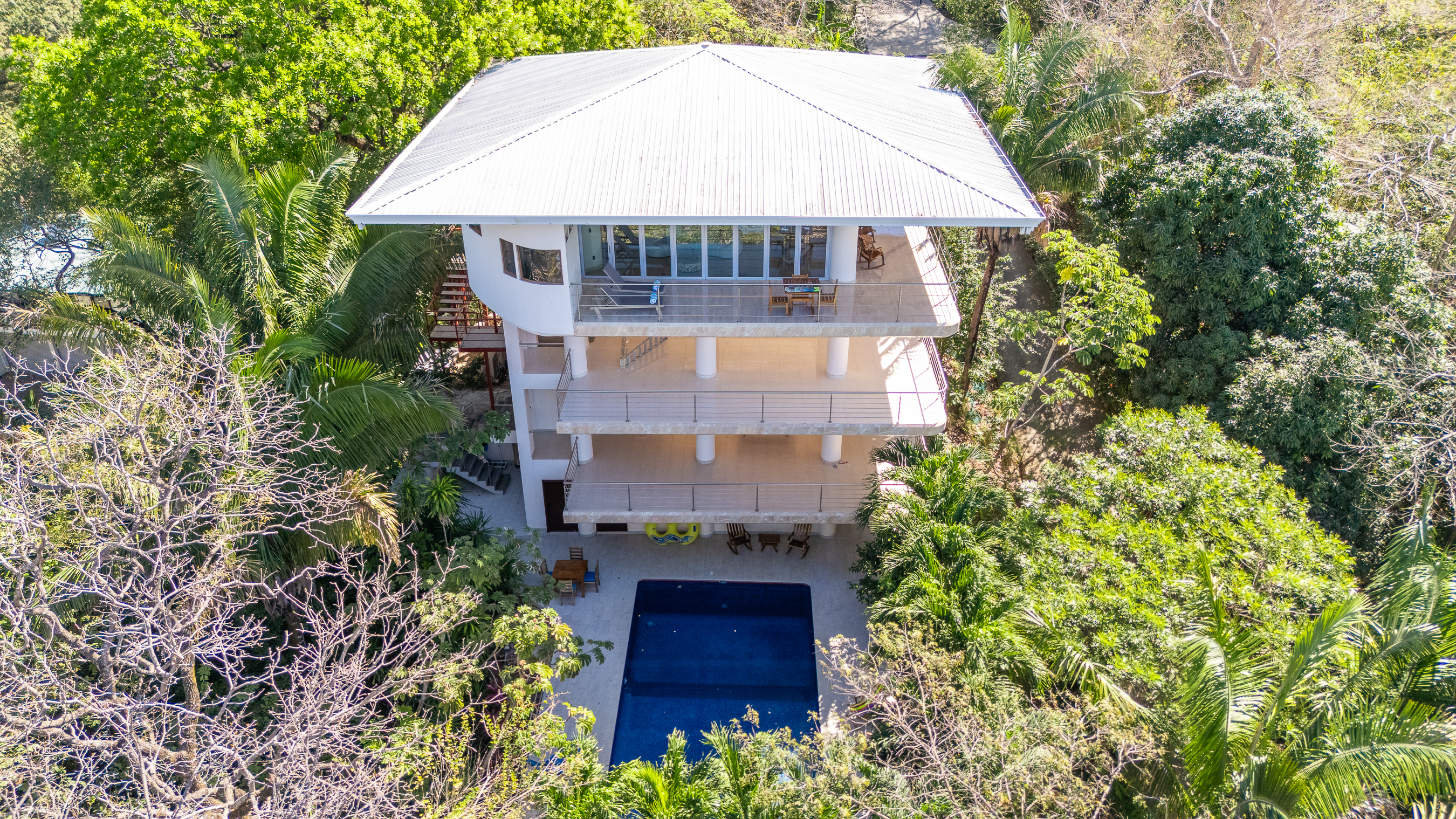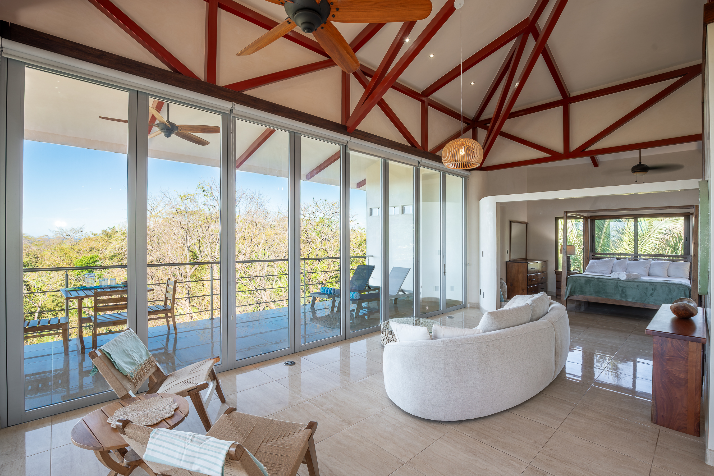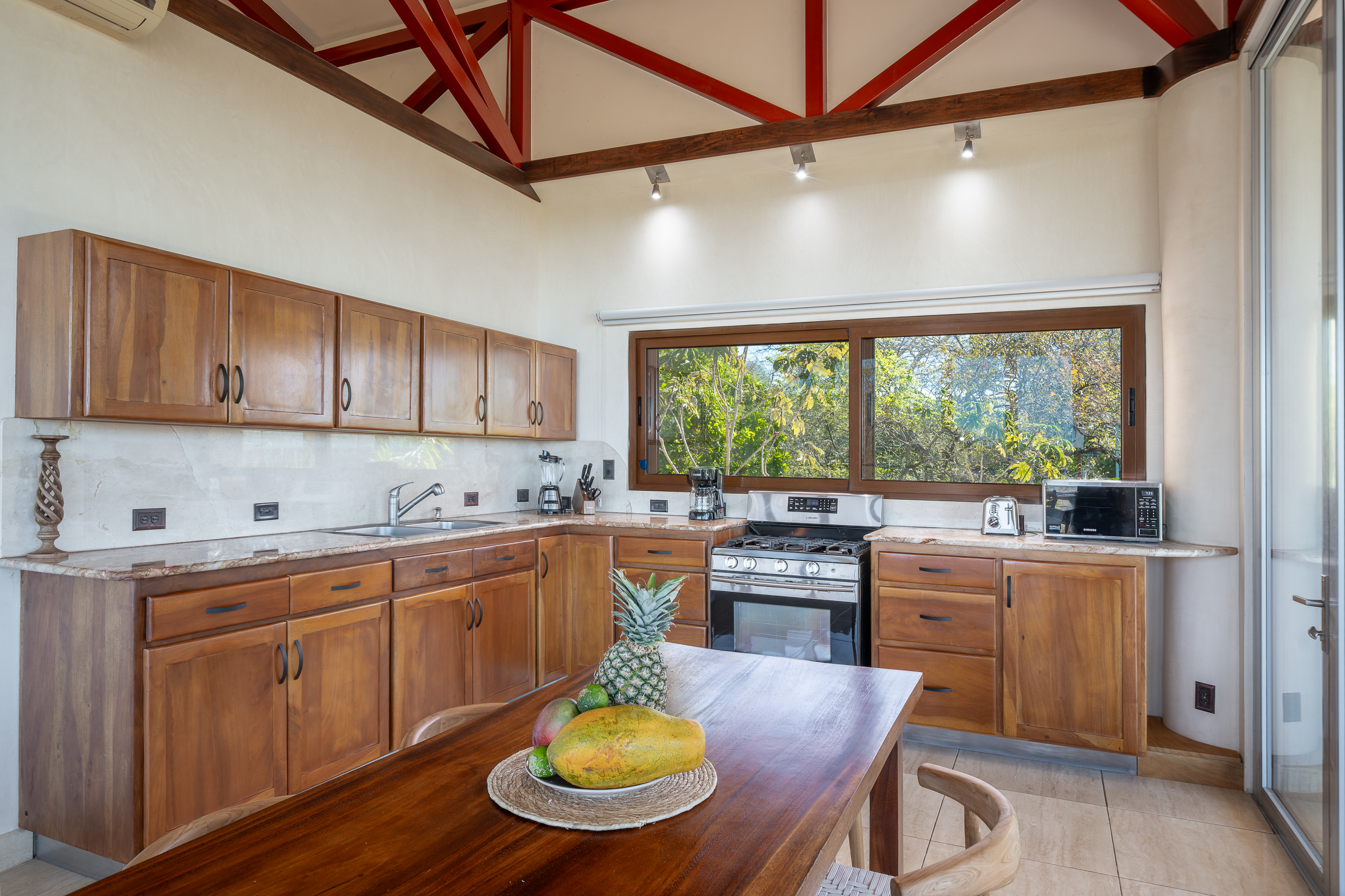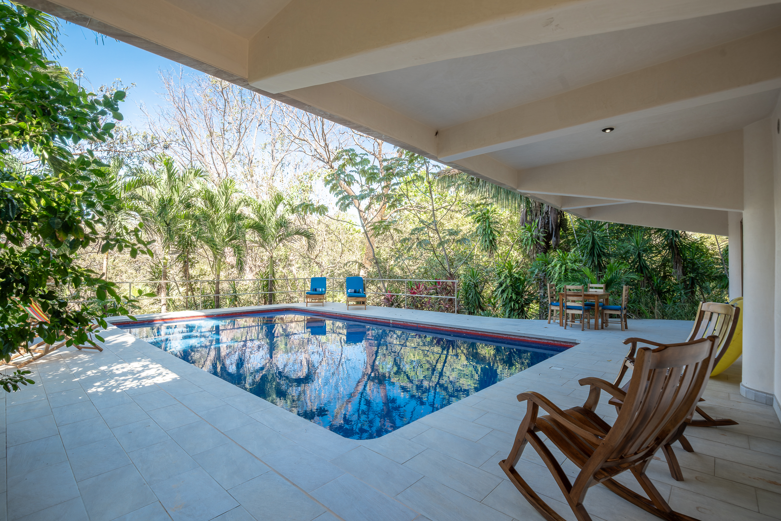 Stunning ocean views are yours from the contemporary-styled, quiet, elevated and breezy, Sky House at Kahakai in Nosara's K-Section. Located on one of the largest lots in the K-Section, the floor to ceiling glass nana-walls open to unobstructed views of mature jungle trees frequented by monkeys and abundant birdlife. Enjoy tranquil surroundings, far from street noise, yet walking distance to the Baker's Beach entrance of Playa Guiones. With a bicycle, ATV, or golf cart, you can easily access Main Street or North Guiones on backroads for shopping and restaurants without the need to cross or use the Highway; and for those who enjoy long walks, the well-known and scenic jungle trails, and the beach, can be used to discover the various neighborhoods, each offering a distinct personality; or, explore the tide pools and the tranquil beaches of south Guiones. Aside from the ease of enjoying all that Nosara has to offer, guests may find the Sky House to be a destination in itself -- sunsets are spectacular from the terrace, wildlife viewing is enhanced by the adjacent undisturbed and undeveloped lot, and the 5 x 10 meter swimming pool is perfect for relaxing or swimming laps. The Sky House is equipped with a king-size bed and is well-suited for an active couple looking for a spectacular living space in Nosara with easy access to Guiones Beach.