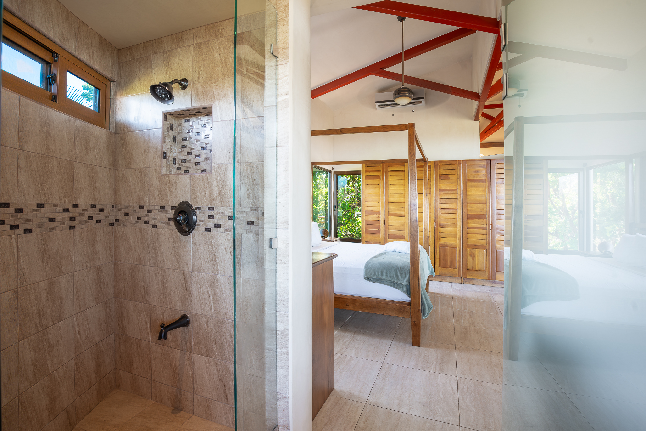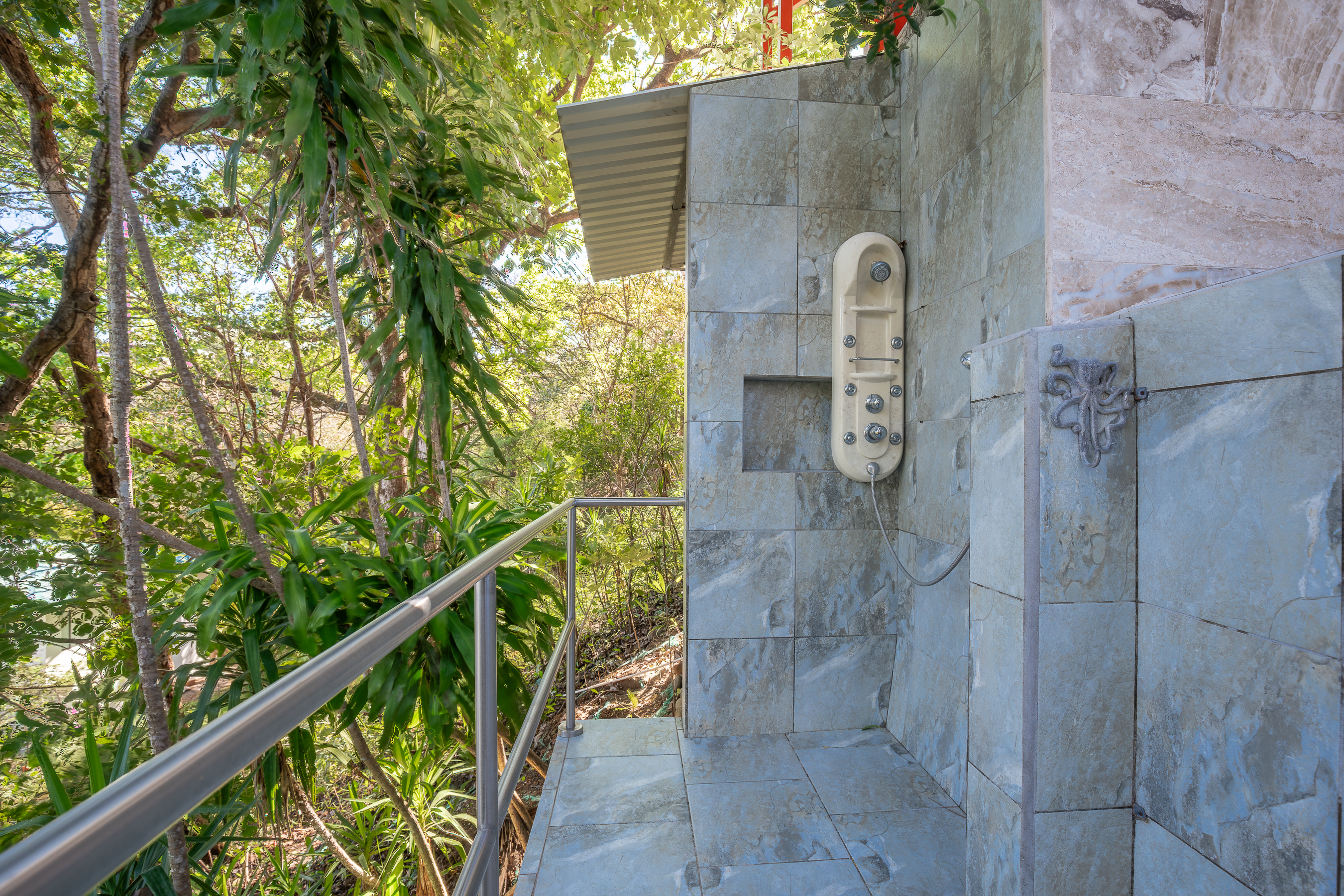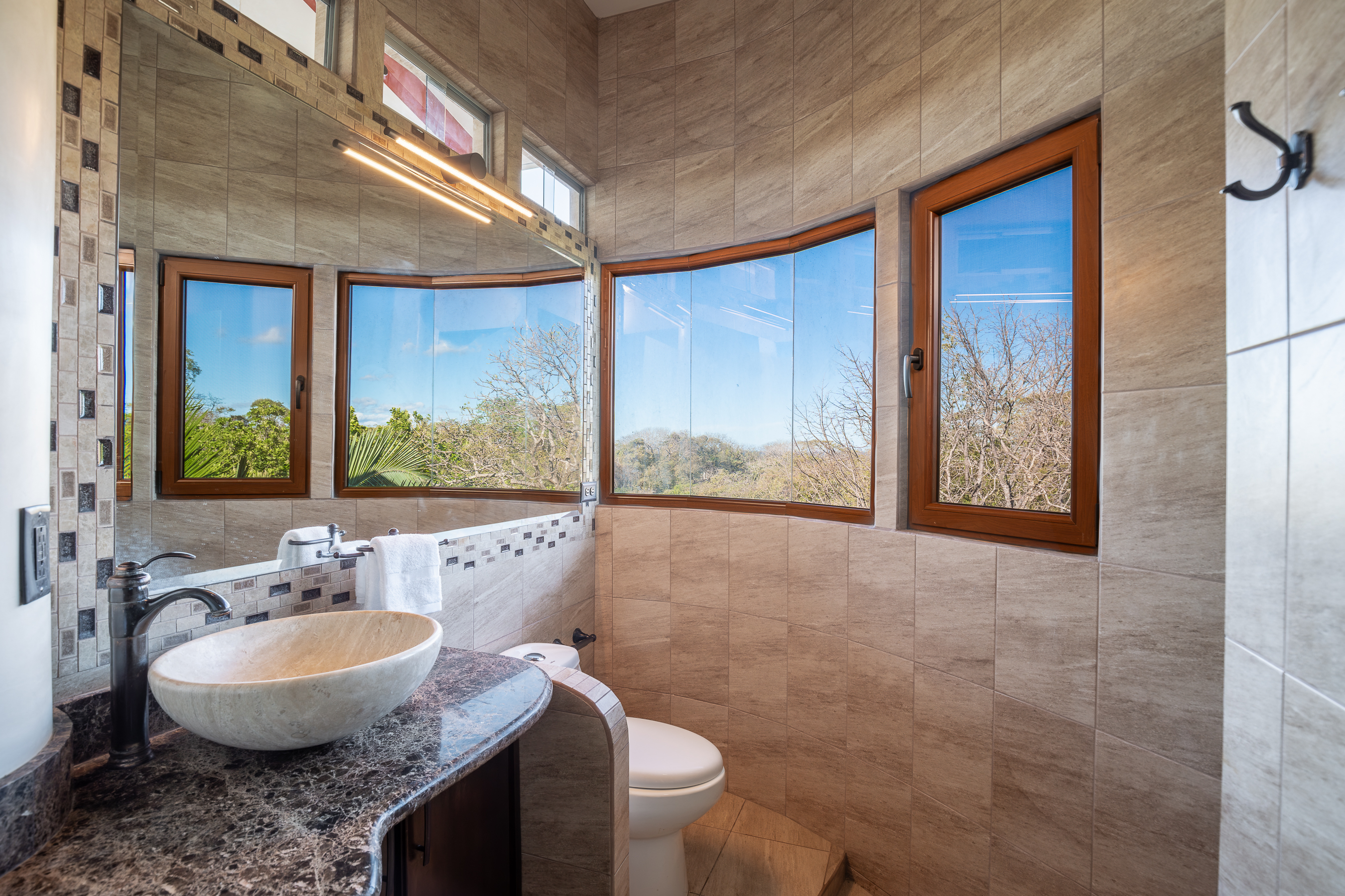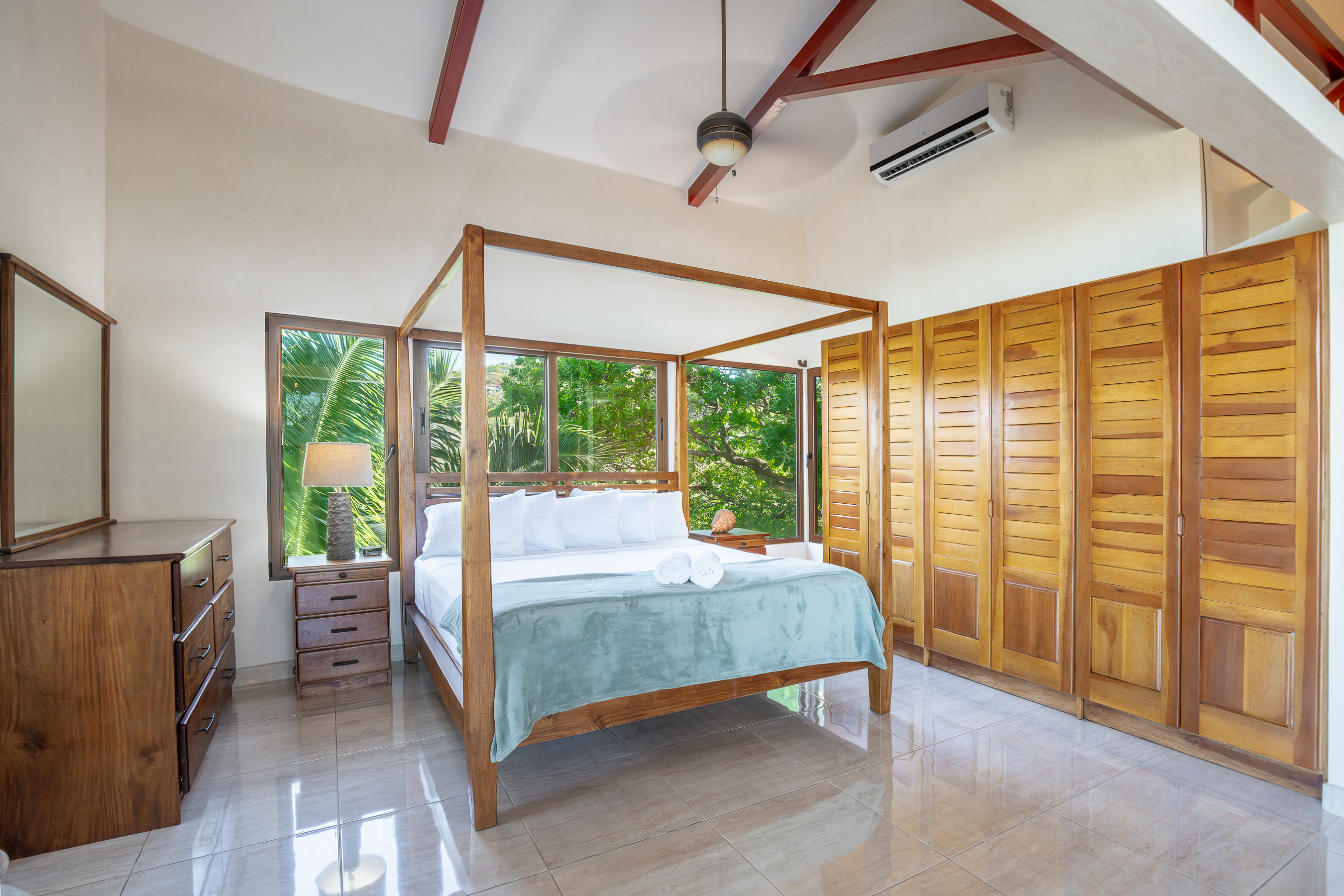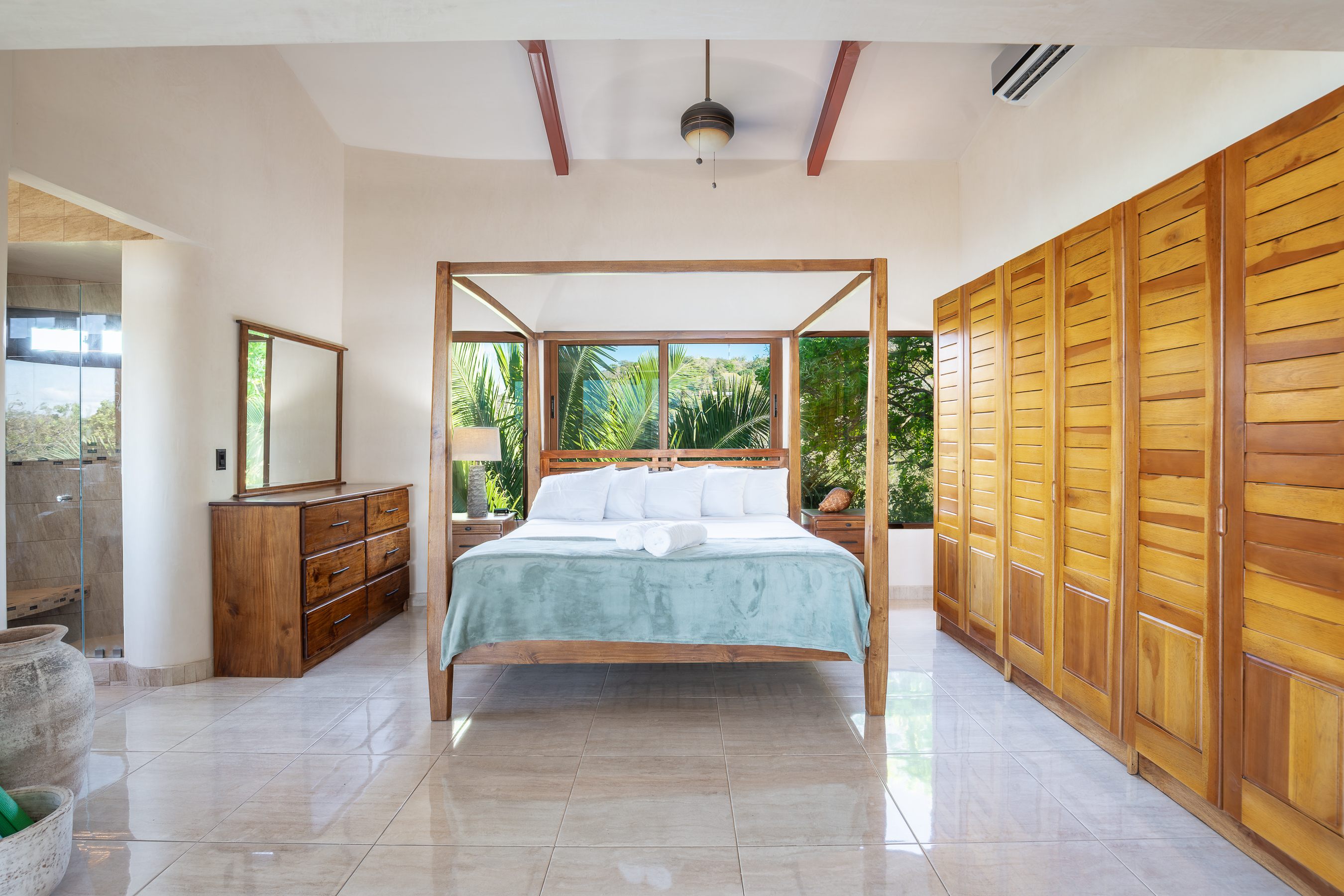 Stunning ocean views are yours from the contemporary-styled, quiet, elevated and breezy, Sky House at Kahakai in Nosara's K-Section. Located on one of the largest lots in the K-Section, the floor to ceiling glass nana-walls open to unobstructed views of mature jungle trees frequented by monkeys and abundant birdlife. Enjoy tranquil surroundings, far from street noise, yet walking distance to the Baker's Beach entrance of Playa Guiones. With a bicycle, ATV, or golf cart, you can easily access Main Street or North Guiones on backroads for shopping and restaurants without the need to cross or use the Highway; and for those who enjoy long walks, the well-known and scenic jungle trails, and the beach, can be used to discover the various neighborhoods, each offering a distinct personality; or, explore the tide pools and the tranquil beaches of south Guiones. Aside from the ease of enjoying all that Nosara has to offer, guests may find the Sky House to be a destination in itself -- sunsets are spectacular from the terrace, wildlife viewing is enhanced by the adjacent undisturbed and undeveloped lot, and the 5 x 10 meter swimming pool is perfect for relaxing or swimming laps. The Sky House is equipped with a king-size bed and is well-suited for an active couple looking for a spectacular living space in Nosara with easy access to Guiones Beach.