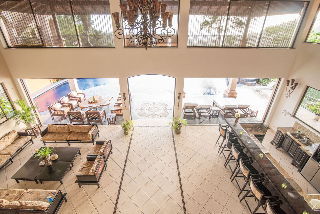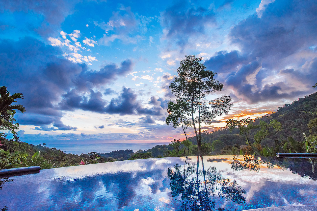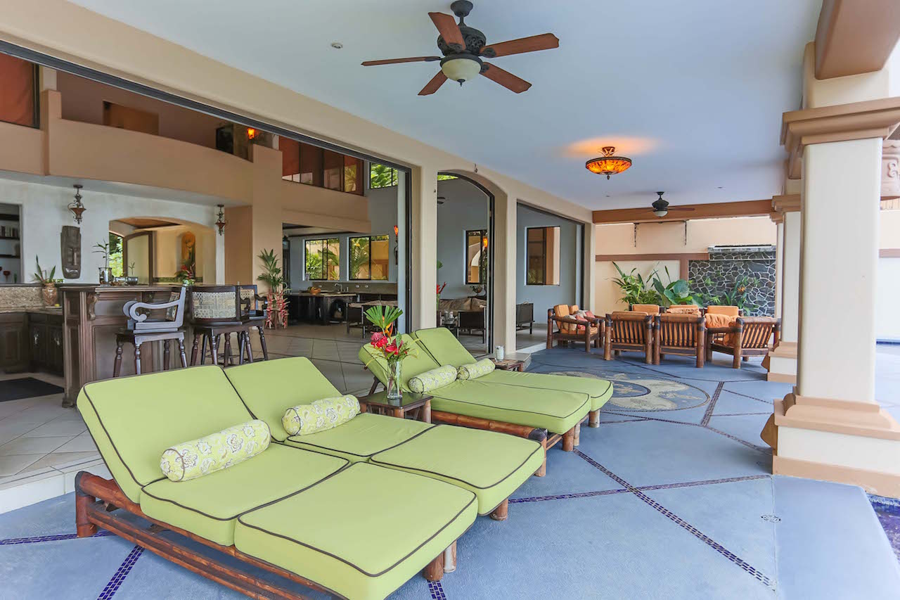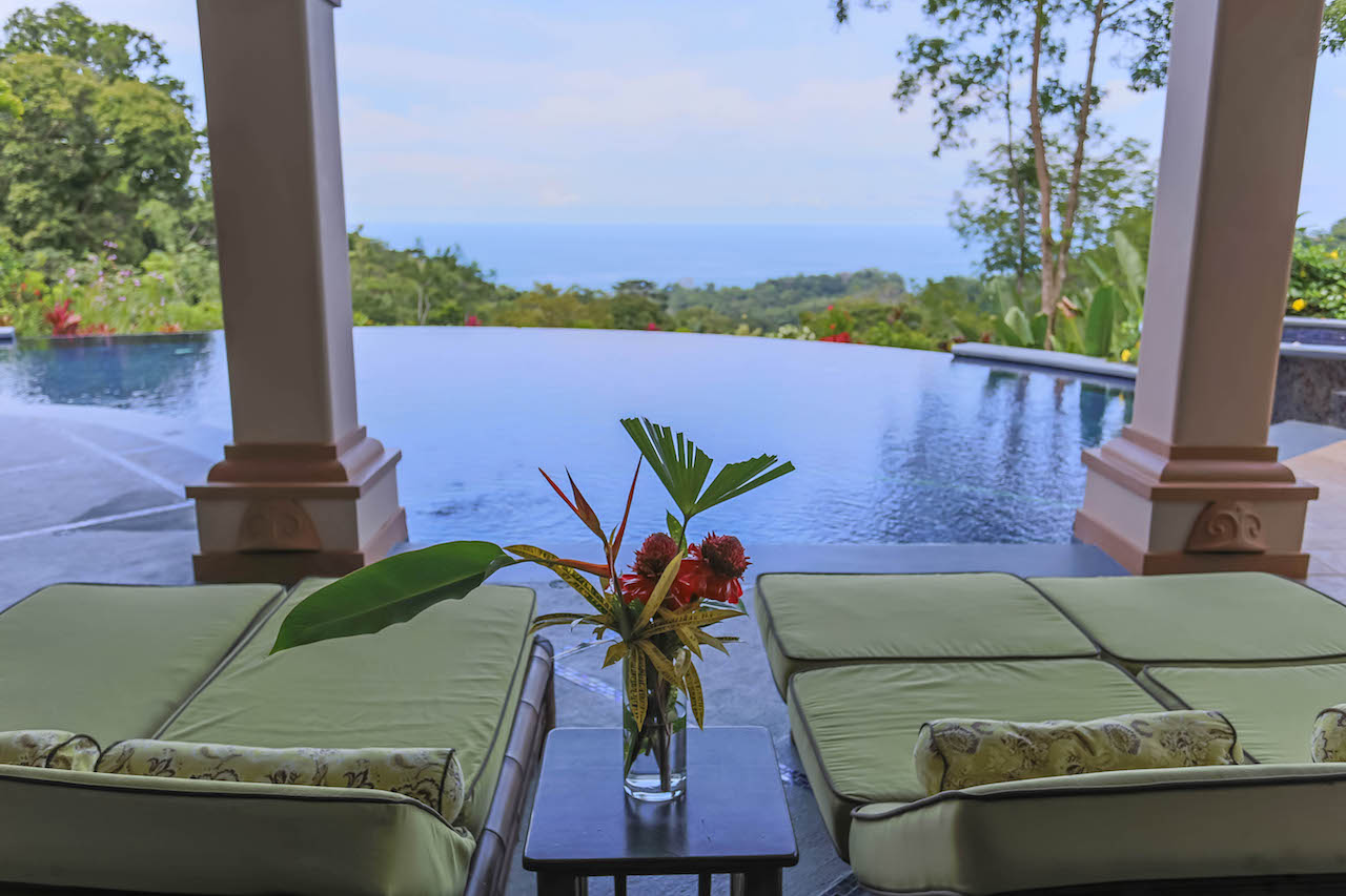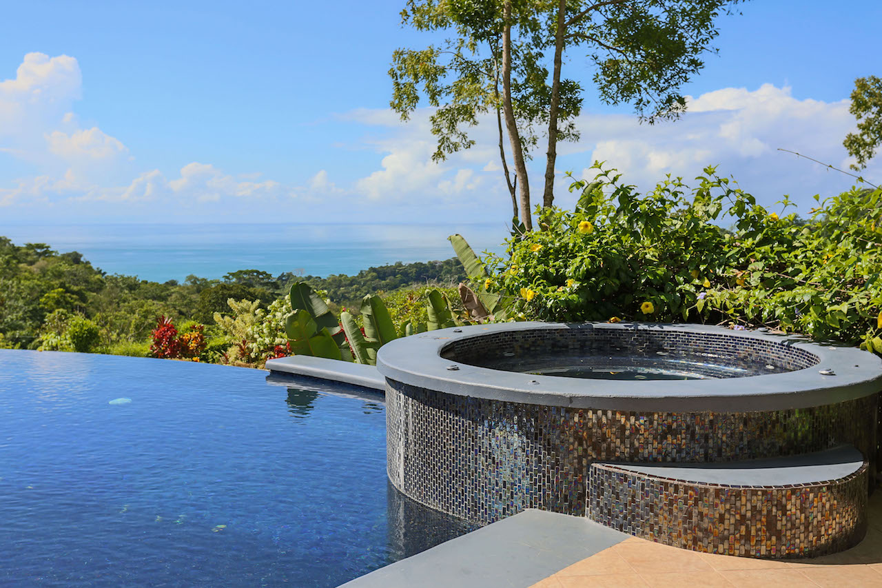 Extending out the sliding glass patio doors sits the mosaic tiled patio with loungers and sitting area, this is the optimal area to enjoy the sunset views. The 1,700 sq. ft. infinity pool finished with glistening imported blue glass tiles features shallow “beach” sections, a calming waterfall, a Jacuzzi and an outdoor shower. The ocean view framed by the surrounding rainforest, which extends off the infinity pool, will make your heart skip a beat.