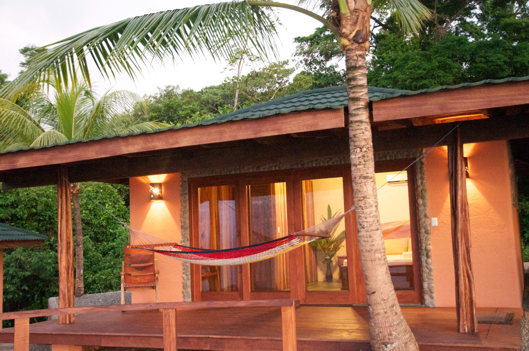 Midway between the upper level and the lower level is a honeymoon cabin designed and furnished for a cozy, comfortable, romantic stay. It’s location a little apart from the other buildings ensures private enjoyment for couples of all ages, with a hammock and views to share over snacks and drinks.