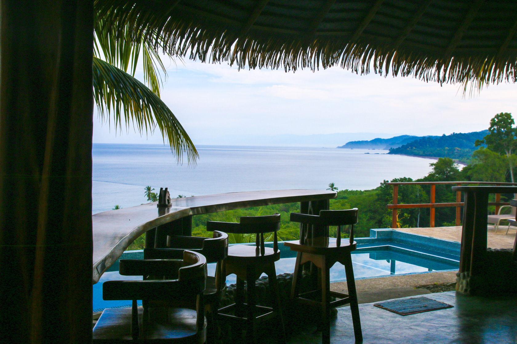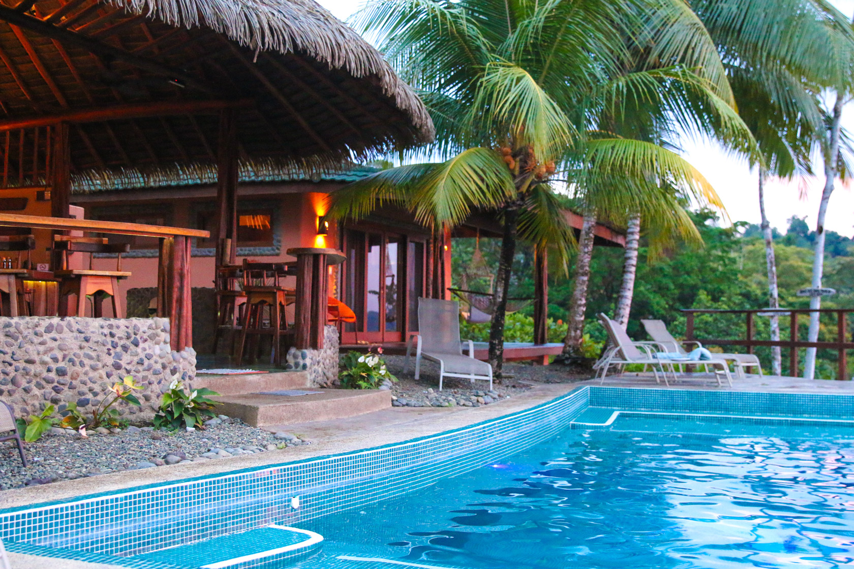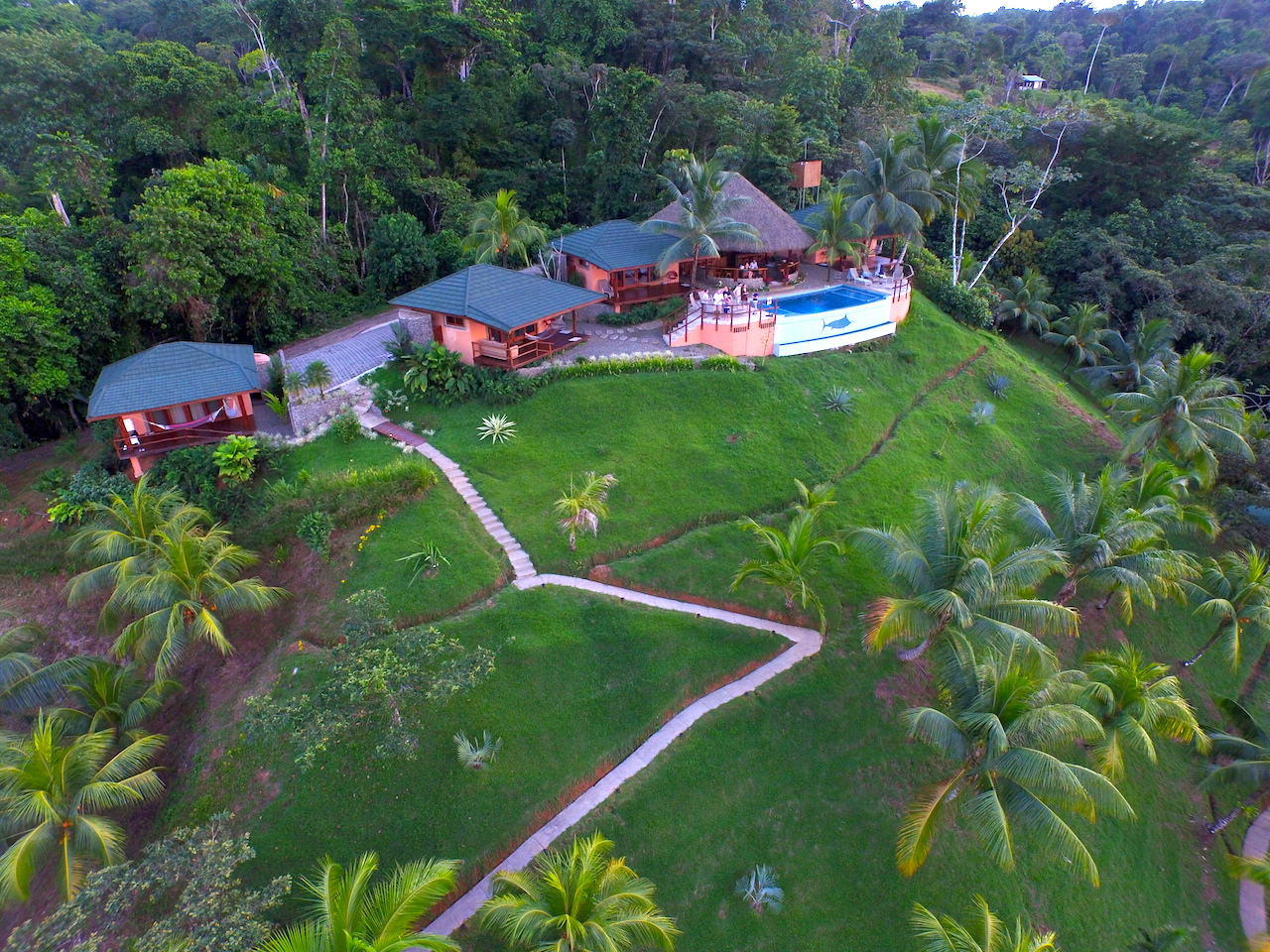 Built on three levels of a hillside, the top level features a “palapa” with a guest bar, restaurant and infinity edge pool, as well as four exclusive deluxe cabins. Each cabin offers photogenic views of Drake Bay’s deep blue ocean and constantly changing skies, and is furnished with high quality bedding, ultra soft towels, outdoor furniture and hammocks so your guests can deeply relax inside or out. The cabins are just a few steps from a pool designed to connect you visually right to the ocean. The effect is profound.