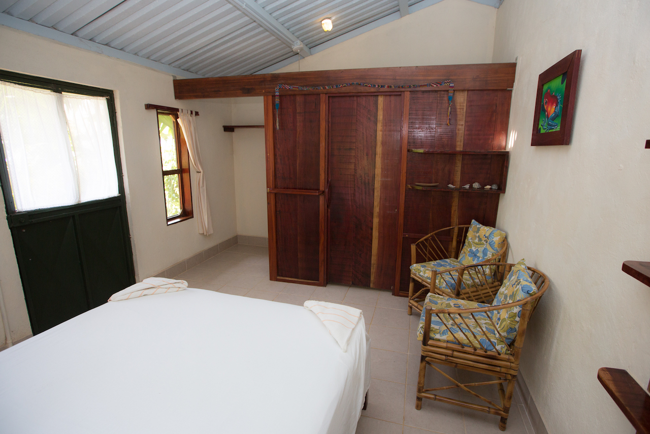 88 steps up into the canopy and built on the hillside, this cabin has native hard wood floors with marine varnish. The main room has one queen bed and a set of bunk beds with table and seating. A balcony looks out into the canopy and with some views through the trees to the beach. It has a full bathroom with passive hot water shower inside the