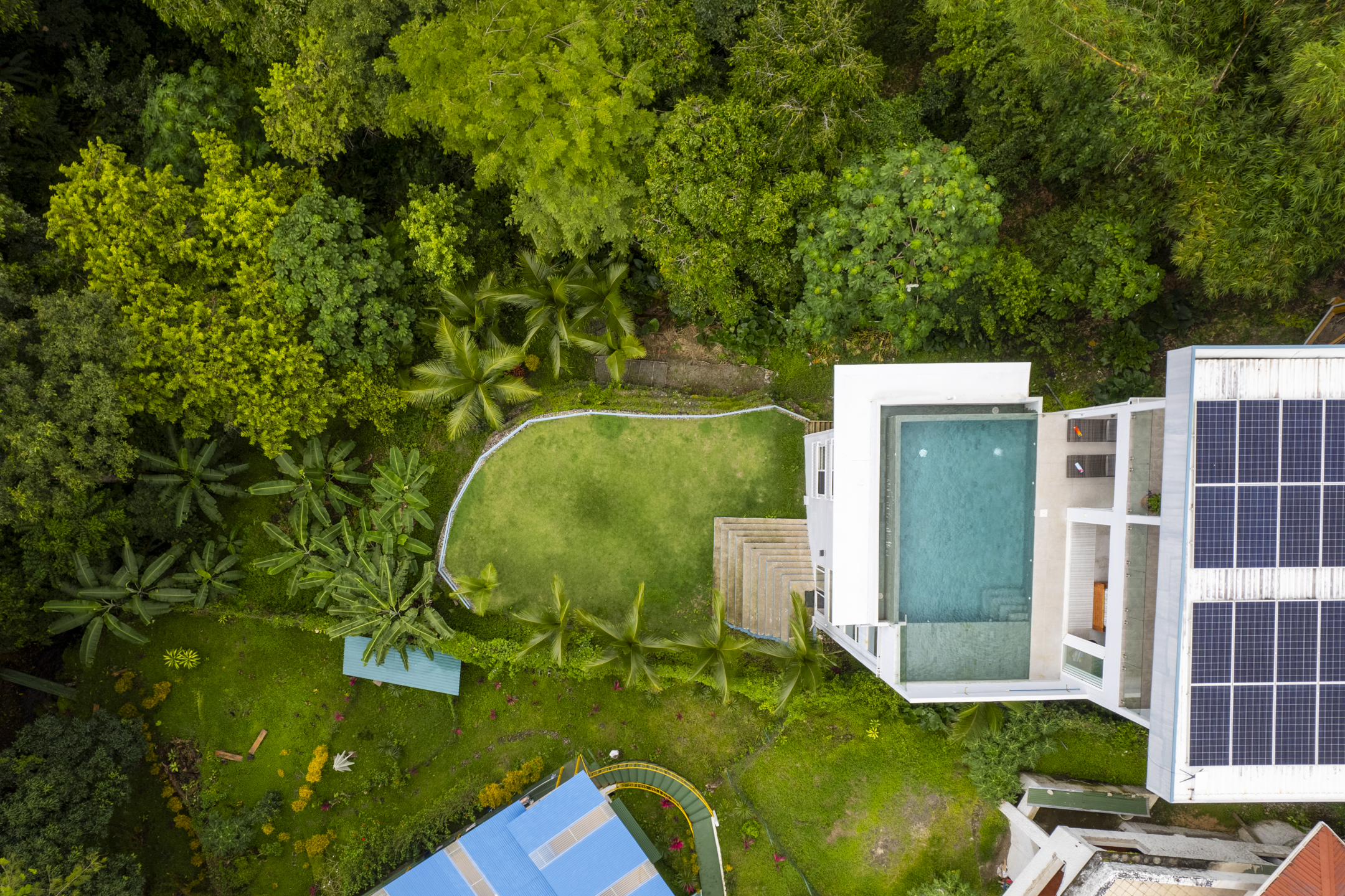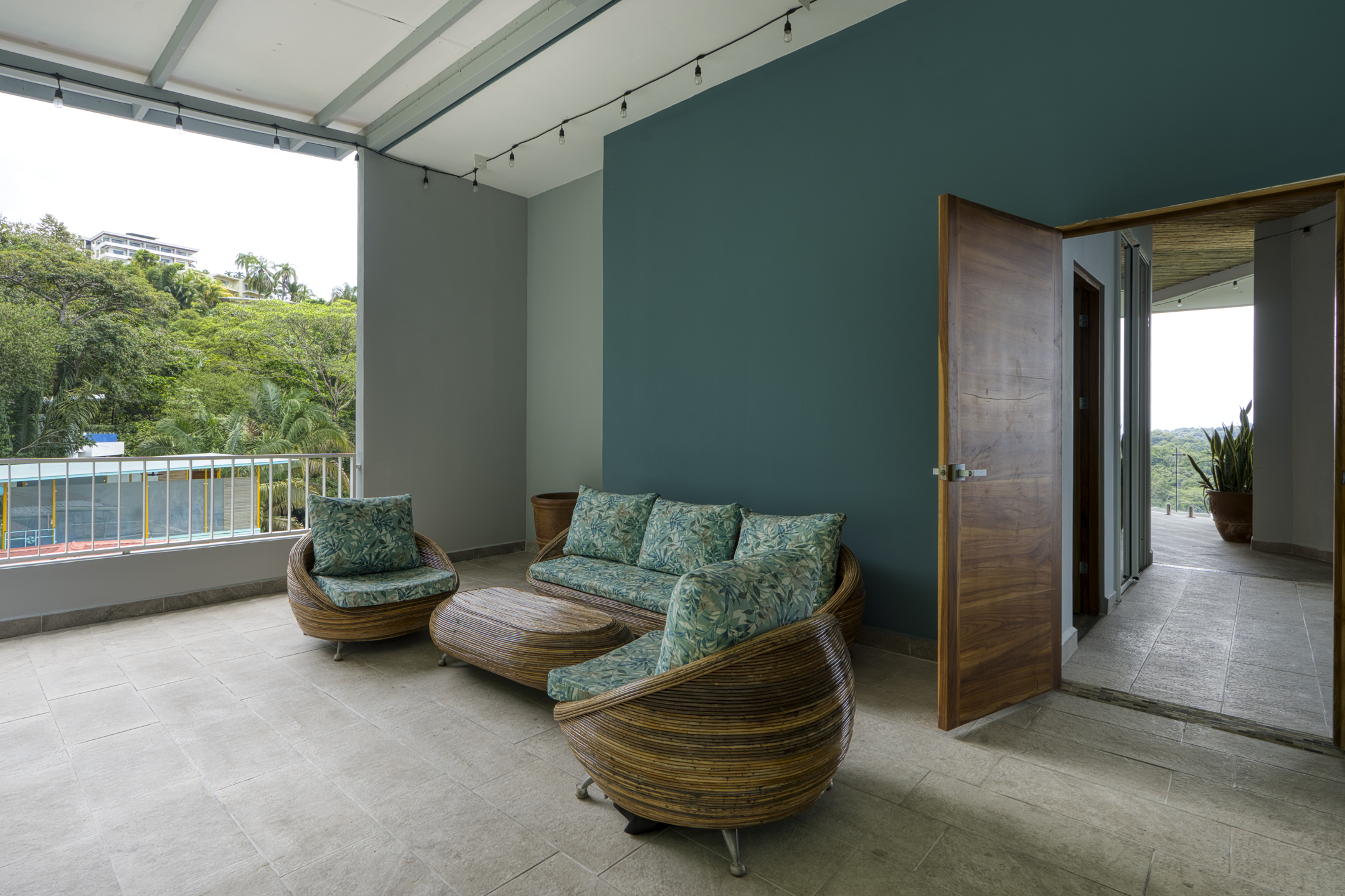 For business groups, the villa boasts an air-conditioned conference room equipped with a large boardroom table seating 22-30 people, 50" HD TV, OWL whiteboard, and adaptable setups. The conference space is bathed in natural light thanks to floor-to-ceiling windows but can also be fully darkened with blackout shades. Ideal for corporate meetings, the villa also offers a covered event space on the top floor, complete with sound equipment, a bar, and infinite ocean views—perfect for team-building activities, luncheons, or presentations.
