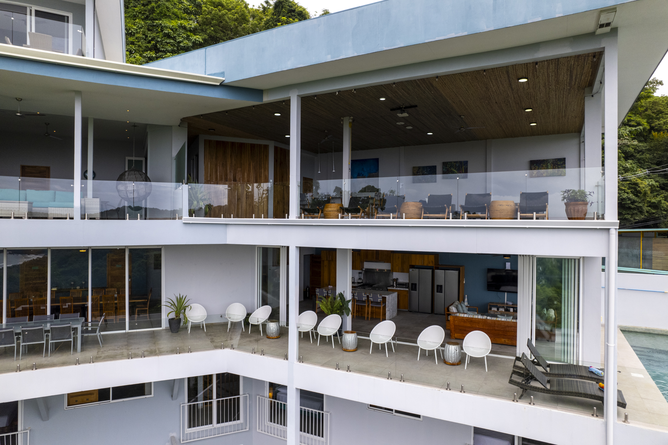 Villa Costa Vida features 17+ air-conditioned bedrooms that can comfortably host up to 57 guests, with accommodations for events of up to 75 people. Designed with both style and function in mind, the villa includes multiple living spaces, a spacious kitchen and dining area, and numerous balconies that offer breathtaking views of the Pacific Ocean.