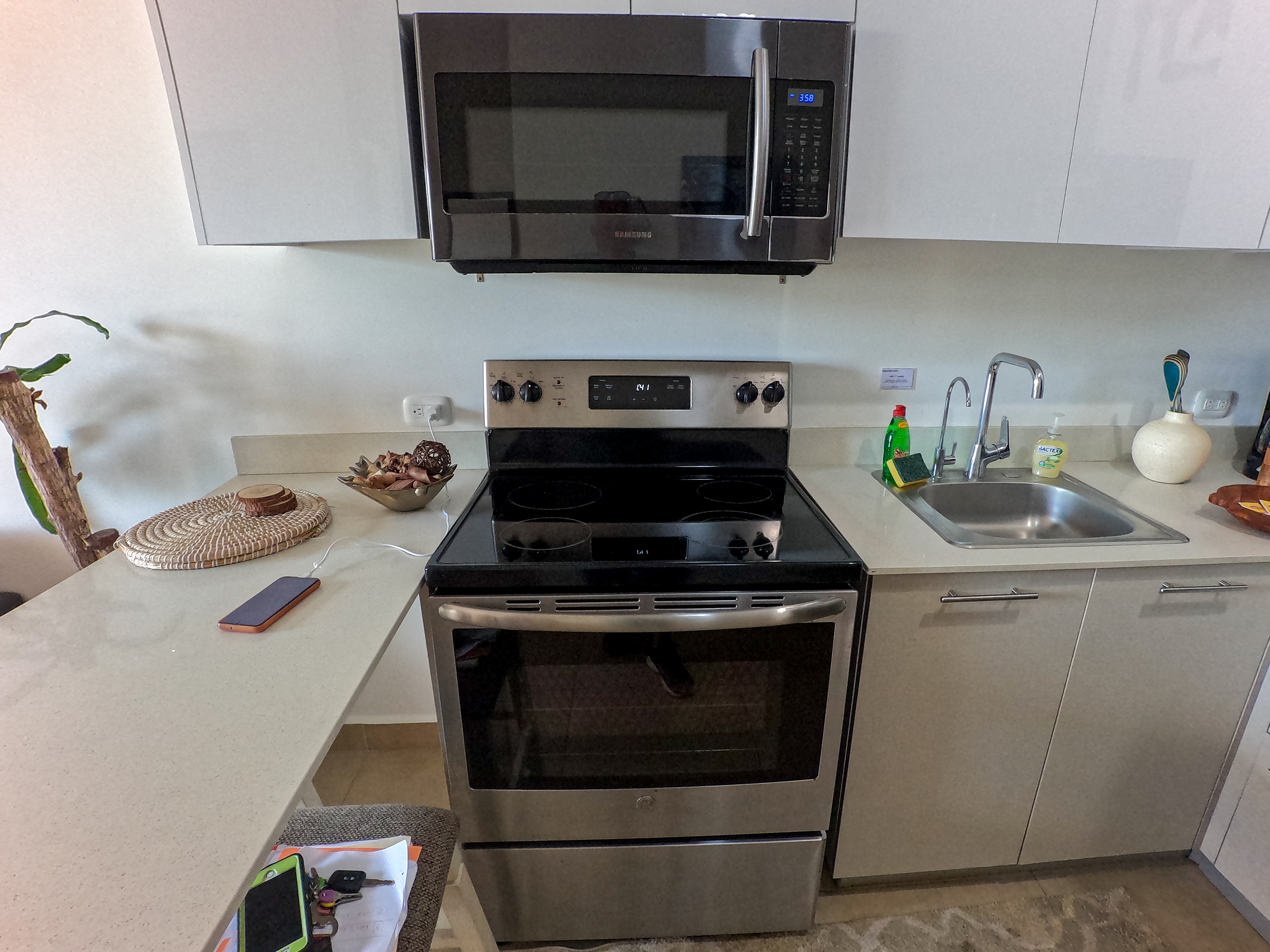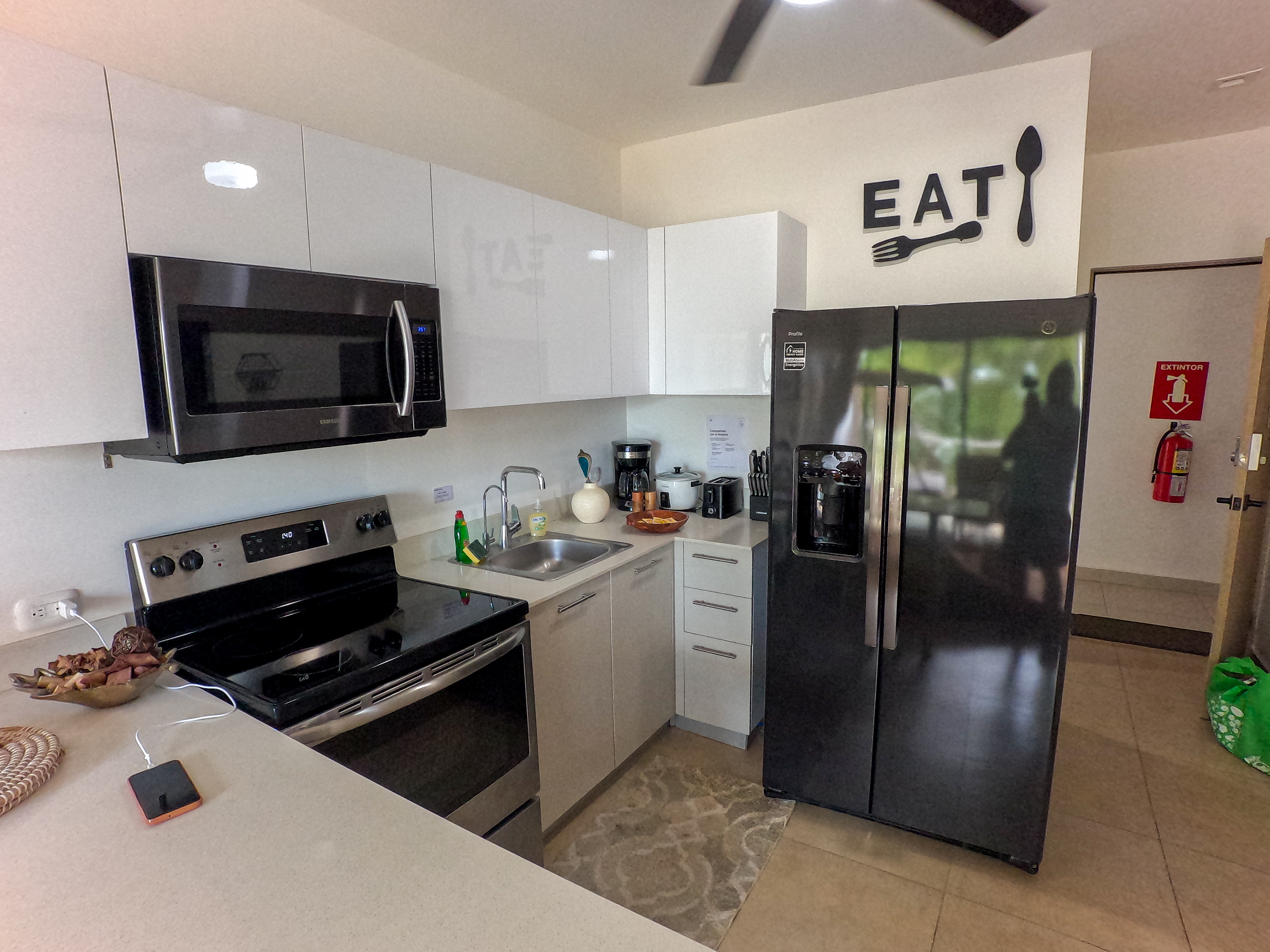 ✔ Modern Kitchen – Quartz countertops, G.E. stainless steel appliances, a double-door refrigerator, microwave, dishwasher, and electric stove with exhaust for a sleek and functional cooking space.