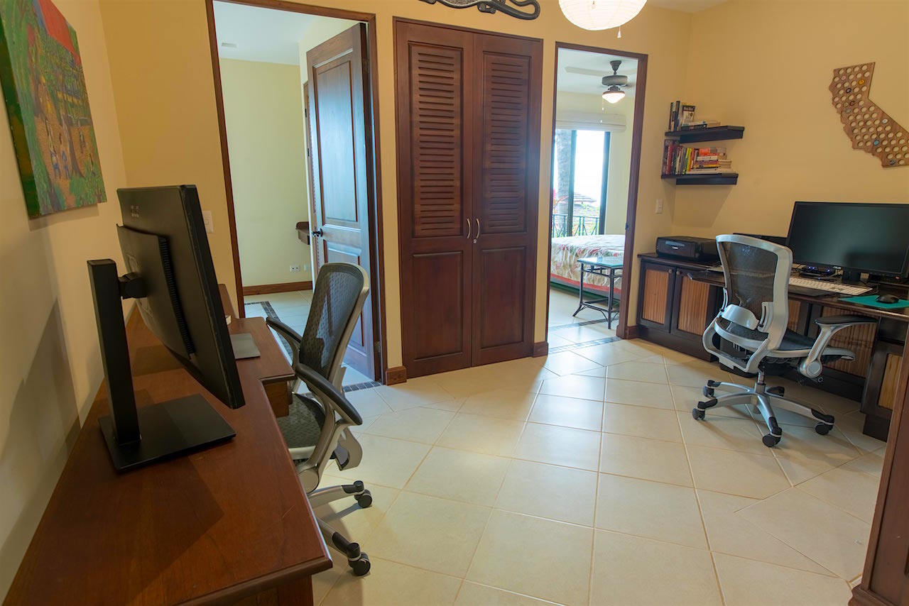 As you head downstairs to the first floor, you will find a bonus room currently used as a home office, a laundry room, and two bedrooms. Each bedroom includes ocean and jungle views, a private bathroom, and covered balconies. The master bedroom has a newly remodeled Bali inspired bathroom.