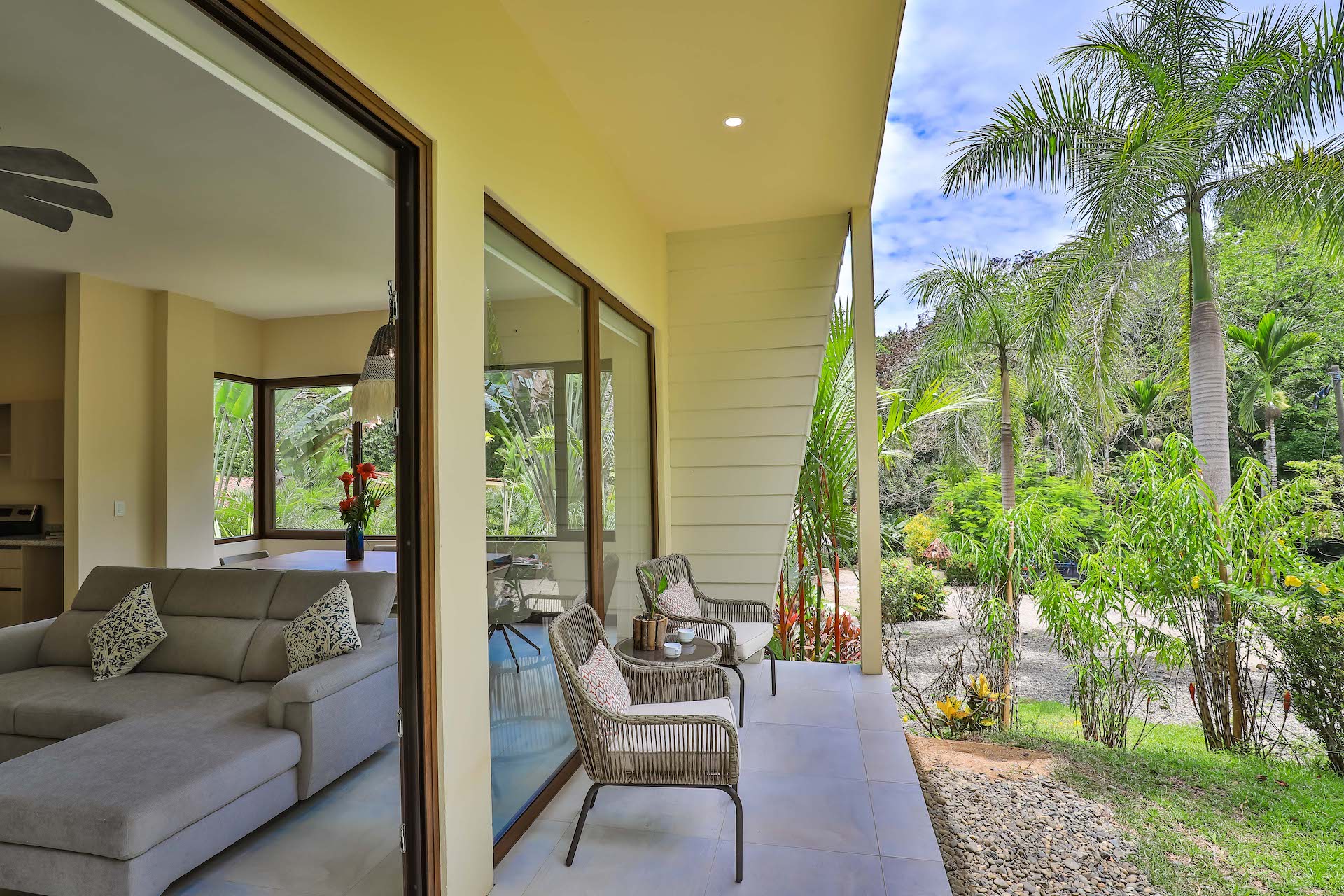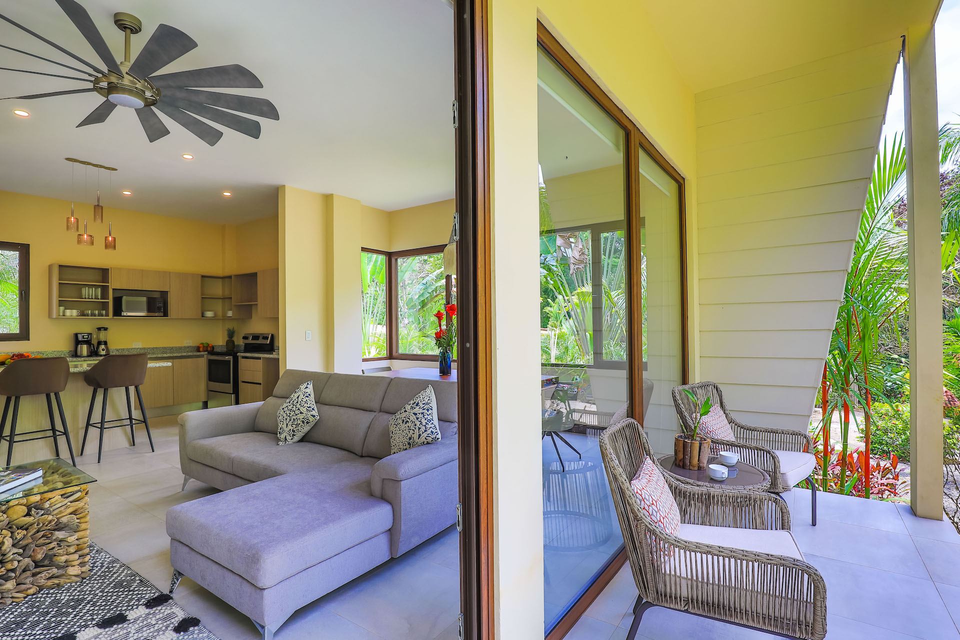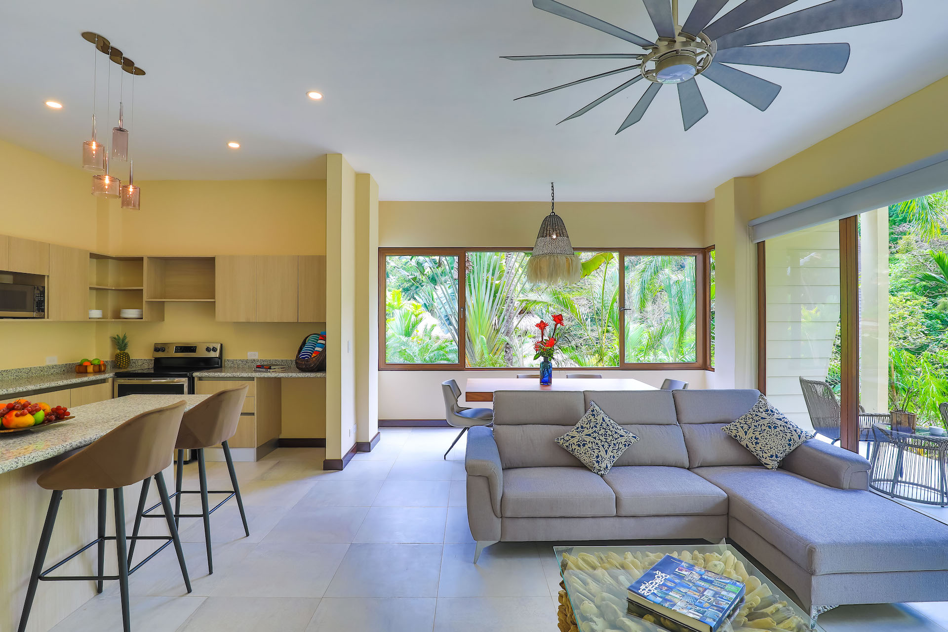 You enter this beautiful condo through the lush courtyard with views of the large resort style pool and sundeck area. As you enter through the foyer of this condo you are presented with an open floor plan showcased by the natural light beaming through insulated floor to ceiling sliding glass doors and windows. The elegant and modern kitchen is L shaped with a beautiful entertainment island in the center. The dining and living areas are surrounded by stunning sliding glass walls with an expansive outdoor terrace/balcony, to bring the lush tropical feeling of the rainforest into the condo. Villas are fresh and airy due to the natural setback of the rainforest from the landscaped gardens. A full bathroom is located off the main foyer and with 2 additional bedrooms and laundry closet located beyond. There are large terraces off the master bedroom and one of the secondary bedrooms. The master bedroom is complete with ensuite bathroom of elegant large Italian tile shower and its own private terrace/balcony for ultimate privacy and relaxation.