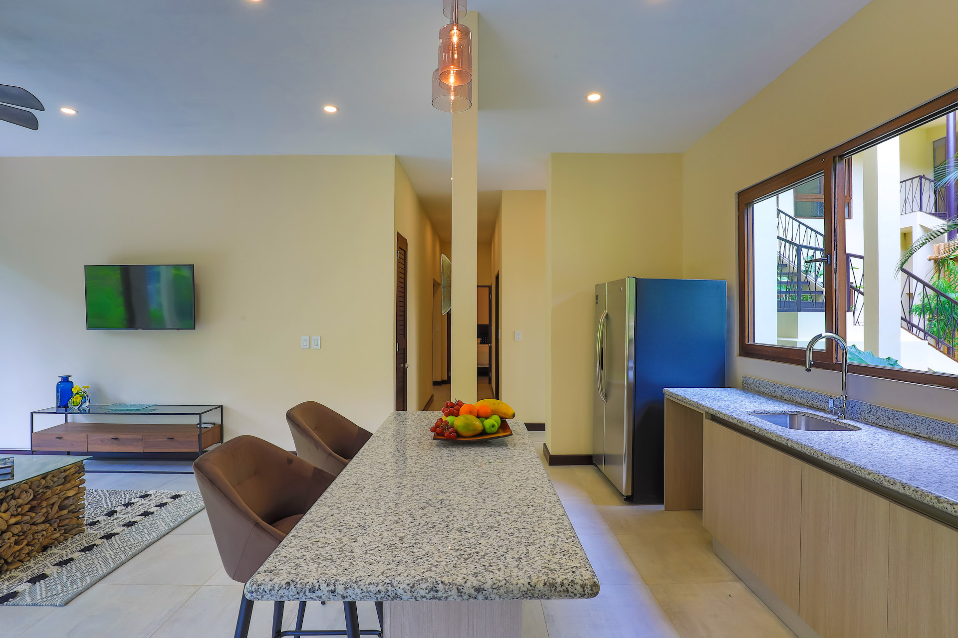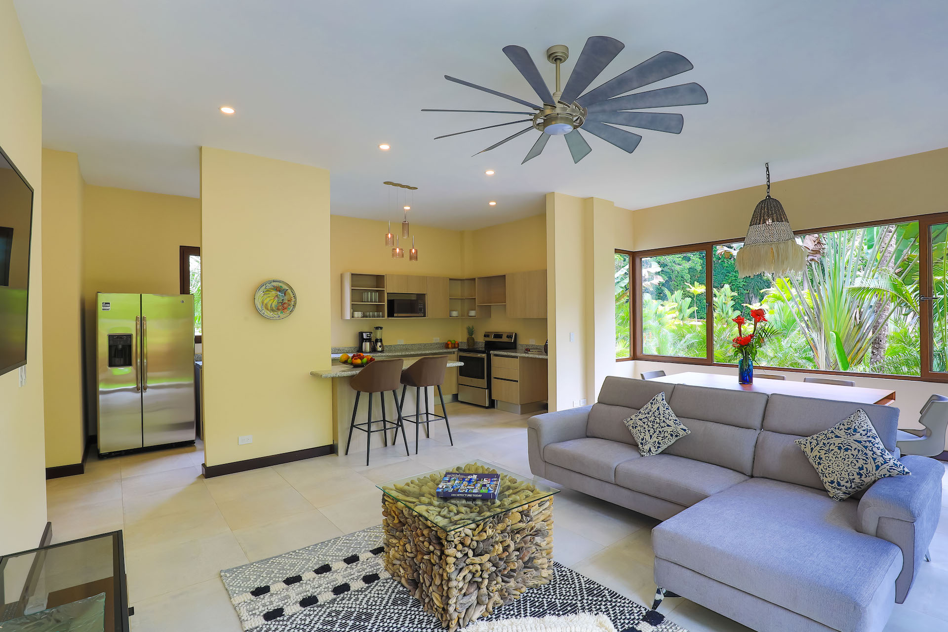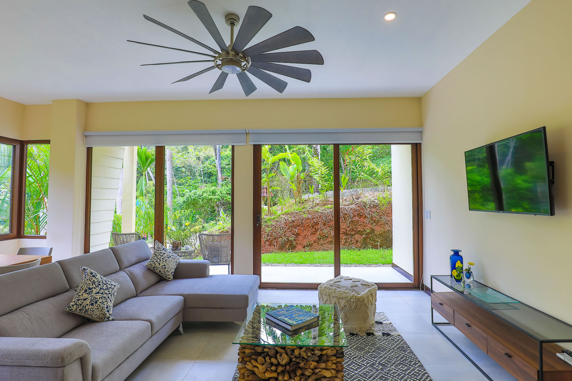 You enter this beautiful condo through the lush courtyard with views of the large resort style pool and sundeck area. As you enter through the foyer of this condo you are presented with an open floor plan showcased by the natural light beaming through insulated floor to ceiling sliding glass doors and windows. The elegant and modern kitchen is L shaped with a beautiful entertainment island in the center. The dining and living areas are surrounded by stunning sliding glass walls with an expansive outdoor terrace/balcony, to bring the lush tropical feeling of the rainforest into the condo. Villas are fresh and airy due to the natural setback of the rainforest from the landscaped gardens. A full bathroom is located off the main foyer and with 2 additional bedrooms and laundry closet located beyond. There are large terraces off the master bedroom and one of the secondary bedrooms. The master bedroom is complete with ensuite bathroom of elegant large Italian tile shower and its own private terrace/balcony for ultimate privacy and relaxation.