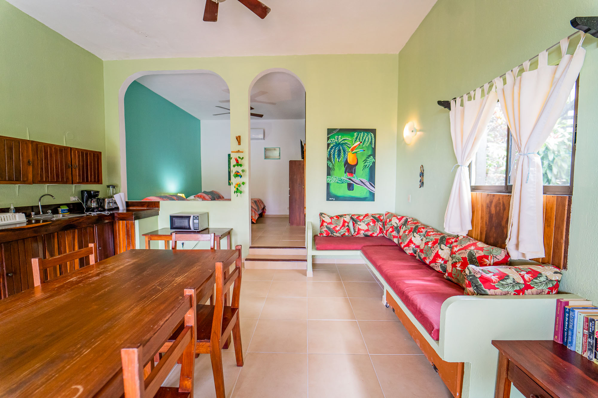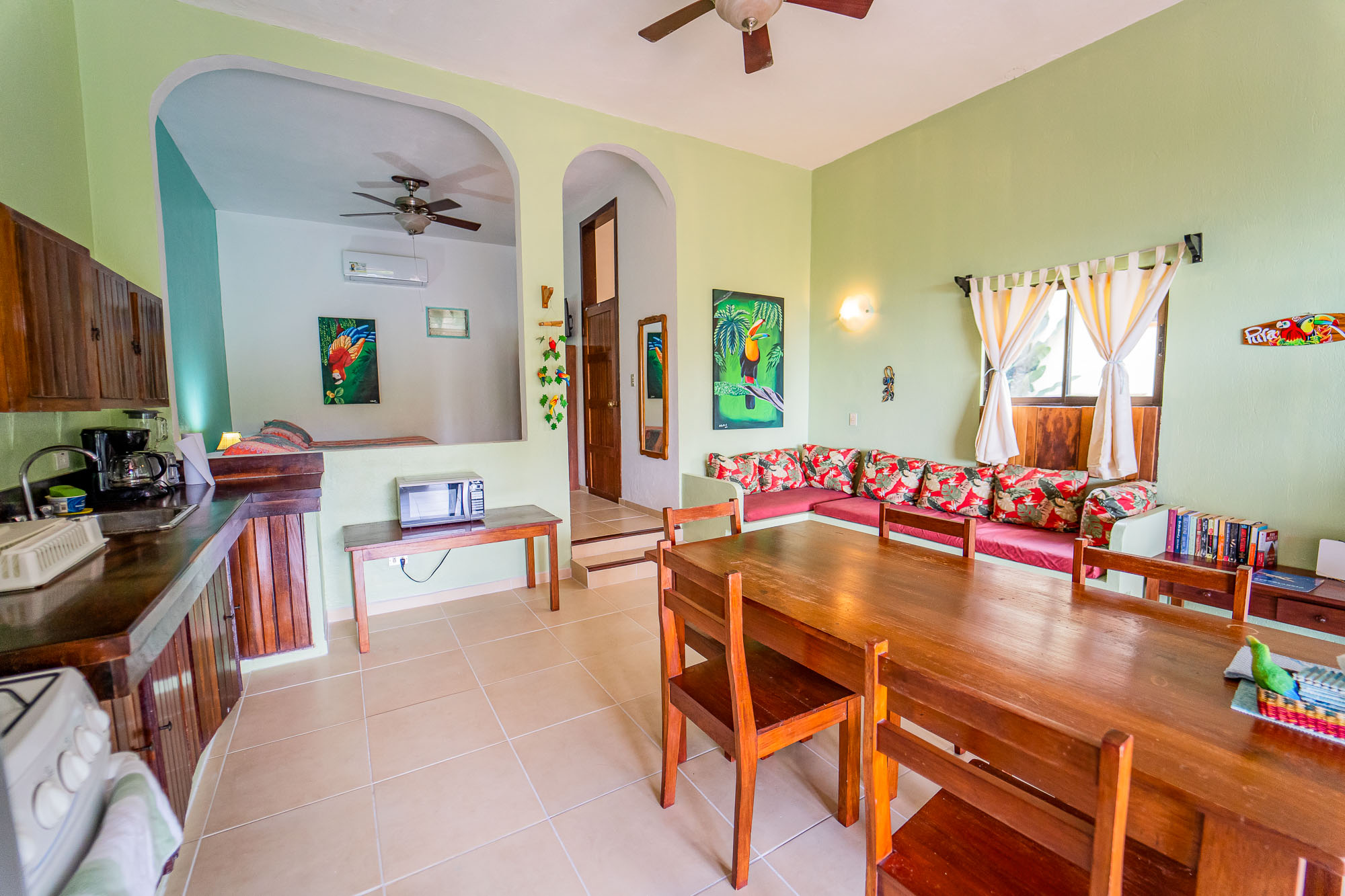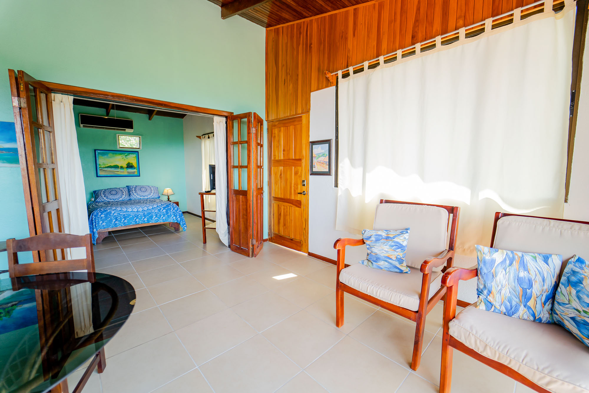 Villas El Parque offers two completely separate units both with amazing ocean views. Upstairs, you’ll find a 450 ft2 unit with one bedroom and a full bathroom. Its folding dividing doors can create privacy for the bedroom, or open them up for a studio feel with a dining room and open kitchen.