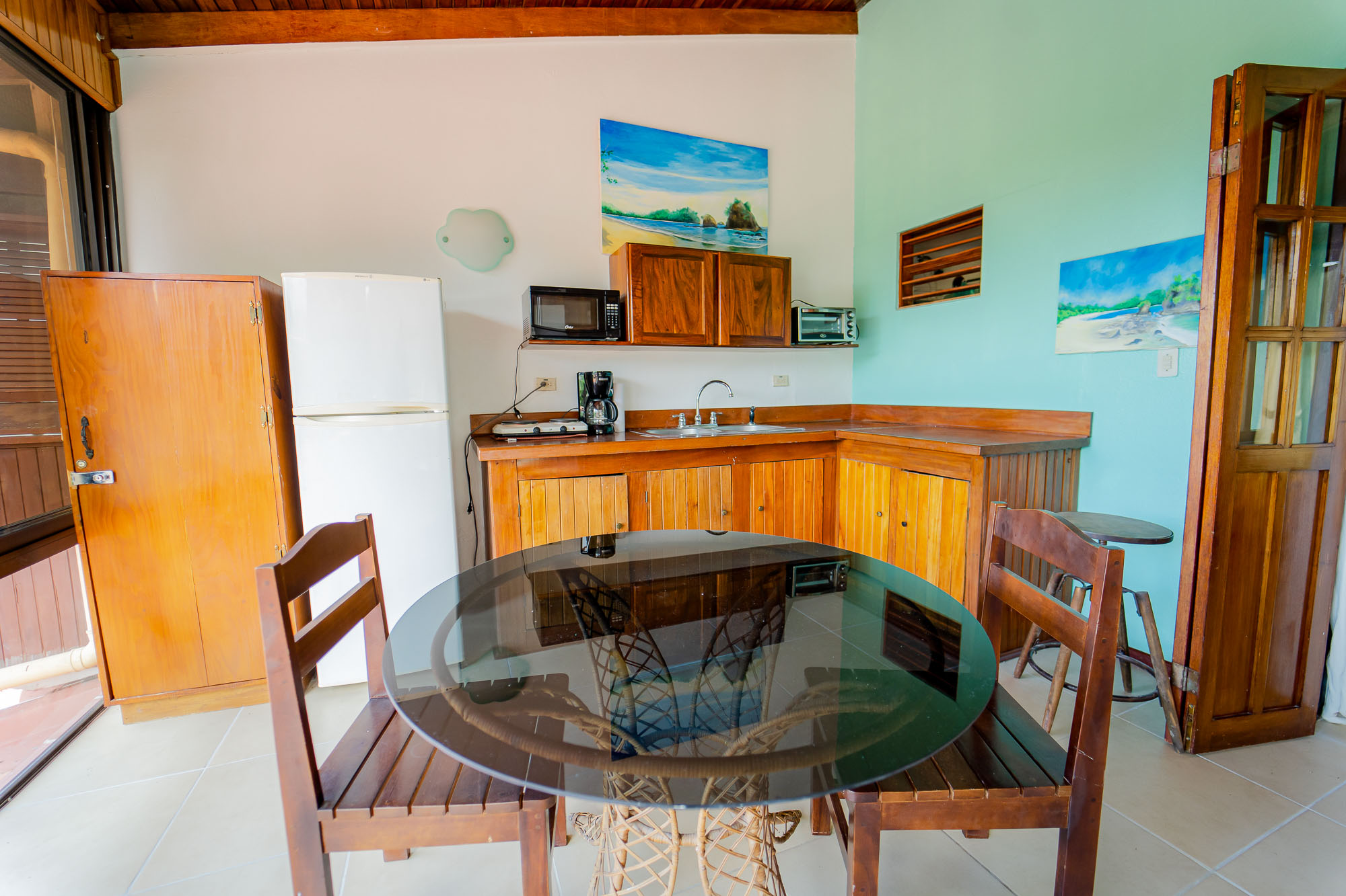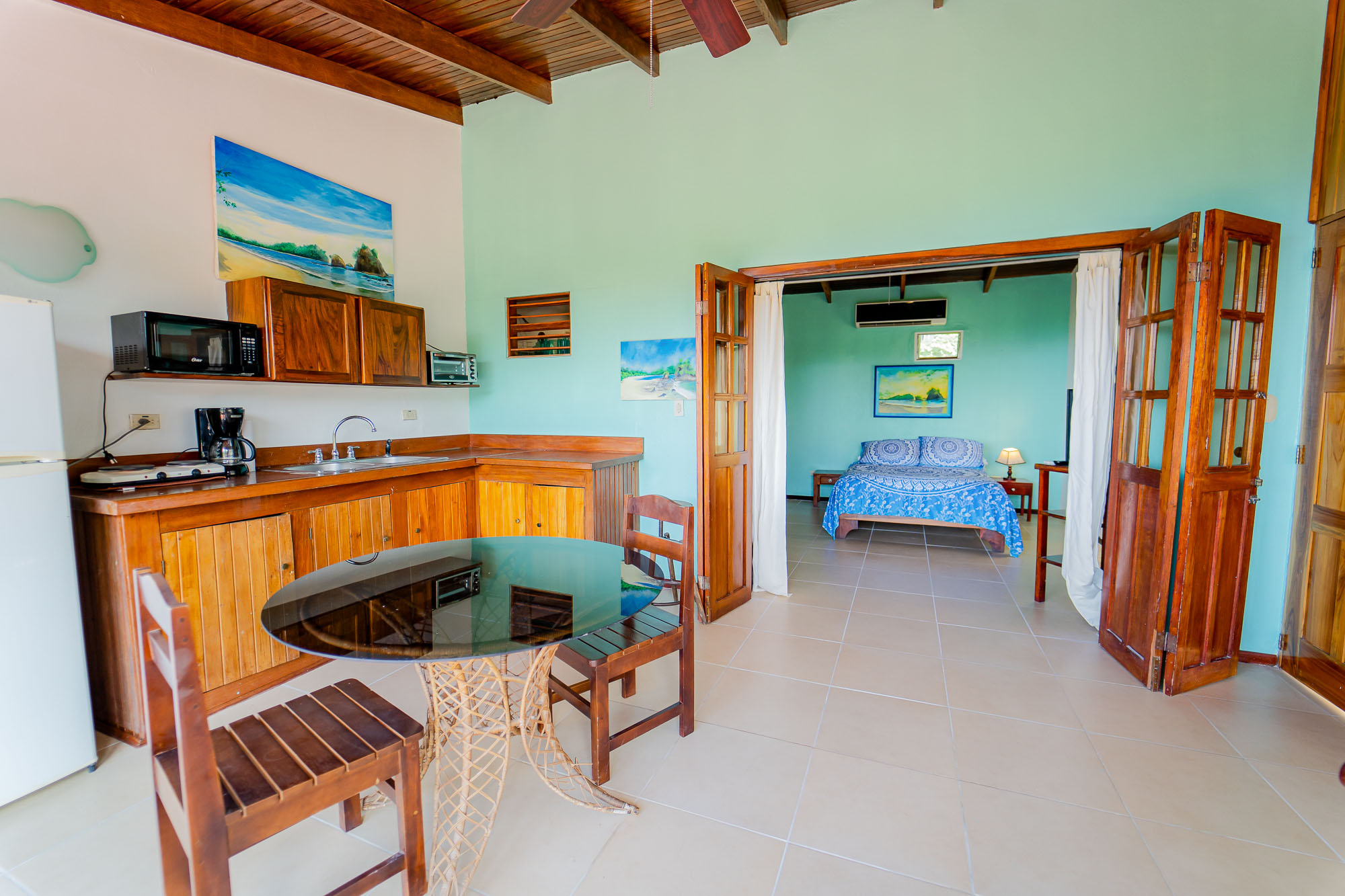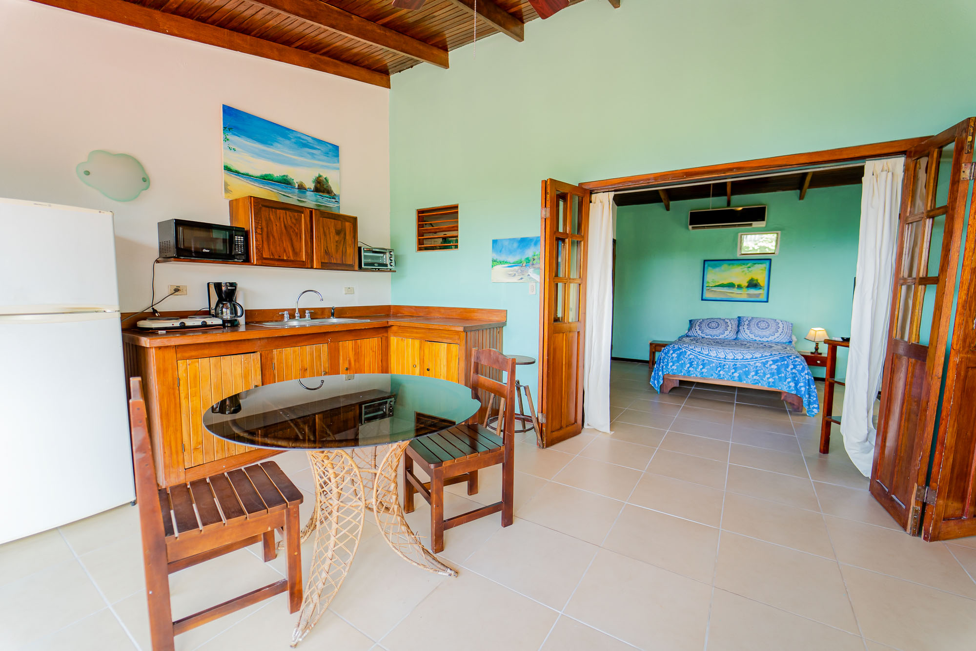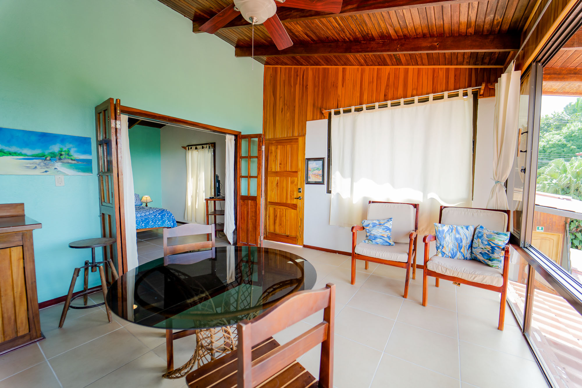 Villas El Parque offers two completely separate units both with amazing ocean views. Upstairs, you’ll find a 450 ft2 unit with one bedroom and a full bathroom. Its folding dividing doors can create privacy for the bedroom, or open them up for a studio feel with a dining room and open kitchen.