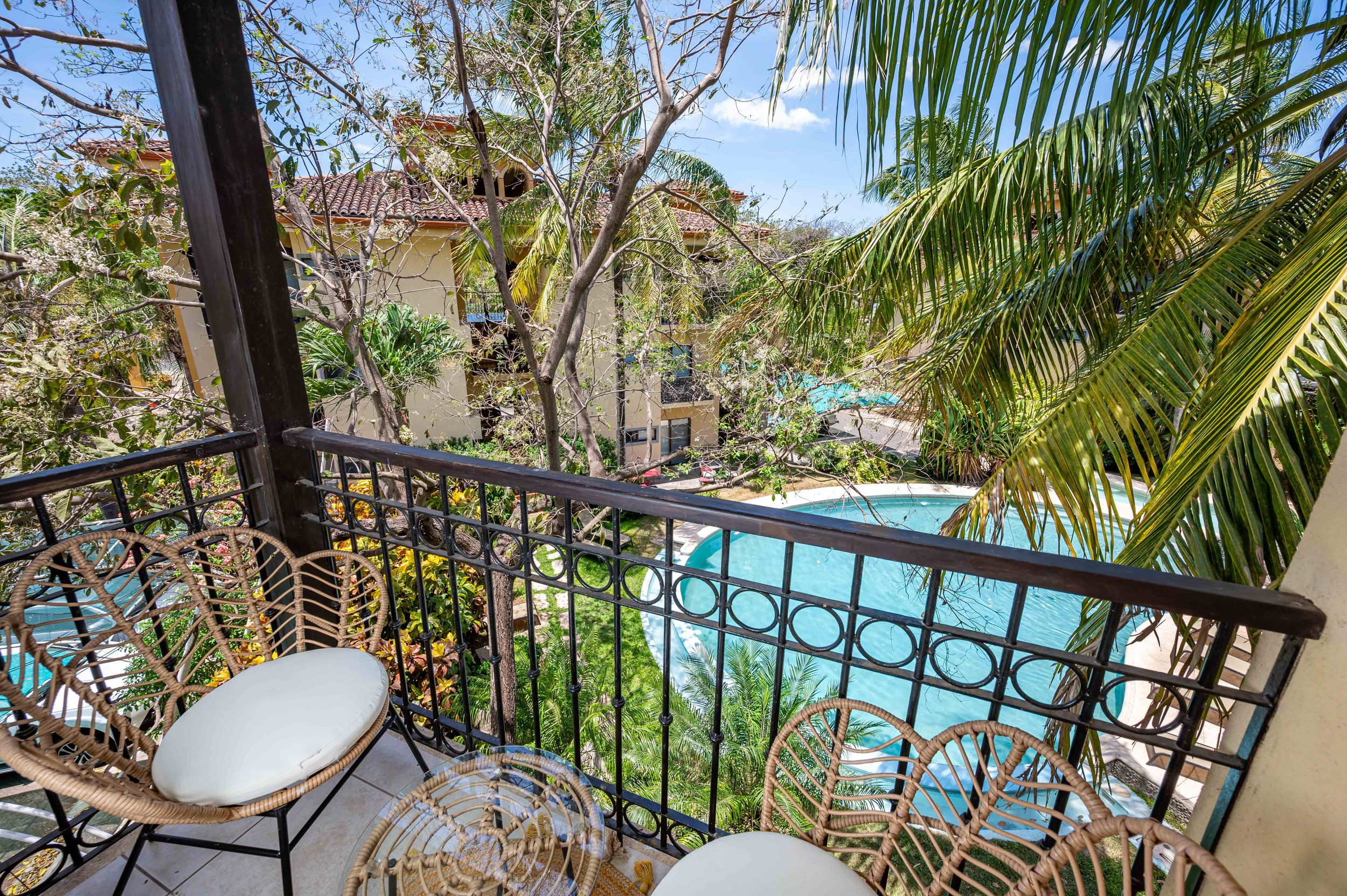 Enjoy two private balconies, one with serene views of the lush pool area, perfect for relaxation. The apartment also includes air conditioning for optimal comfort and a dedicated laundry area with a modern washer and dryer for convenience.