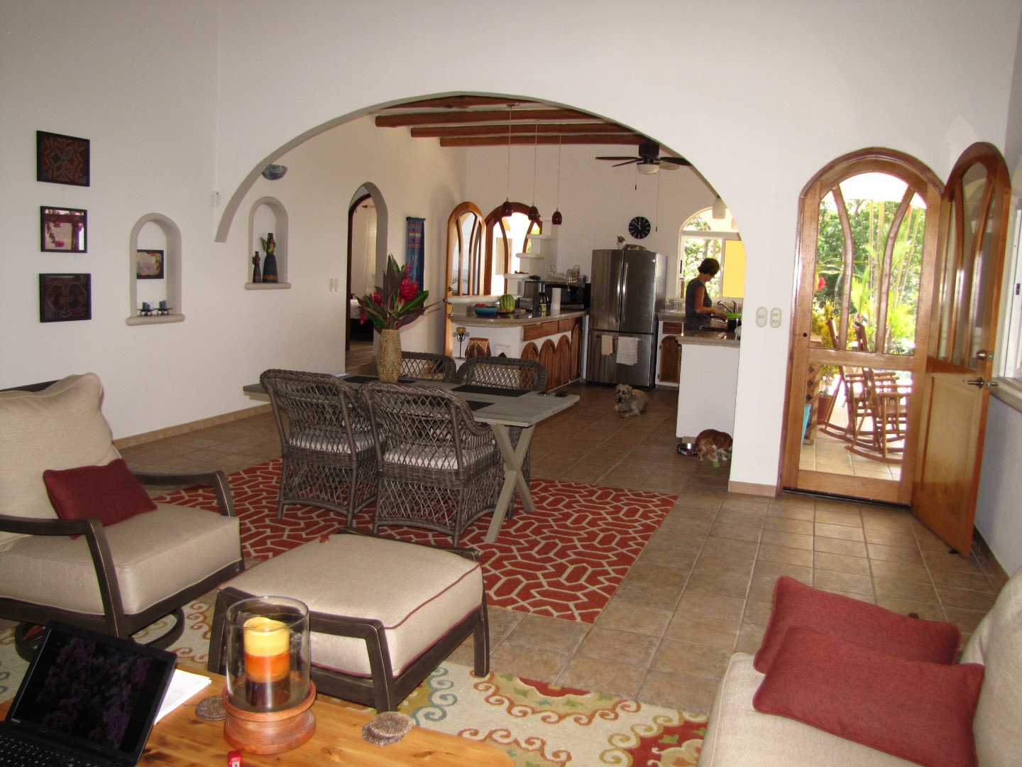 Inside, the graceful arches and beautifully timbered ceilings welcome you to the kitchen/dining/living area that is surrounded by windows letting in the breezes and light. Designed to be spacious and welcoming, the kitchen has all quality appliances and space for food preparation. Dining can be either inside or out depending on your mood and the weather. There is plenty of room for guests to spread out in the living room.