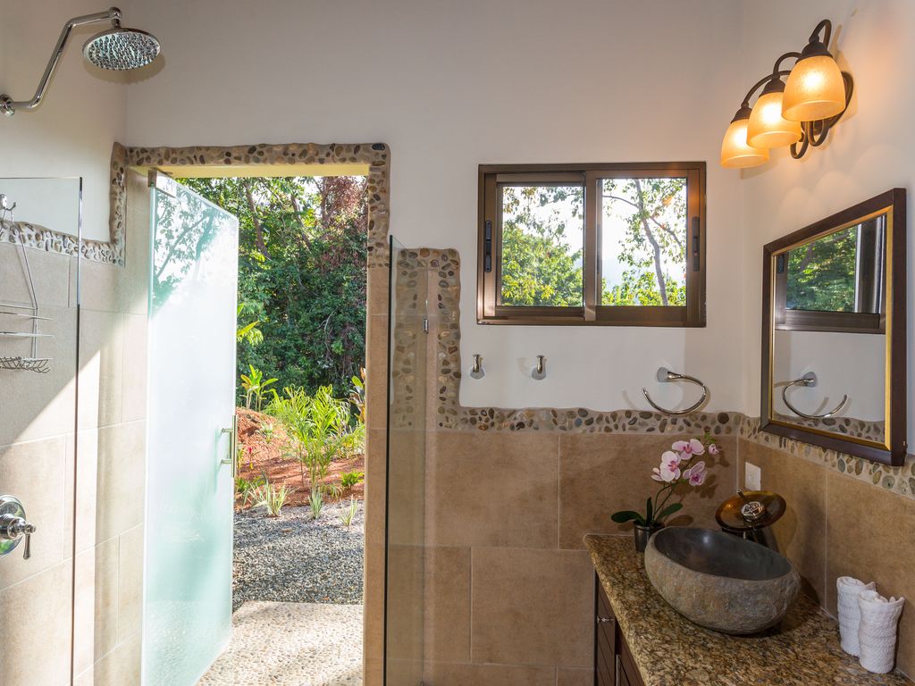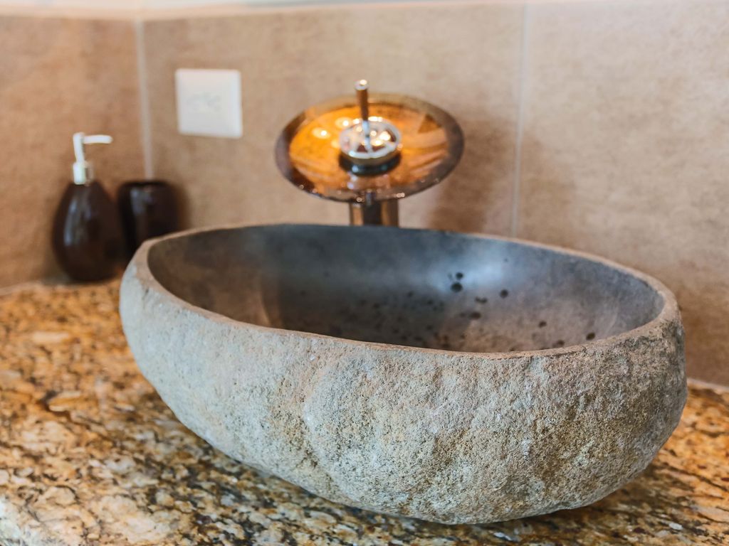 Although subtle, there are some interesting aspects to the main bathroom as well. The sink resembles a small boulder with its insides carved out, and the shower floor is laced with tiny rocks. There is also a secure, frosted shower door that leads from the bathroom to the backyard. A second restroom, sans shower, is also inside the villa.