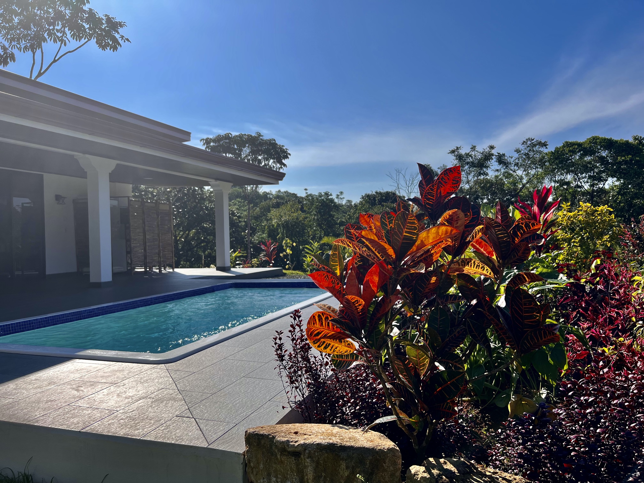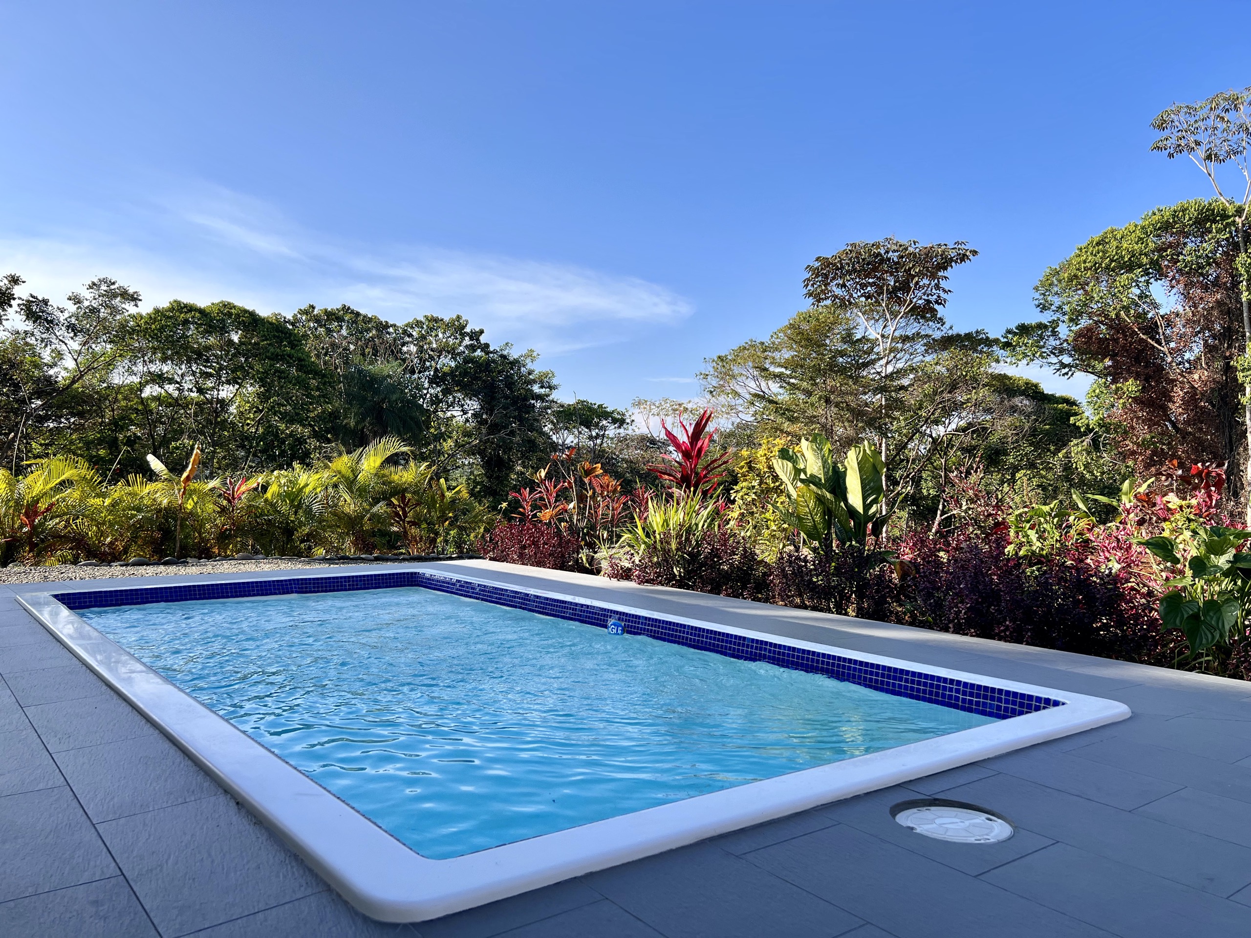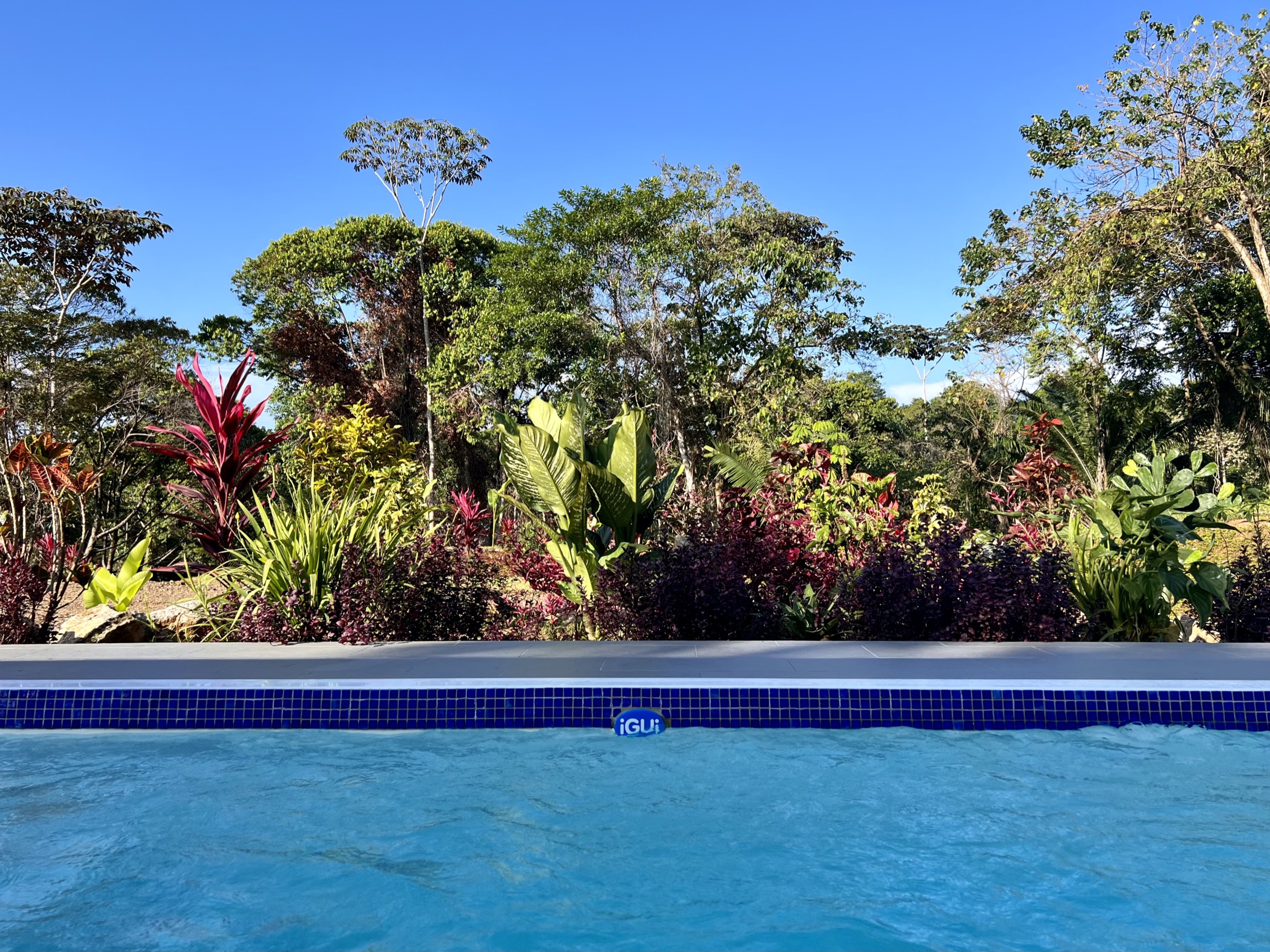 The salt pool (2x4m) surrounded by colorful plants is located just in front of the large terrace where you will enjoy lounging all day long. Unless you take your morning coffee on the back terrace of the house, also sheltered, to enjoy the soft glow of sunrise and the splendid light reflected by the lush vegetation and the mountain.