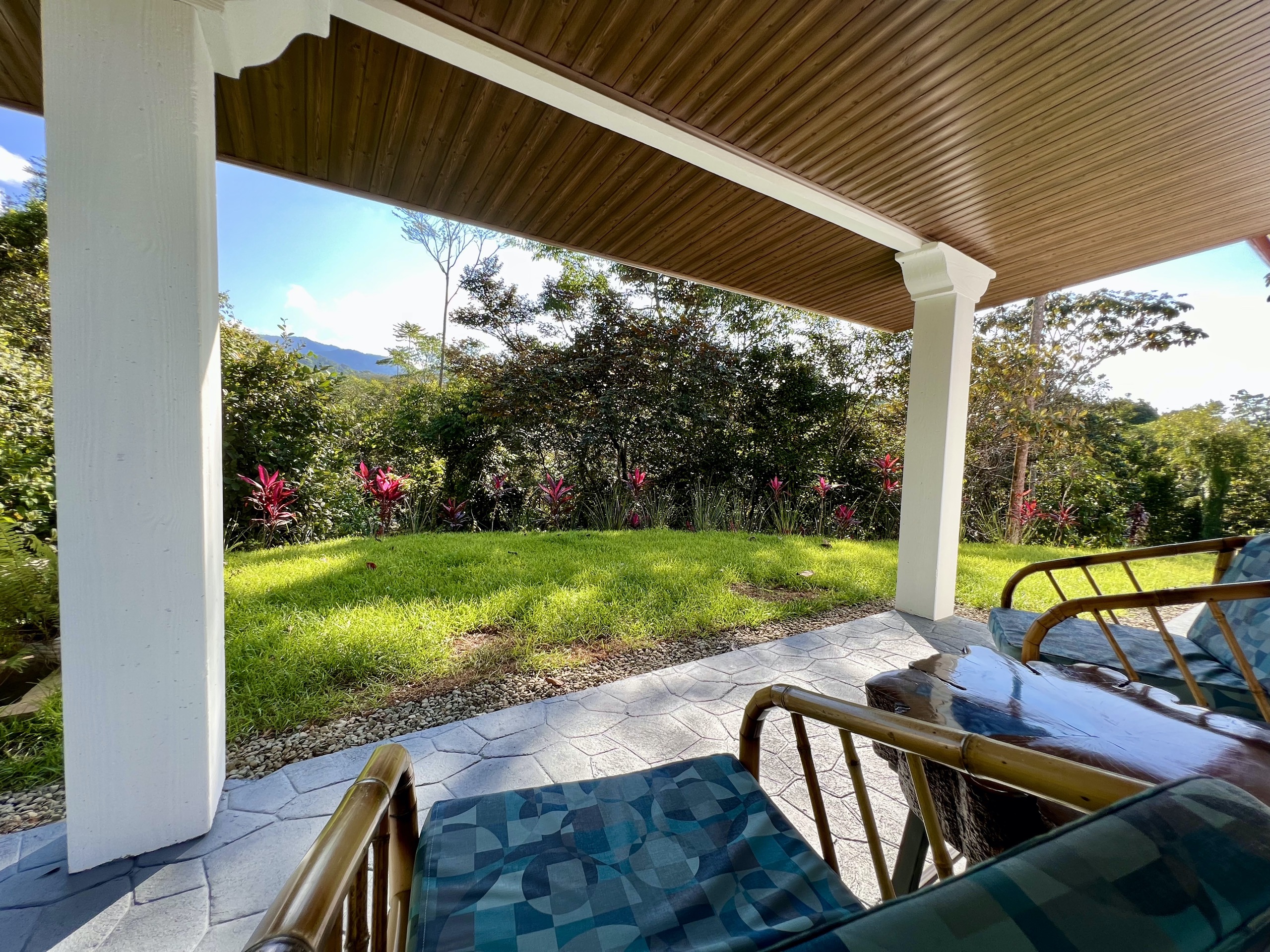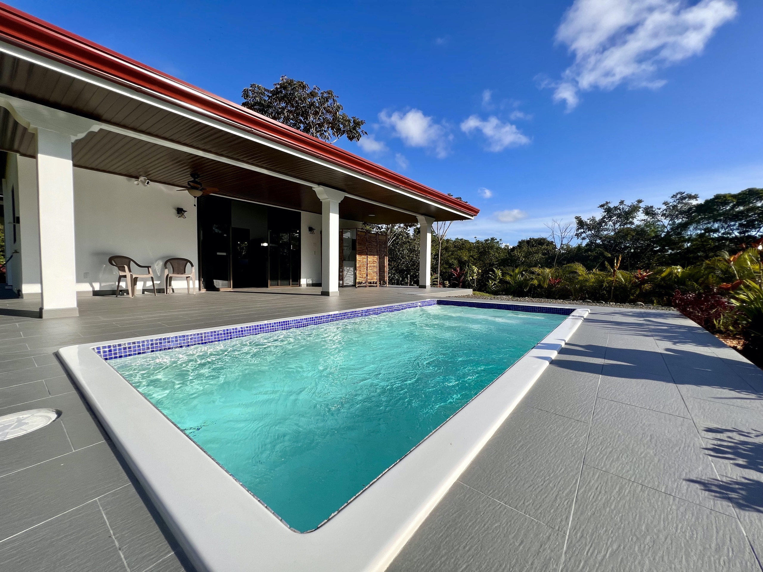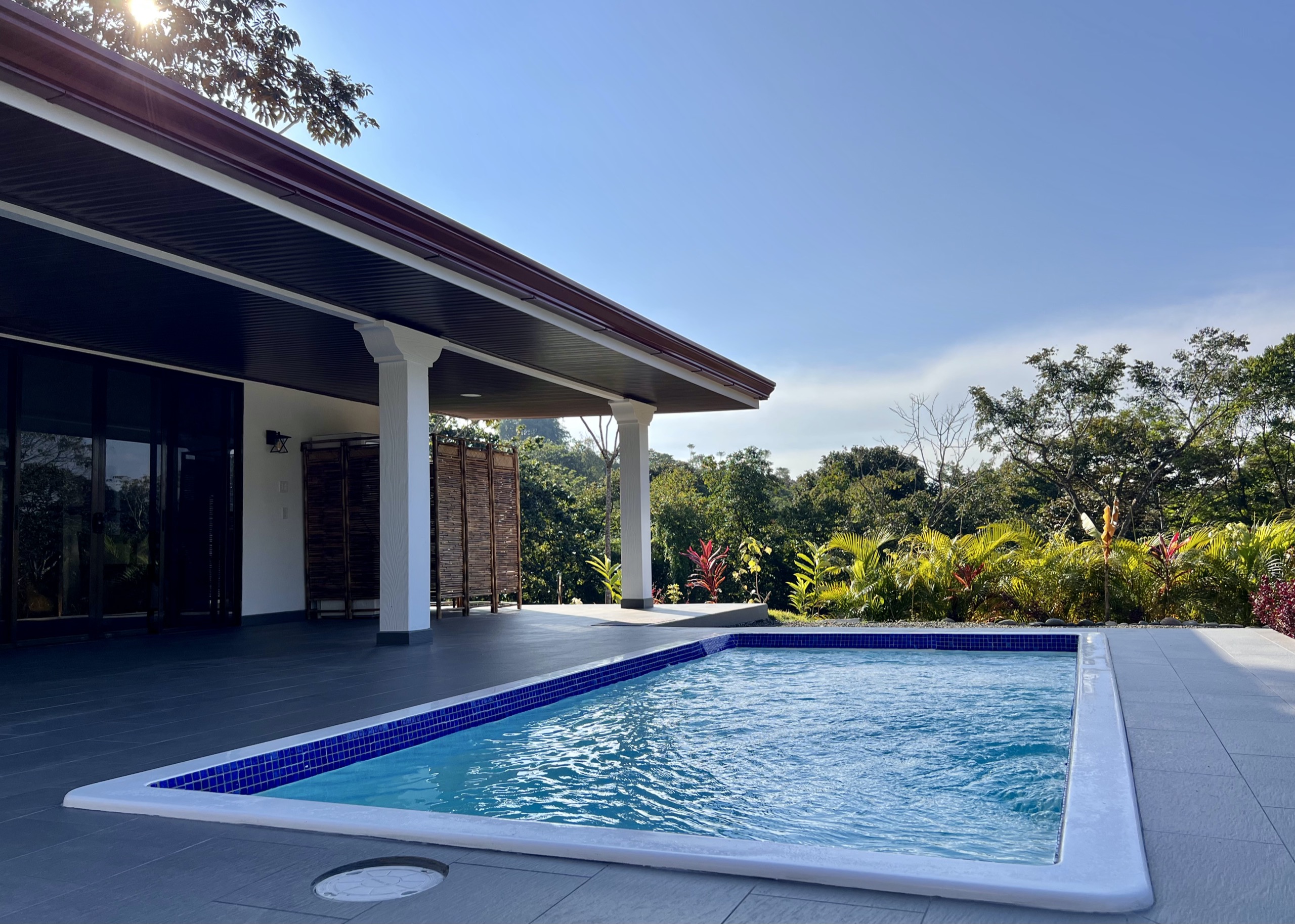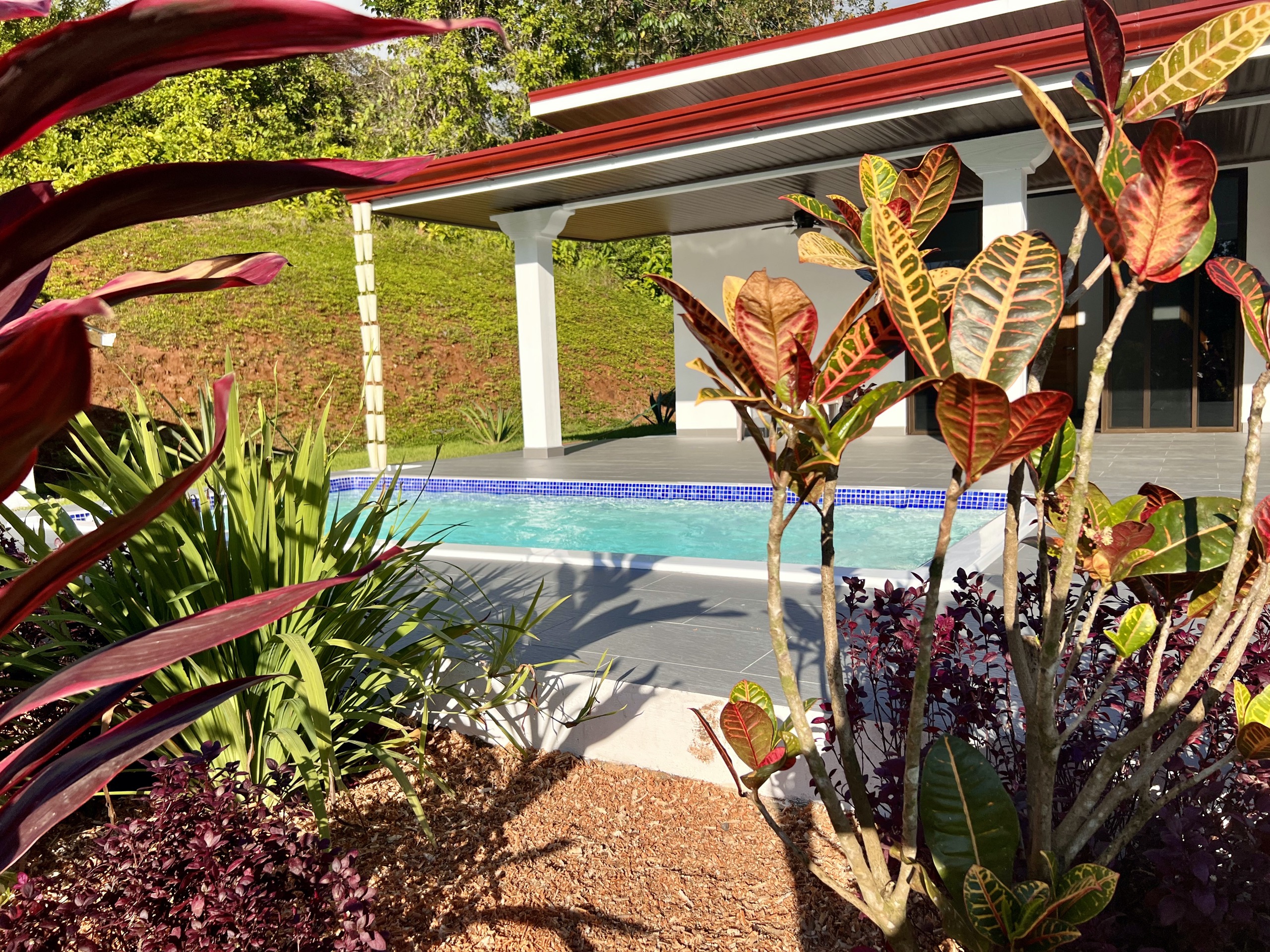 The salt pool (2x4m) surrounded by colorful plants is located just in front of the large terrace where you will enjoy lounging all day long. Unless you take your morning coffee on the back terrace of the house, also sheltered, to enjoy the soft glow of sunrise and the splendid light reflected by the lush vegetation and the mountain.