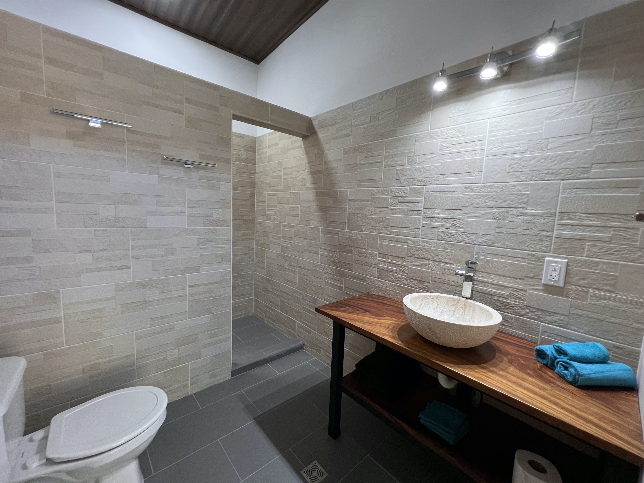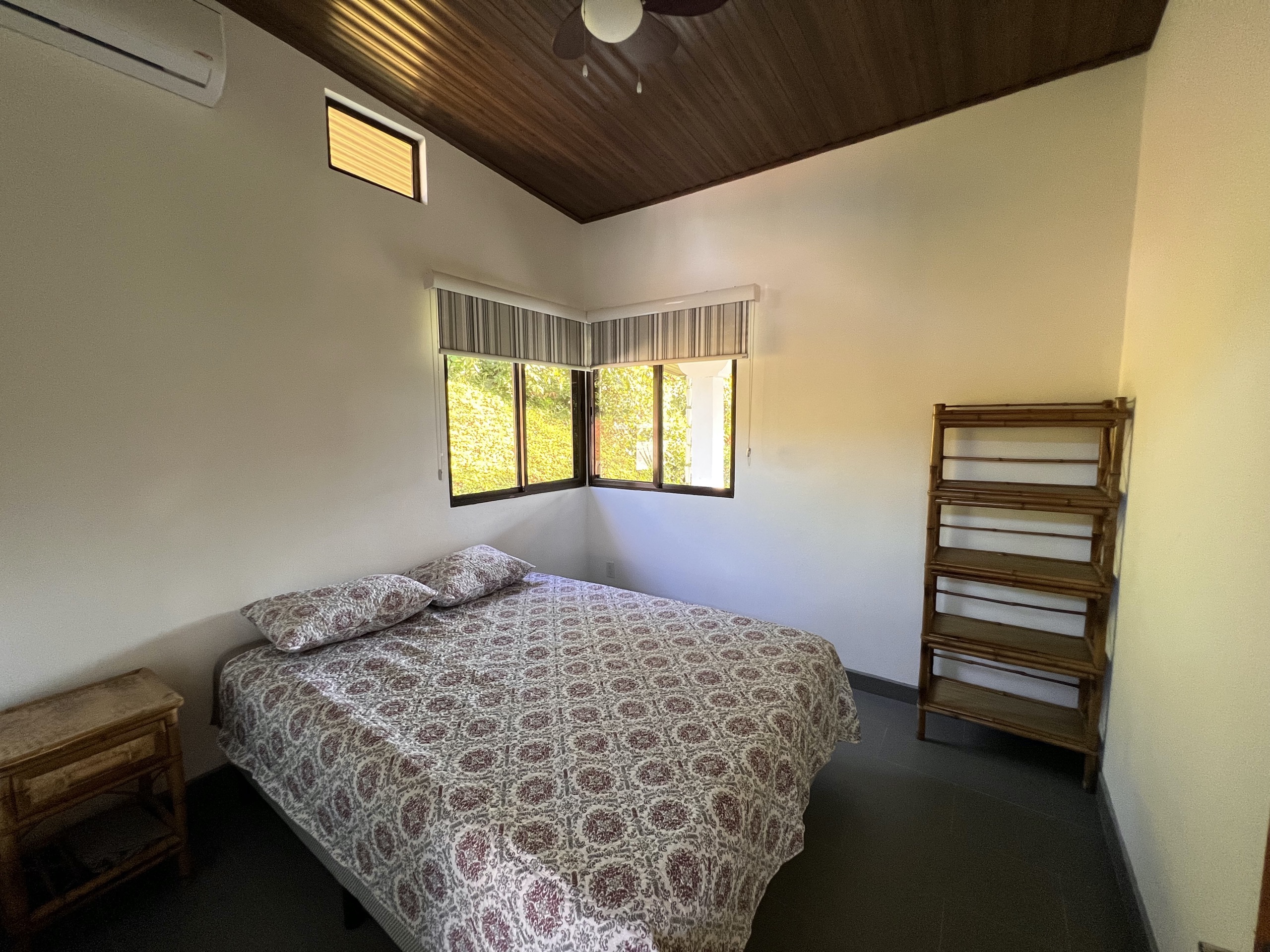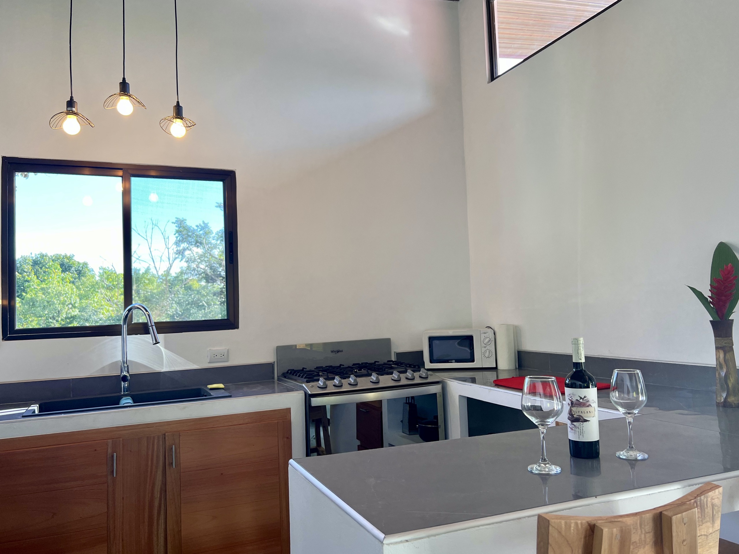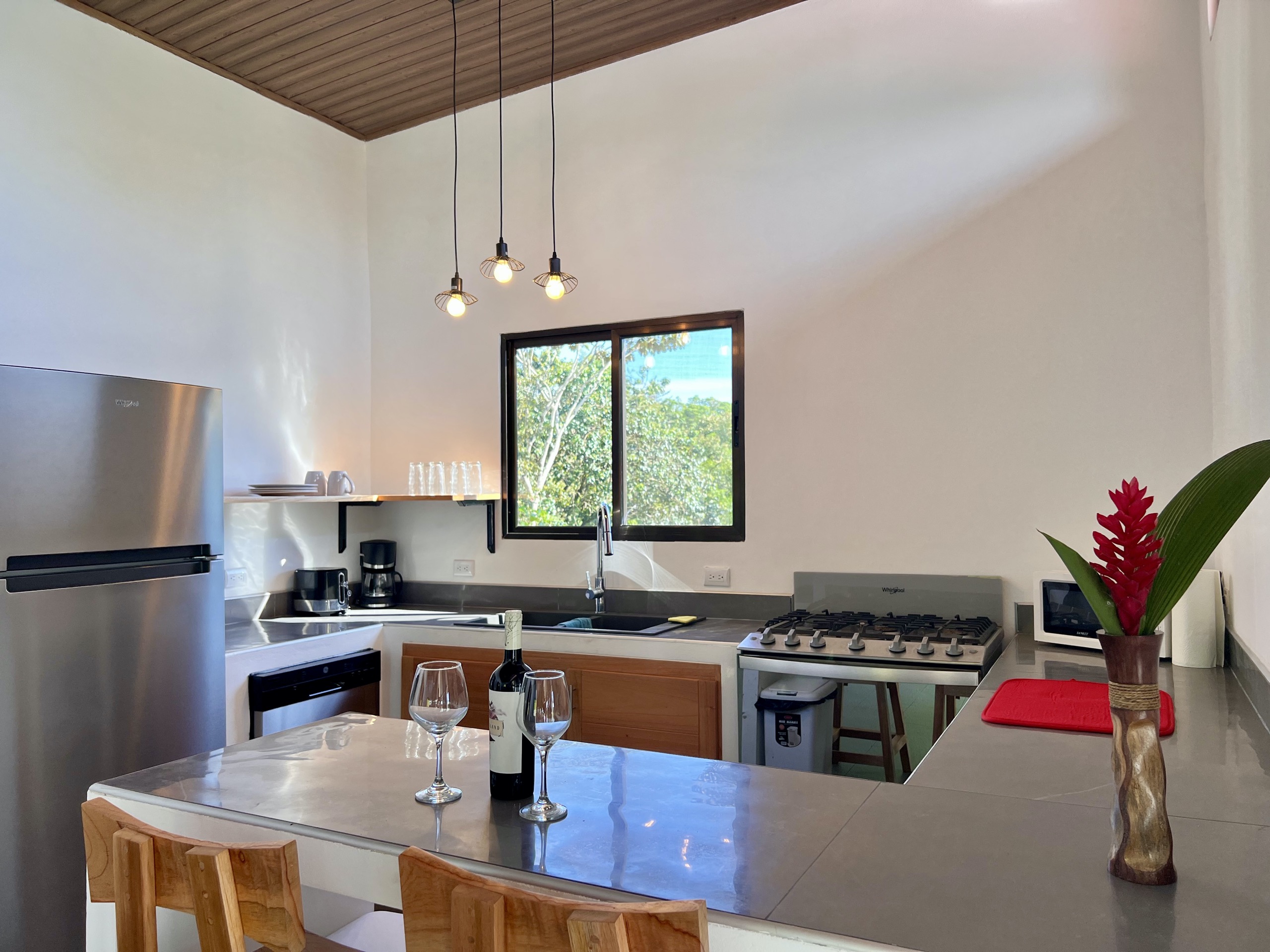 Each room, bright, equipped with a queen bed, has high ceilings with openings allowing good air circulation. You can also, depending on your preference, use the air conditioning. The kitchen, elegantly dressed in cedar, allows you to admire the landscape while sharing with your guests thanks to its opening onto the living room and the proximity of the terrace.
