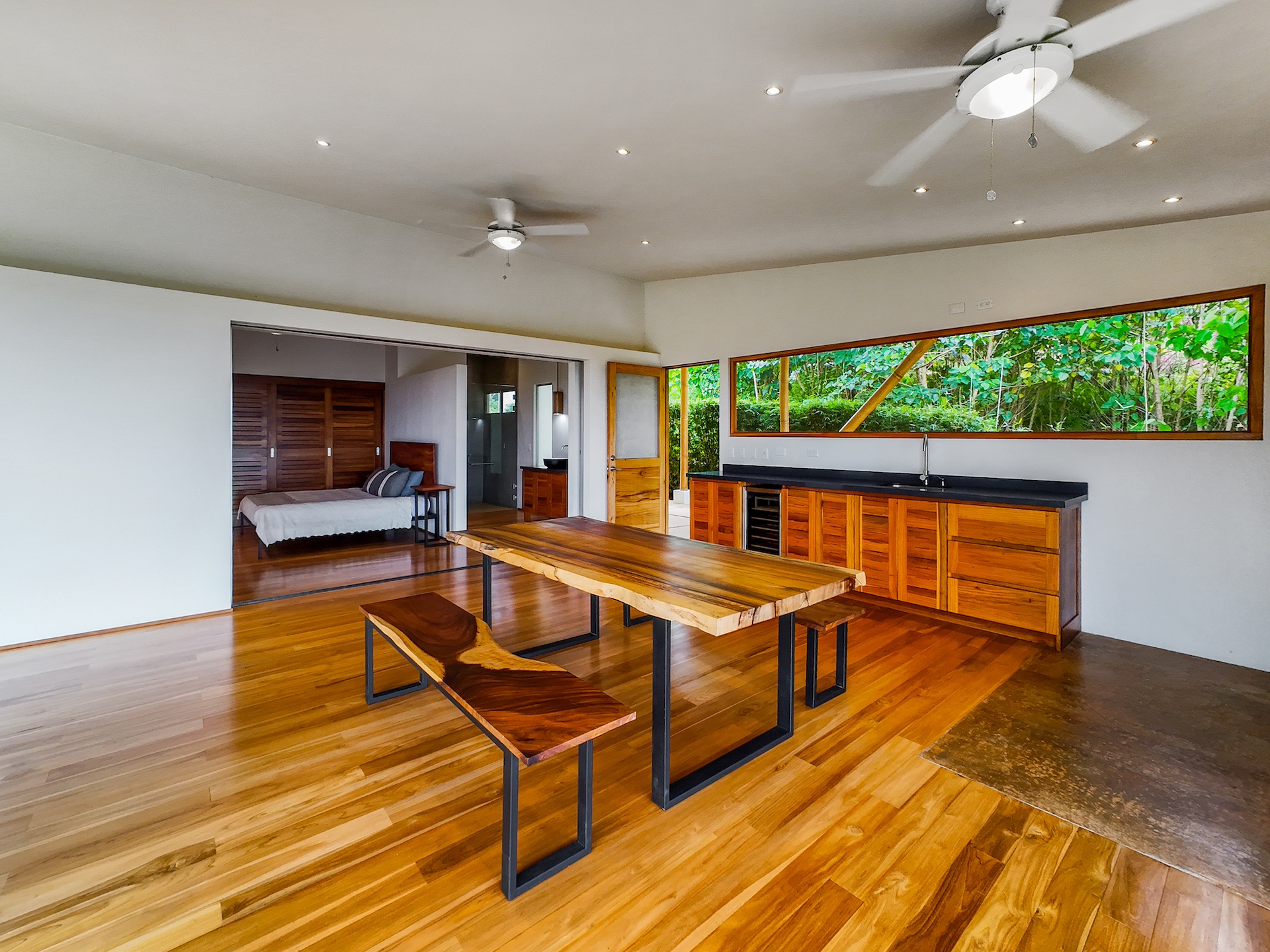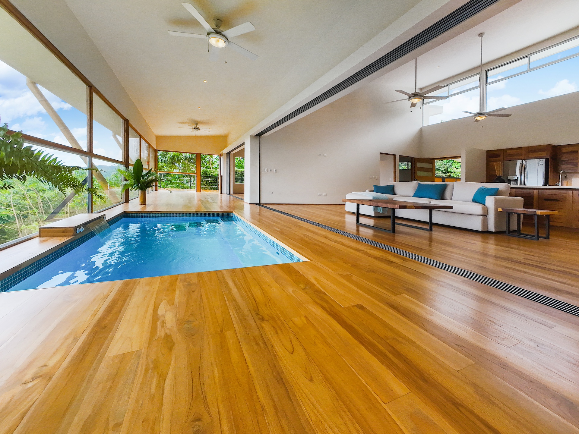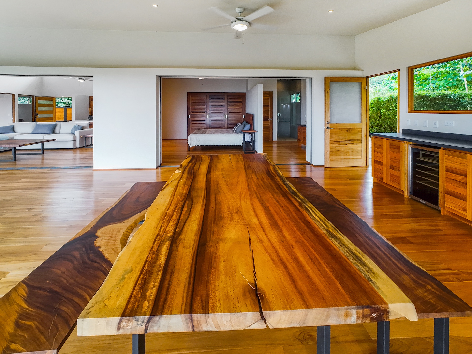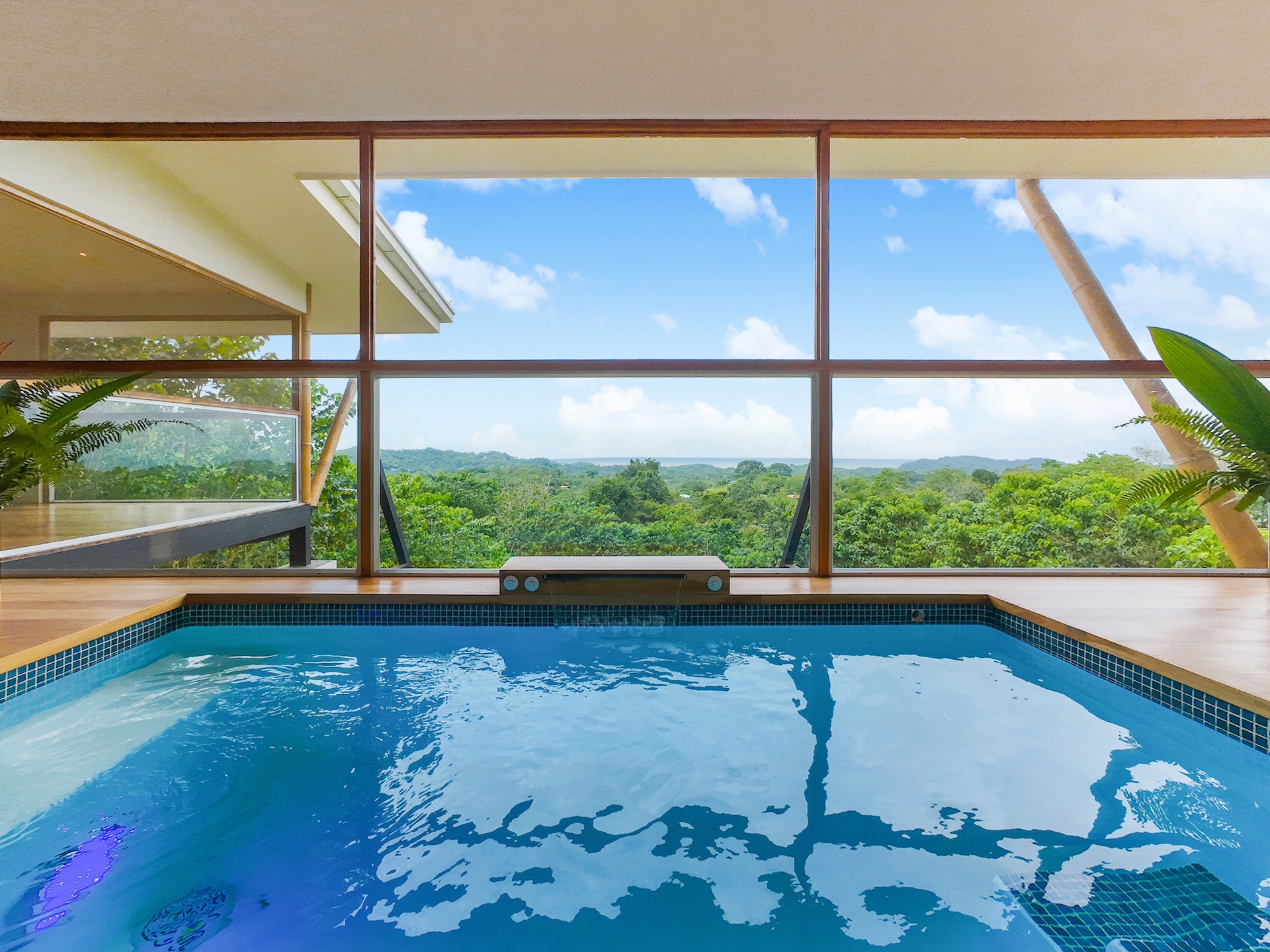 Built on the mountain skirt and architecturally designed with the wind course in mind, this home integrates natural cooling elements seamlessly. As you walk in, it is a sensory experience: your eyes are drawn to the expansive ocean view, while the warm comfort and feel of the exotic woods throughout eases you. The exotic teak wood covers both the interior and terrace floors, and the design details of 6-inch diameter Guadua Angustifolia bamboo evoke a natural ambiance as you are further soothed by the calming sounds of the pool’s water fountain.
