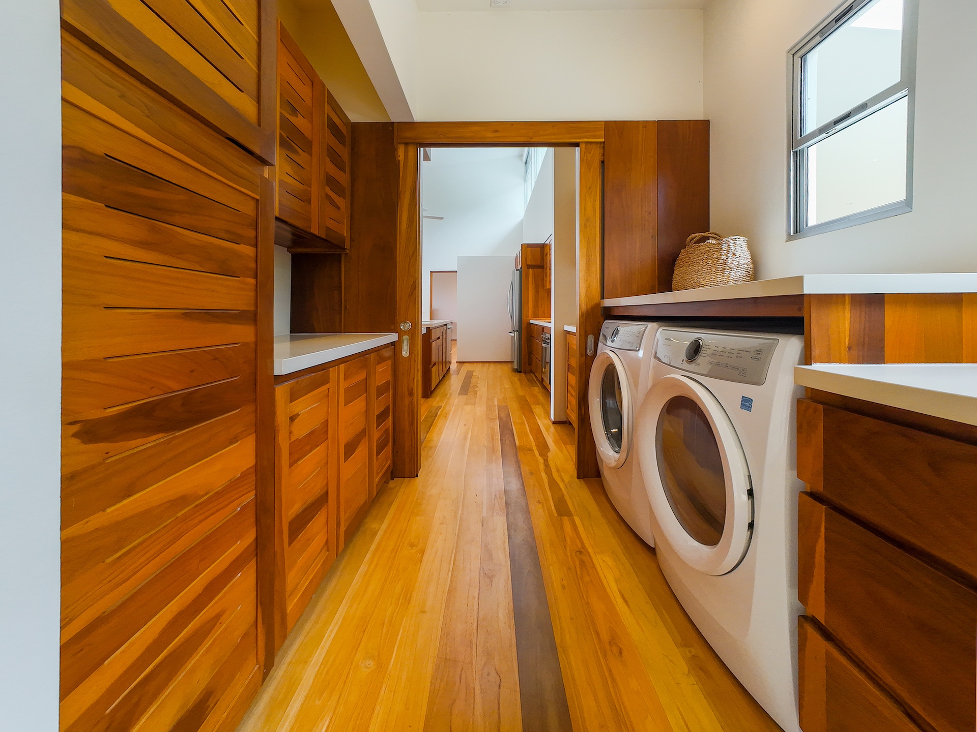 Adjacent to the kitchen, a thoughtfully designed butlers pantry with pocket doors provides extra storage and versatility as a pantry, laundry room, and mudroom, conveniently located next to the carport.
