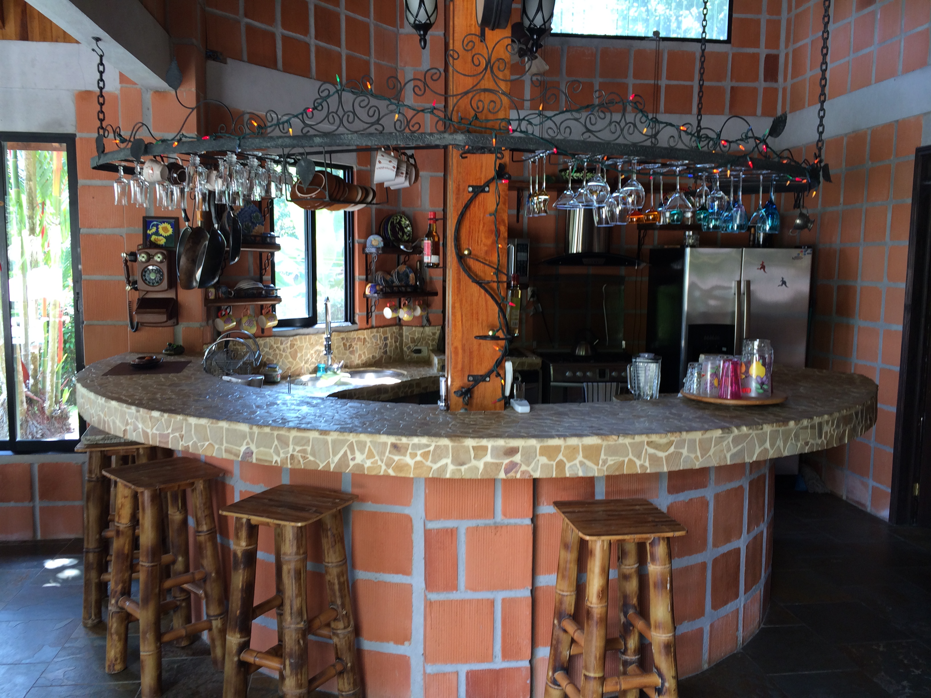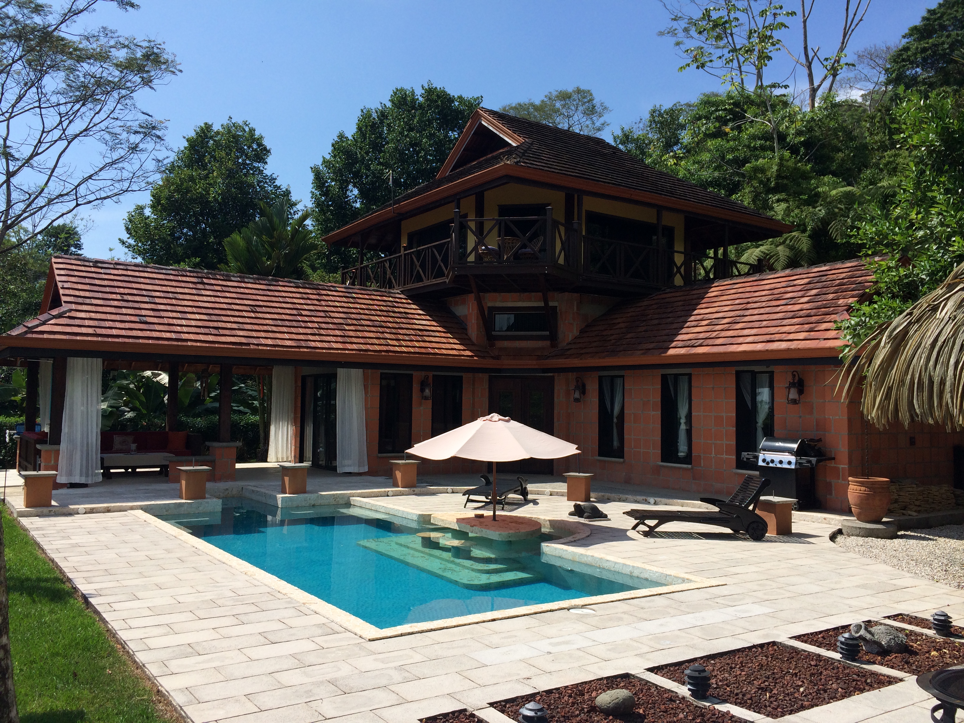 A blend of Spanish charm....Authentic Mexican-fired, ceramic tile, mixed with exotic hardwood. This custom built, open concept, Ocean view home offers a little bit of everything! Located in a private setting, but only minutes from town. Beautiful, sweeping jungle canopy views lead to the Pacific Ocean, including views of Cano Island. This 1.25 acre property borders a year round river with beautiful tropical trees that are frequented by Howler monkeys. The day I viewed this house there was a family of monkeys located in a tree only 25 feet from the outdoor living area/covered terrace.