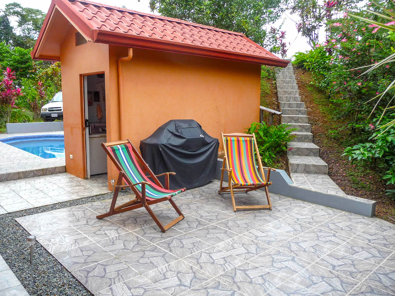Large 360-degree ocean view building area with a Mountain View guesthouse and pool is available for purchase. Build your dream Ocean View house while living in the guesthouse. This property is 3 kilometers from the Coastal Highway through the village of Tres Rios. The guesthouse is built by one of the premier builders in the Southern Zone and comes fully turnkey (just bring your suitcase). The upper building site is large with a 360-degree view and is ready for your dream house. You can hear the water flowing from the creek below. The property has been landscaped with tropical plants and fruit trees.