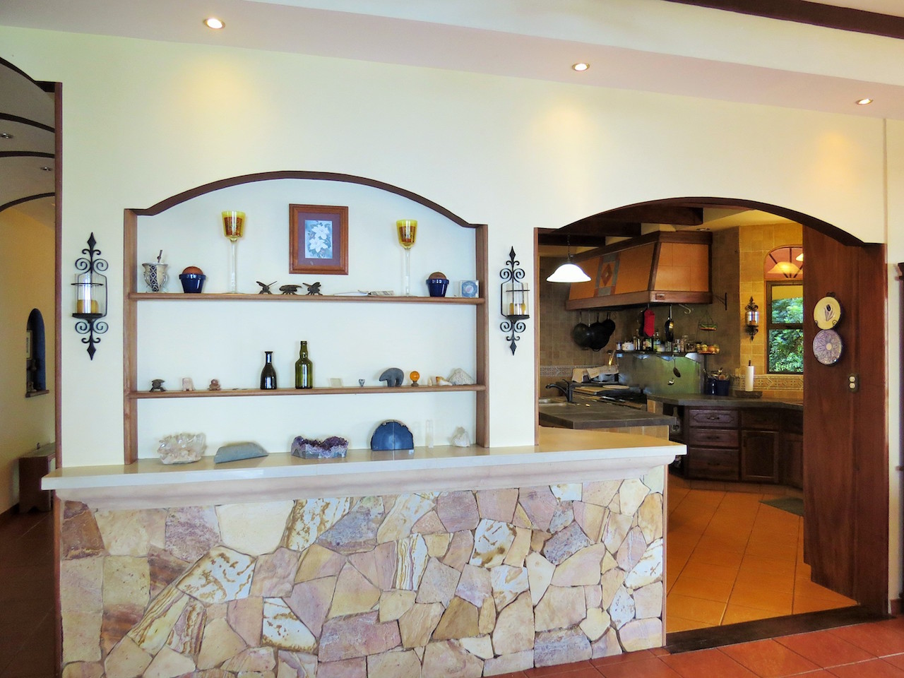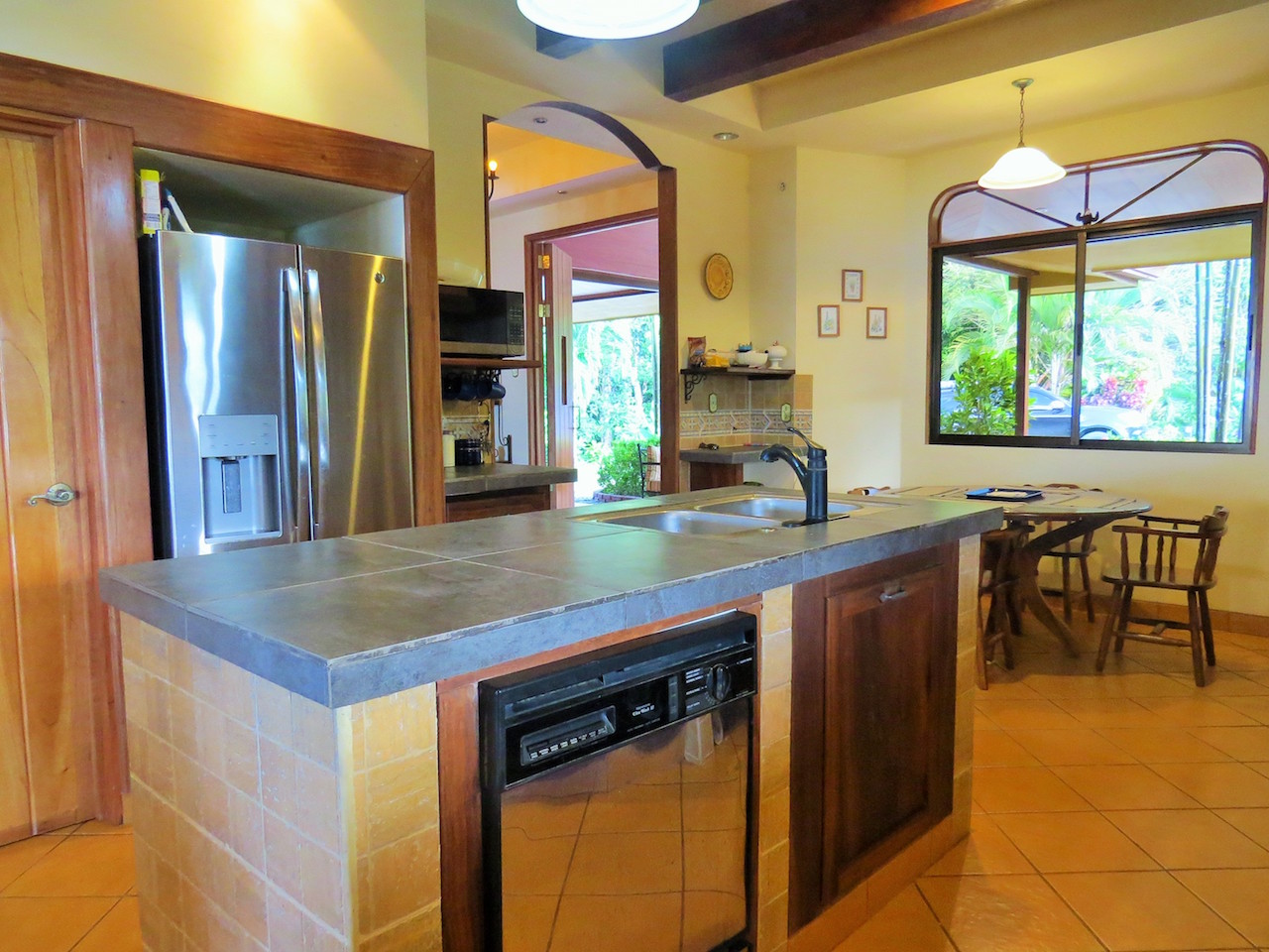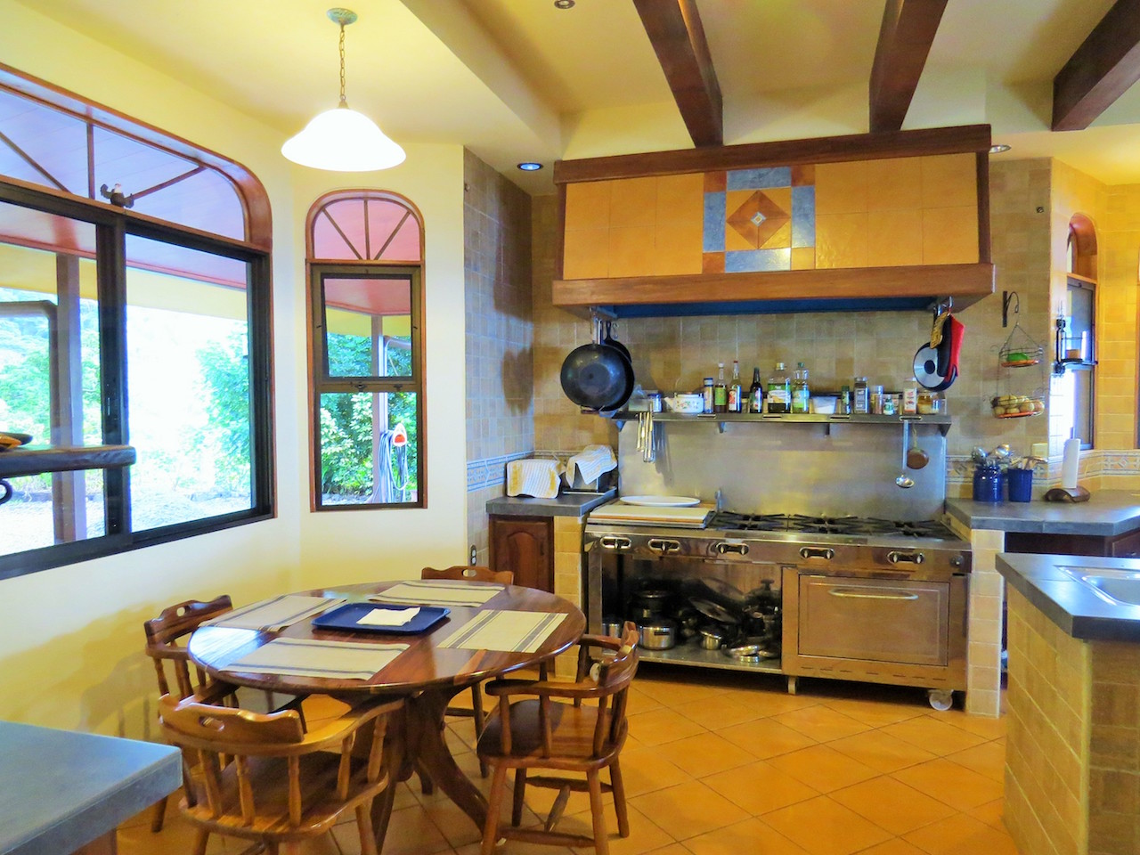 A LARGE AND FRIENDLY KITCHEN. Warm and welcoming with something good on the stove. It͛s the room where your family will head for when they come home. A professional kitchen with stainless steel 8 burner gas stove, and oven. Professional pot racks keep pots, pans, and whisks at arm͛s length while showing them off. The full-sized sink in the island gives double duty service for the two cook family.