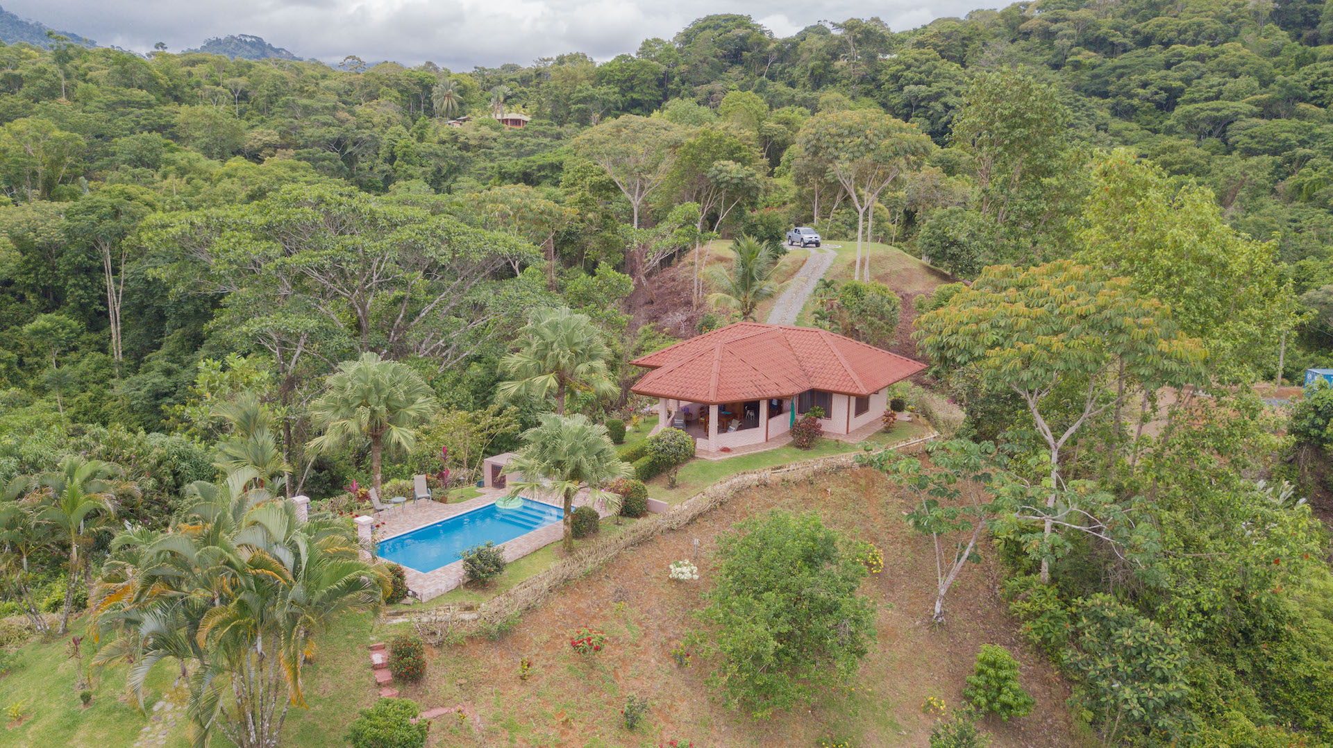 Gain access to the property via a concrete driveway, through an iron gate, then a gravel drive leads to to the house which is nicely set back from the road for privacy. Much of the nearly 5-acre property is landscaped, with many palms, flowering plants, and you can pick your own fruit from a wide variety of maturing fruit trees. The mountains bring fresh, cool breezes morning and evenings, and throughout the day you will enjoy the ocean breeze.