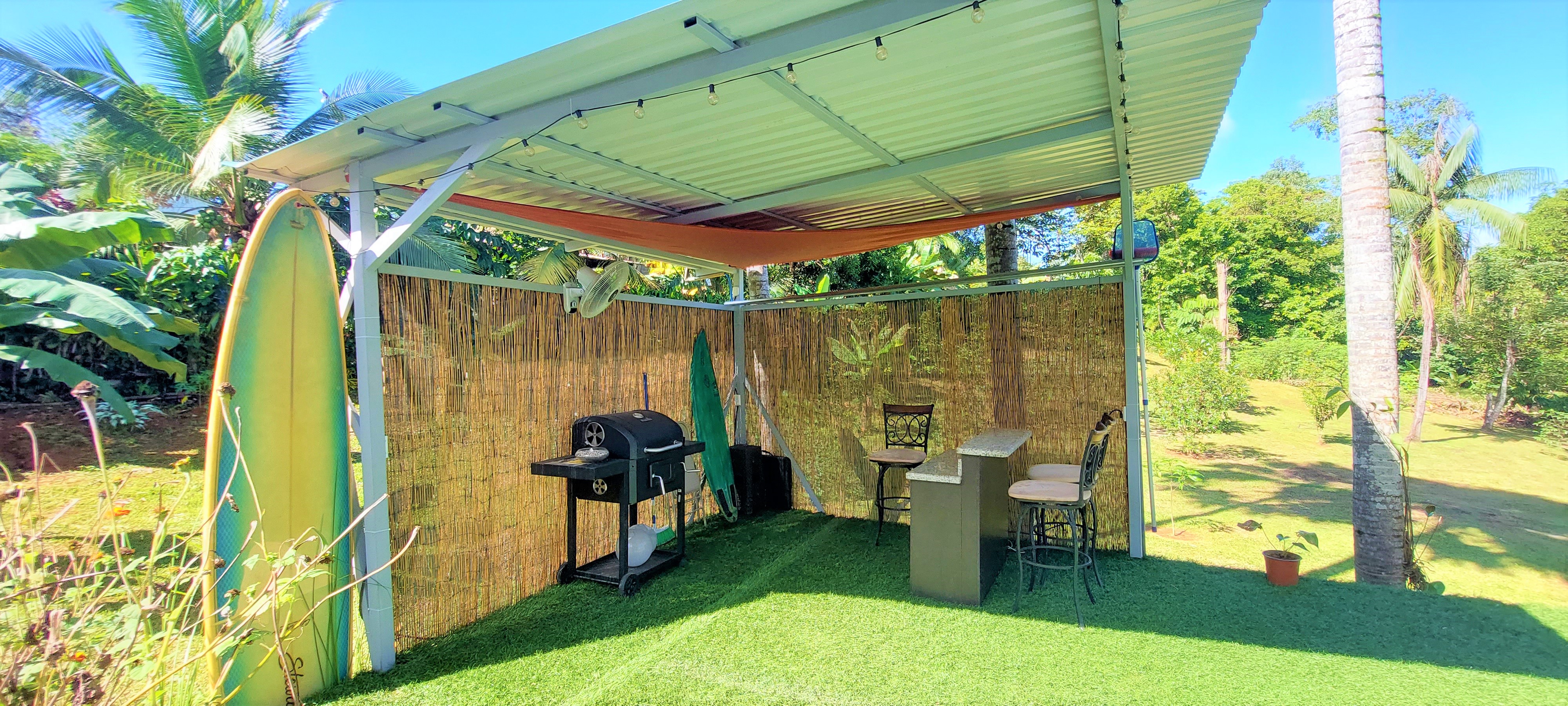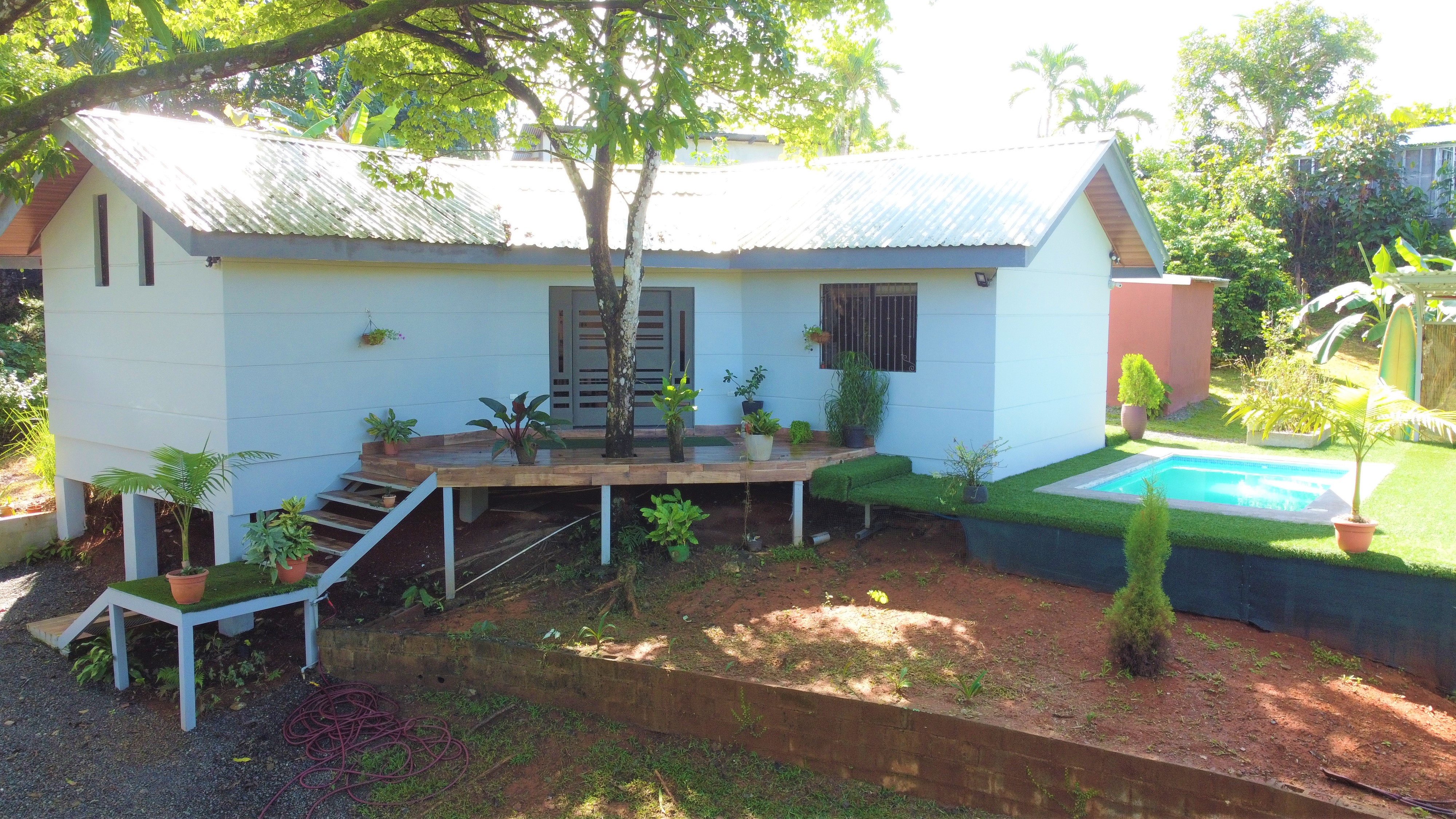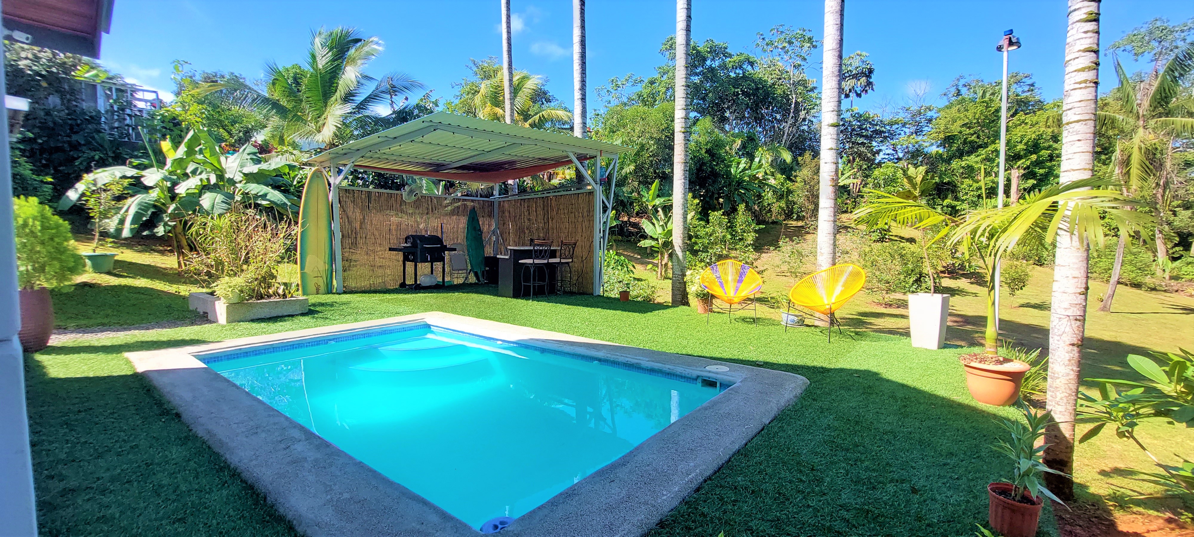The gardens are filled with tropical flowers, palm trees and a full assortment of mature fruit trees producing a bounty of fresh and delicious limes, mandarins, oranges, soursop (guanabana), guava, water apples, lychee, mango, bananas, plantain, stair fruit and avocados along with yuca plants, herbs and much more.
