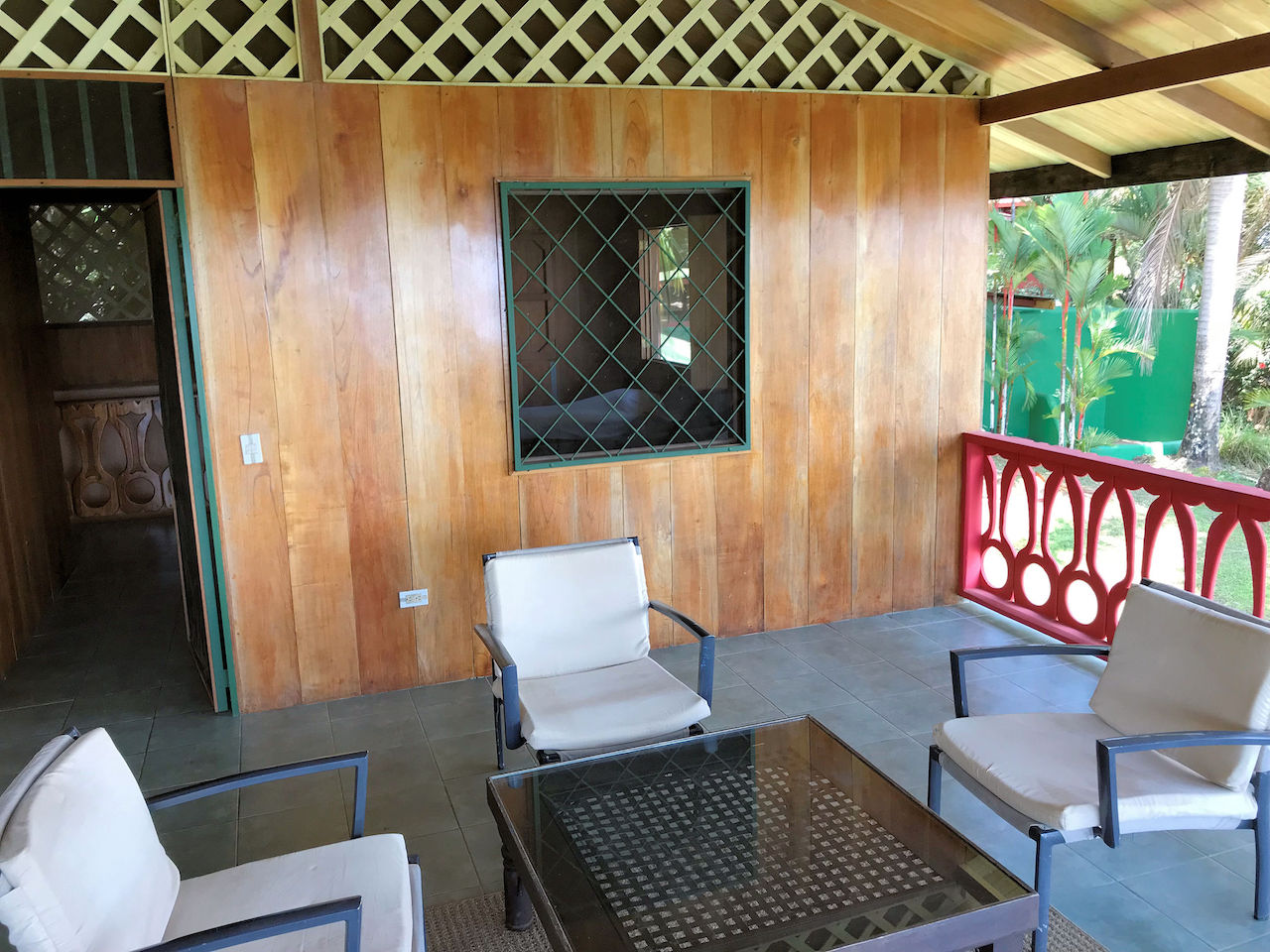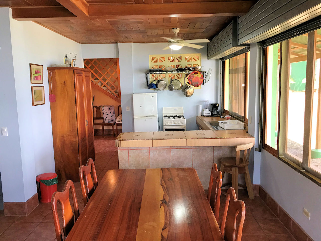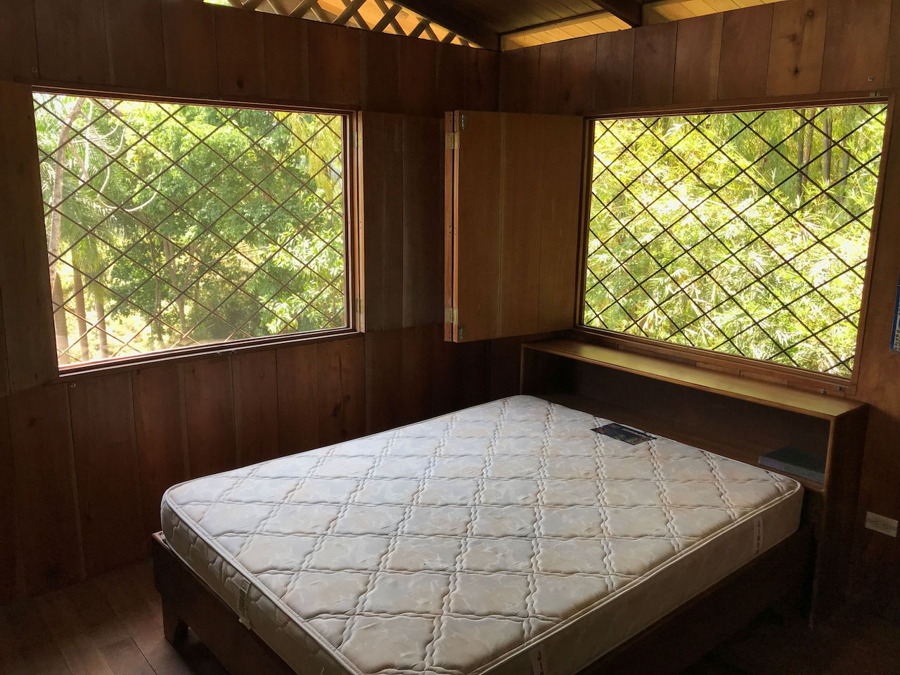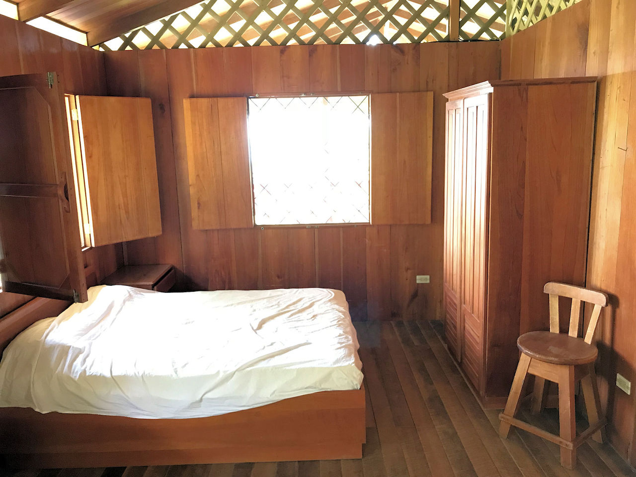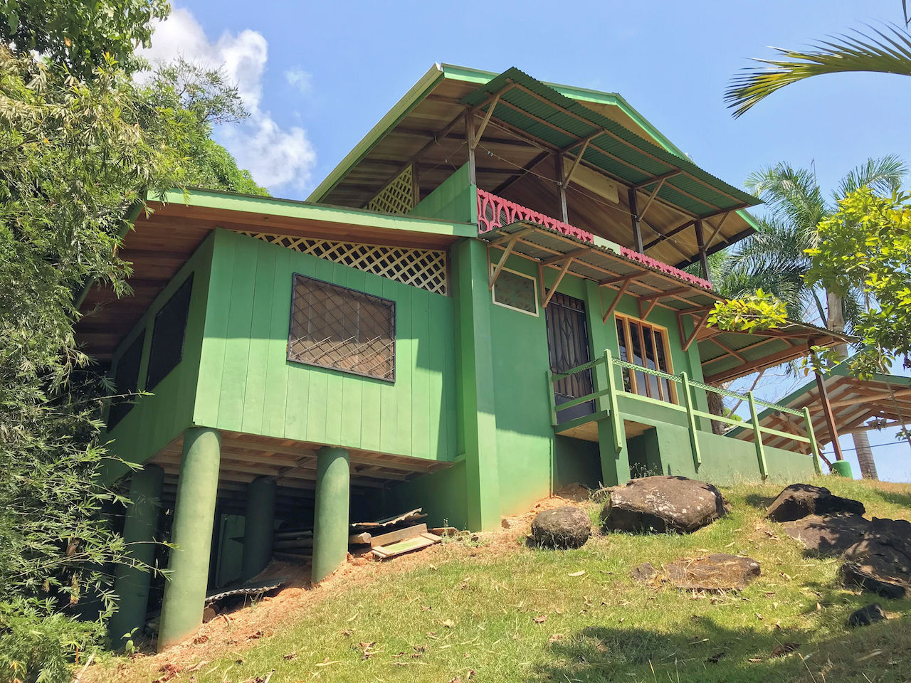 The house has a rustic feel with wooden shutters on the windows. The lower bedroom is large and opens to screened windows all around that look out onto the jungle and that allow for a constant cool ocean breezes. The downstairs is made up of the bedroom, bathroom, kitchen, living area and laundry. Upstairs is essentially an en suite master. There is a large area for the bedroom with an adjoining open air patio-like sitting area that looks out over the pool, beach, ocean and whales tail. The bathroom comes off of the patio area. This is truly in indoor/outdoor tropical lifestyle home.