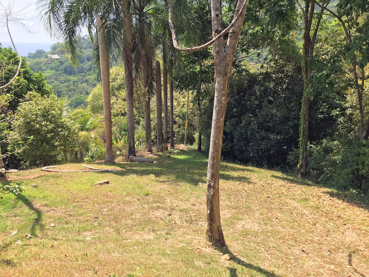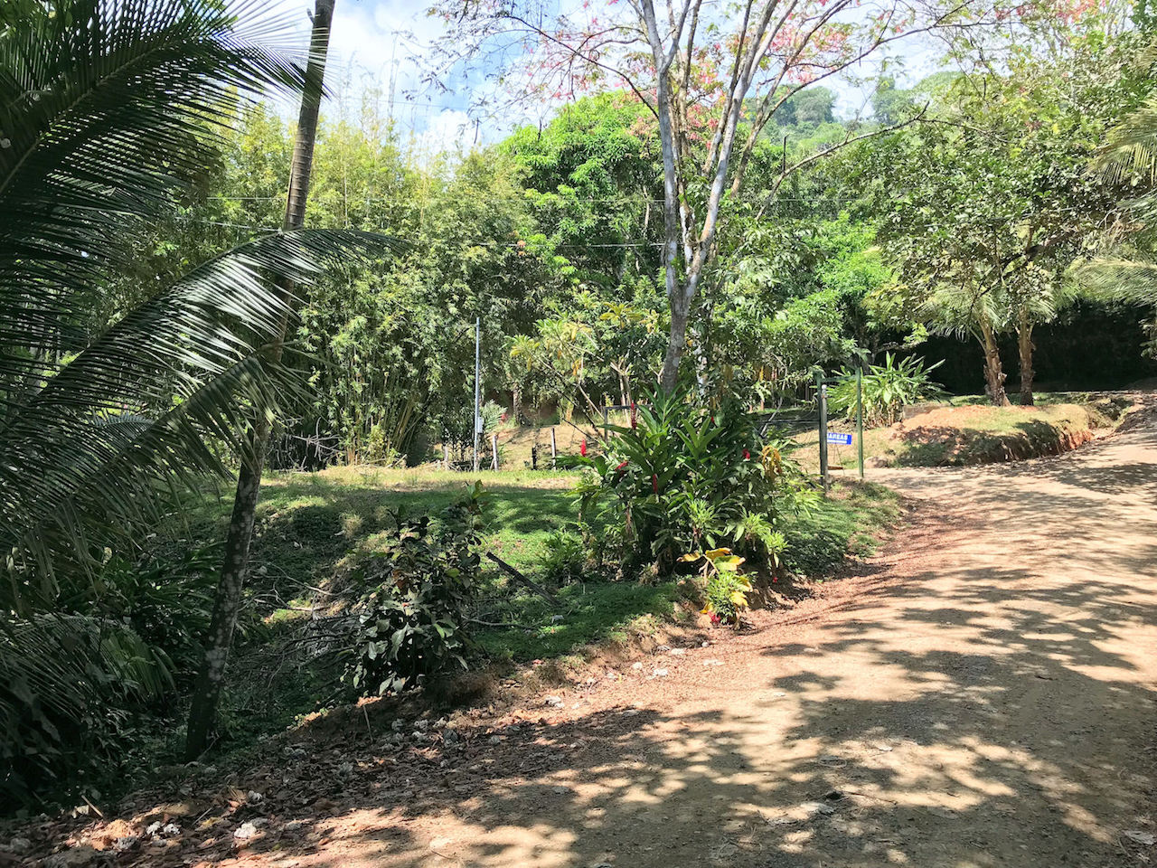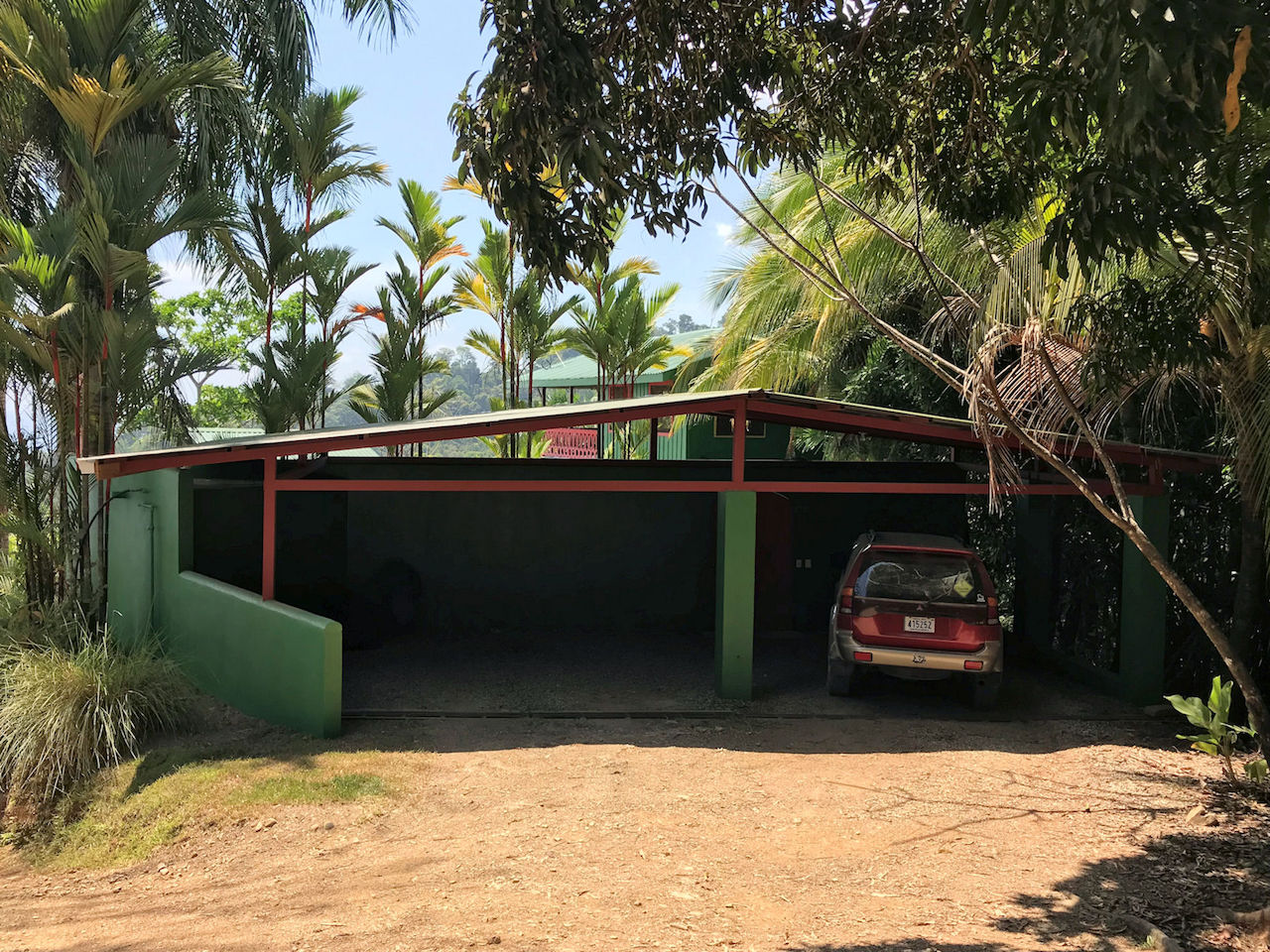 Upon arriving to the house, you get out of your car and pass through the painted 3 meter tall block-wall and enter into the private yard and the walkway to the house. On the inside of the wall is a double headed outdoor shower. The infinity pool is a bit further down in the yard with the ocean as a backdrop. There are fruit trees on the property and the grounds are well maintained.