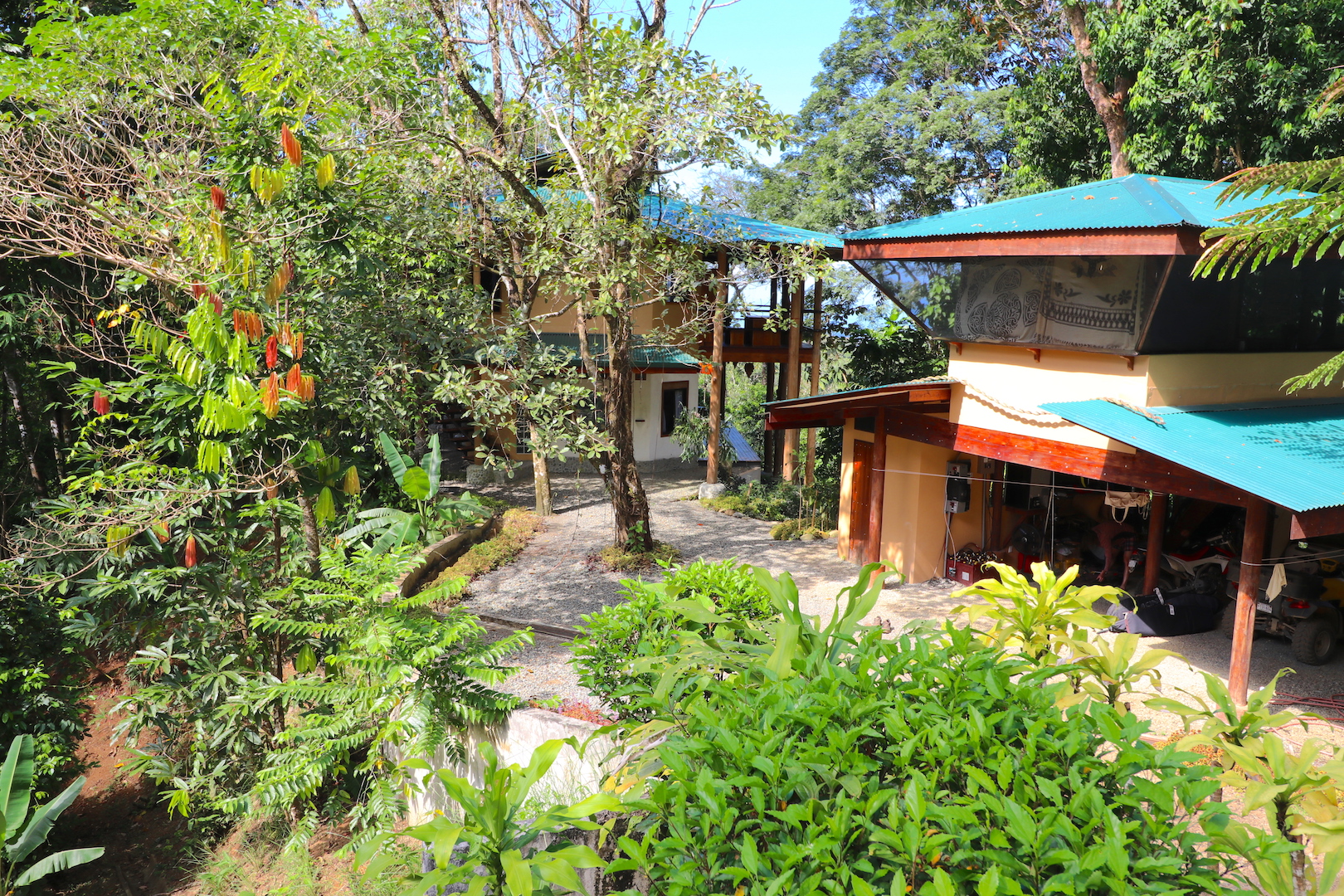 Above the 2-car garage is the second bedroom, which has a custom hardwood bed frame, dressers, shelving and LED lighting fixtures. There is an indoor/outdoor shower facing the jungle and a kitchen. The garage has a washer and dryer, surfboard storage and a $20,000 solar-installation that powers the entire property. The development now has electrical power delivered to the property, so this is available to tap into if desired. Two All Terrain Vehicles that have been well maintained are included with the sale.