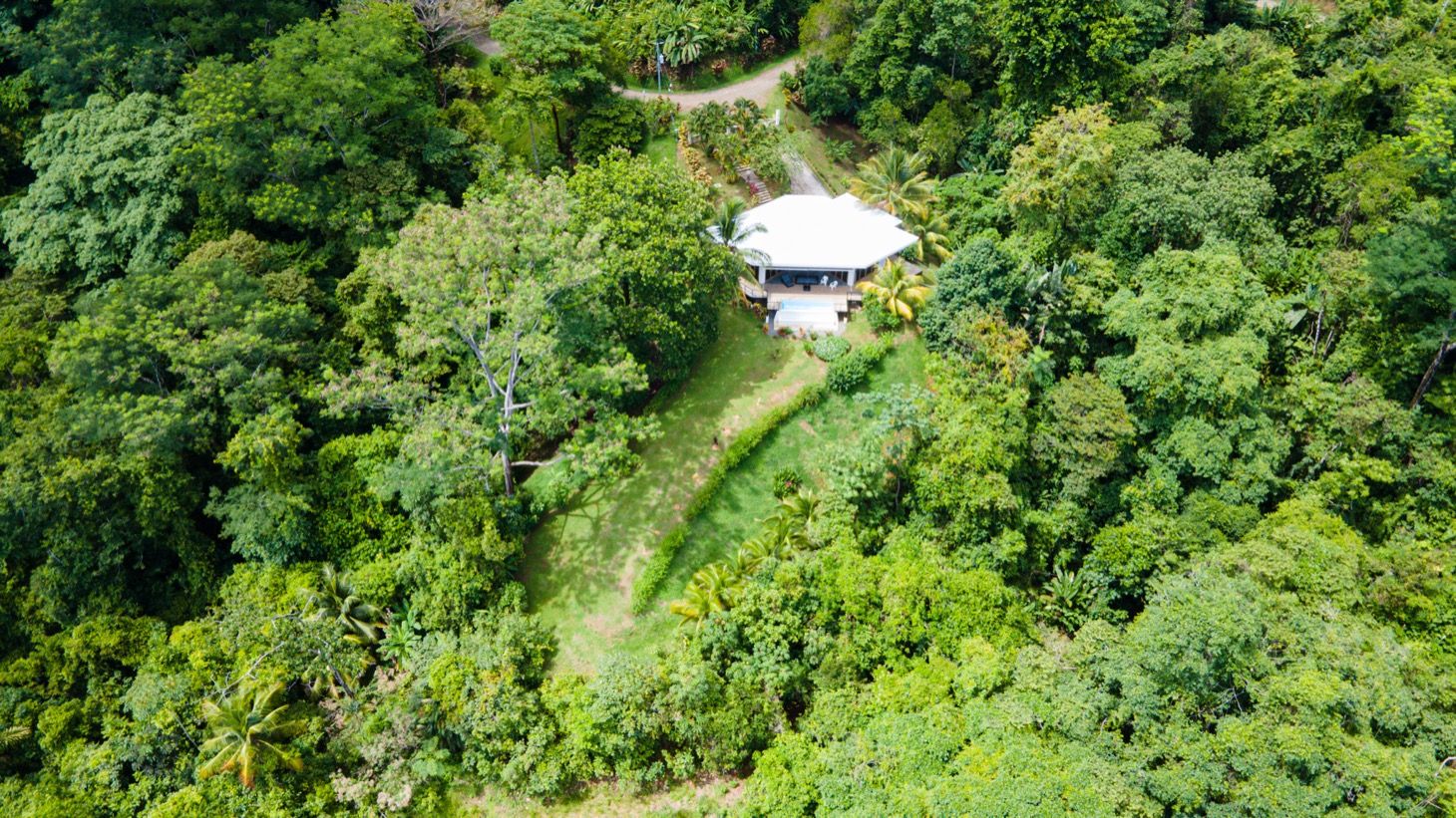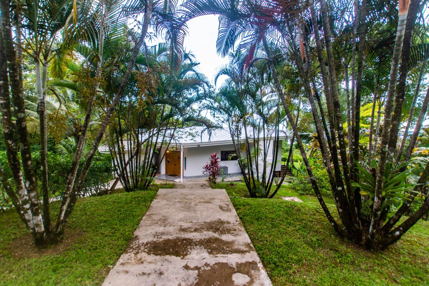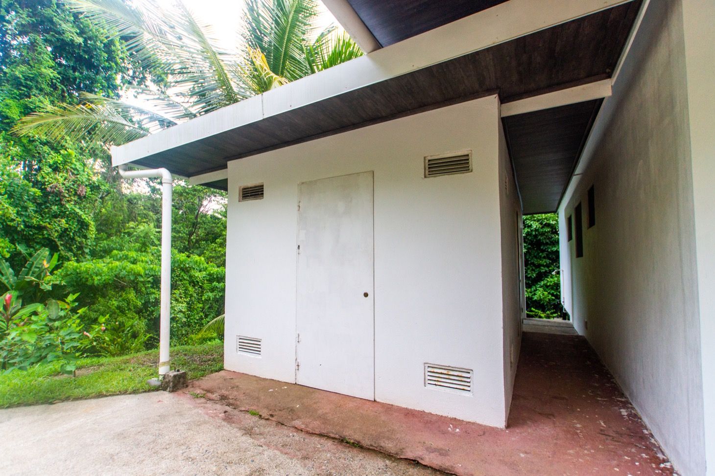 Enter the 3-acre property from a quiet road in a low population neighborhood that is lush with old-growth jungle. The sizable lot is fully landscaped with a thick, natural fence that provides great privacy. The paved driveway leads down to a spacious parking area at the entrance to the home.