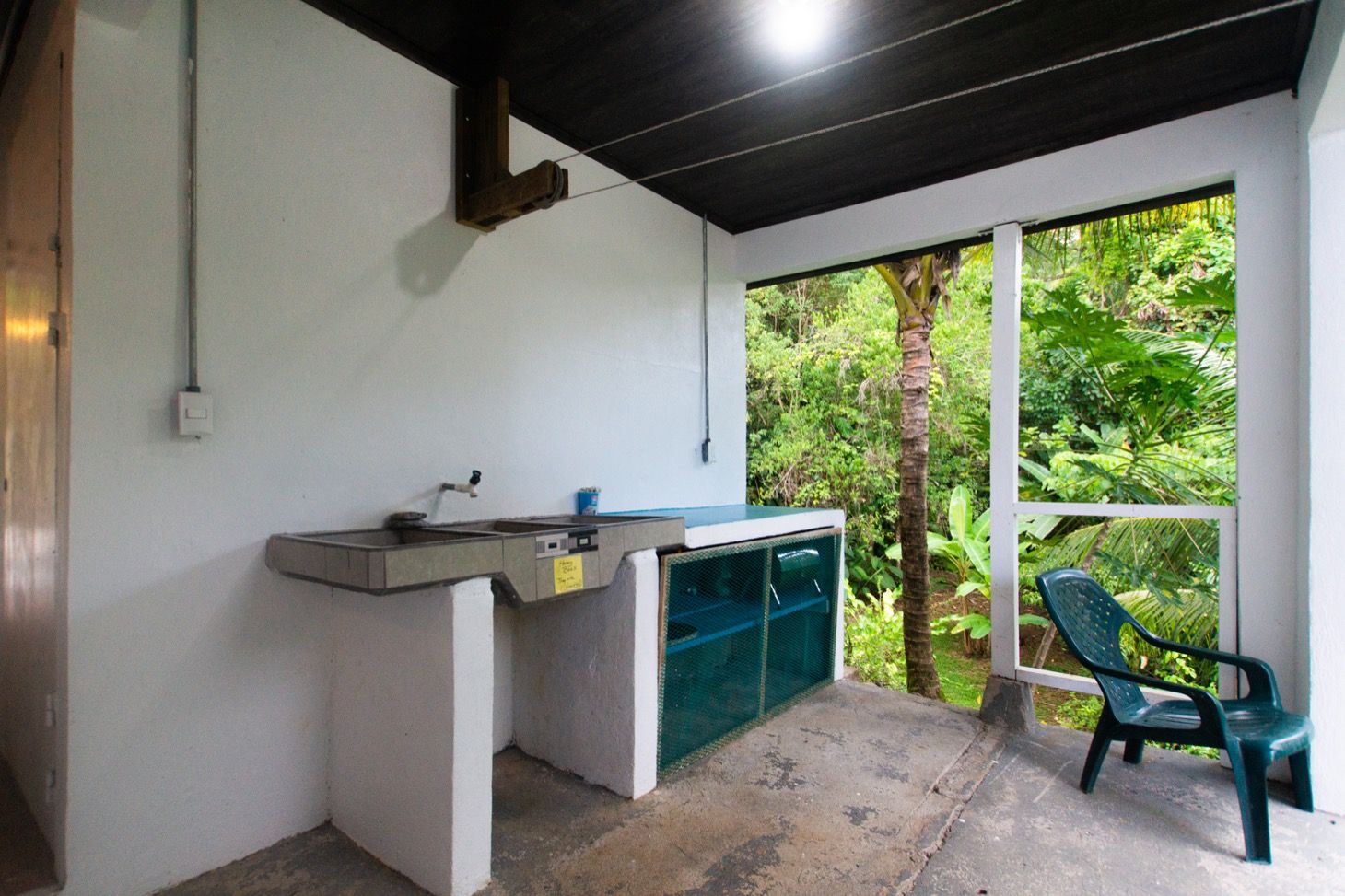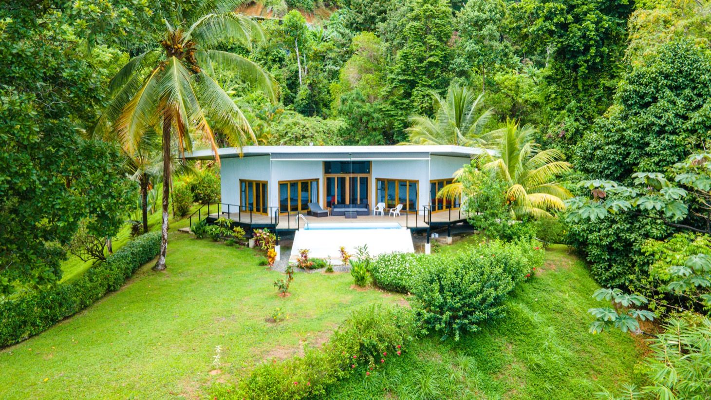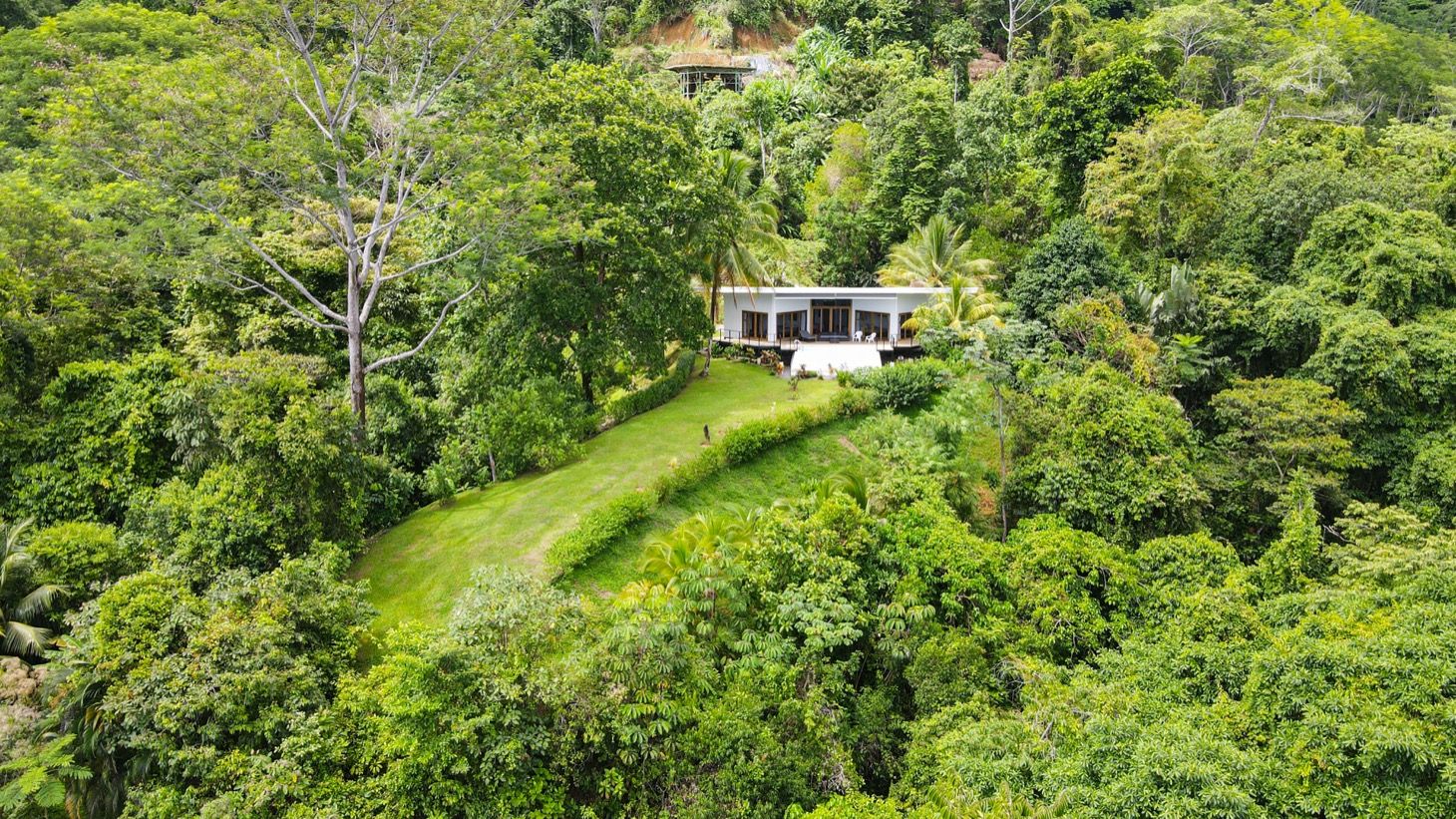 Enter the 3-acre property from a quiet road in a low population neighborhood that is lush with old-growth jungle. The sizable lot is fully landscaped with a thick, natural fence that provides great privacy. The paved driveway leads down to a spacious parking area at the entrance to the home.