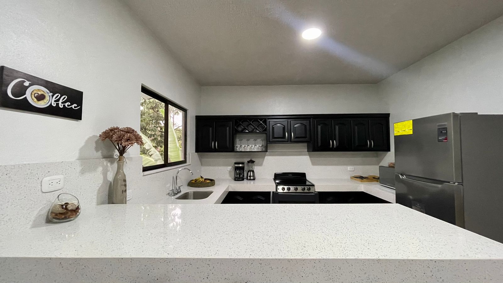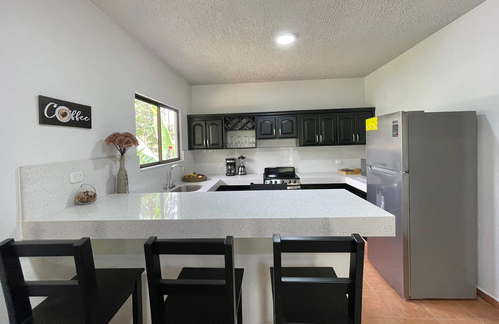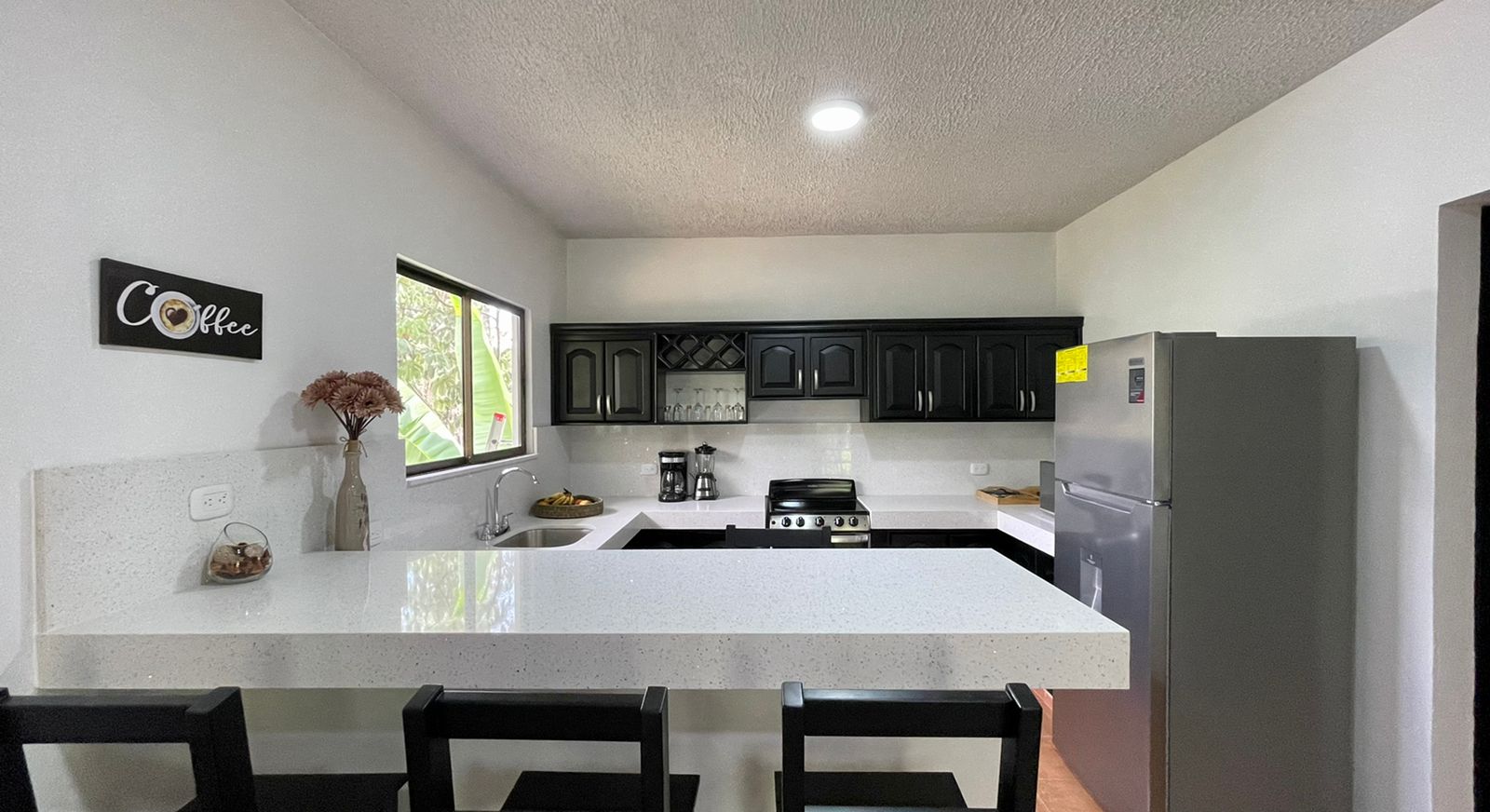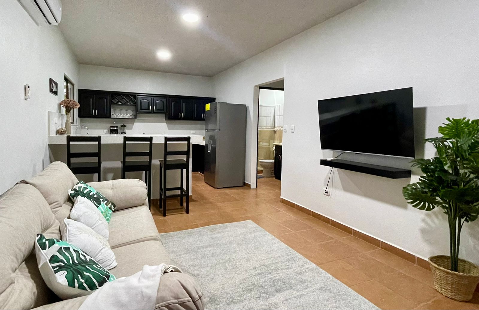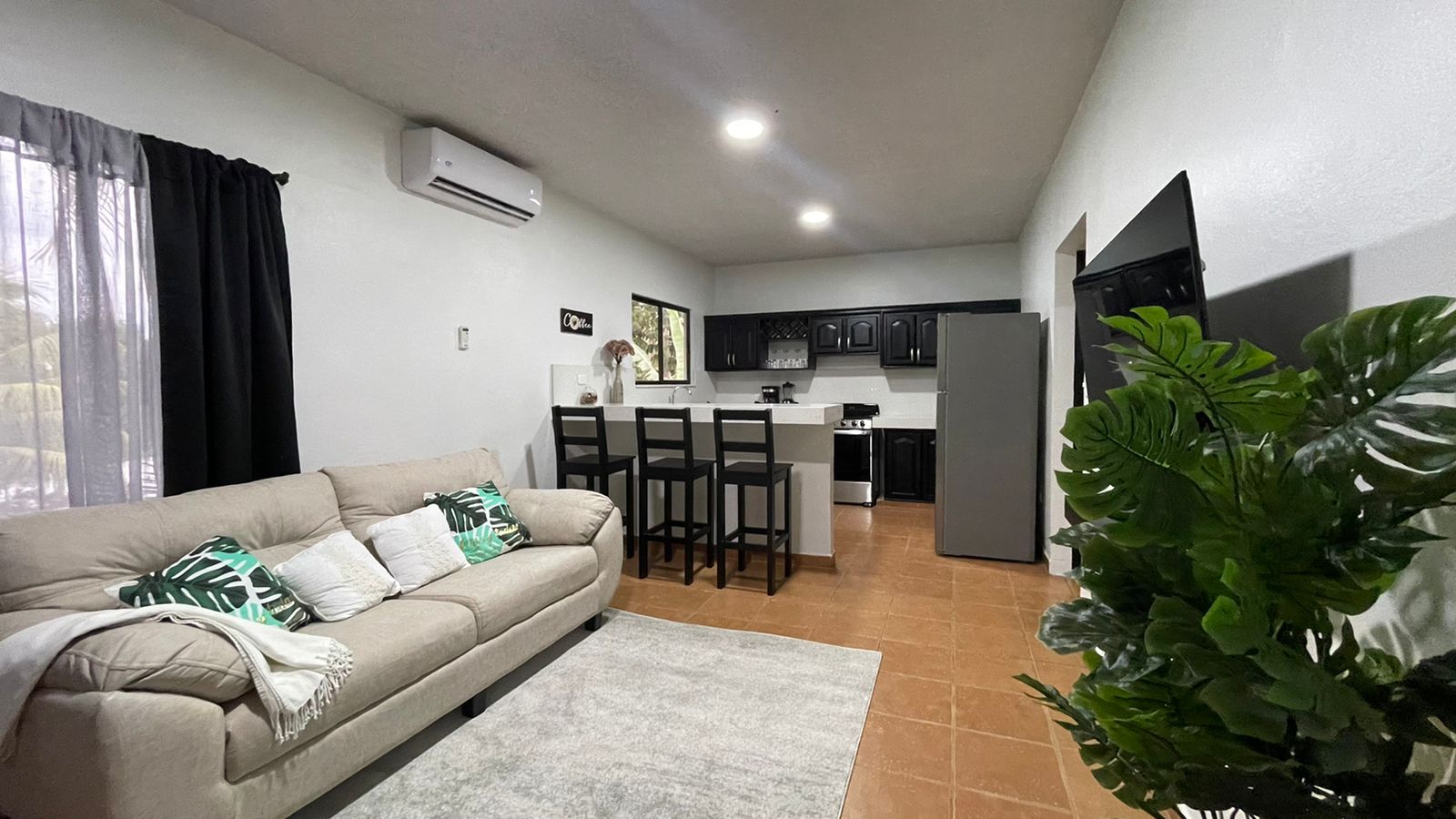 The two newly remodeled apartments are siting on a 872 sq.m lot with a 20 meter long drive way from the main road creating more privacy on this property for you and your clients, yet with the benefits of being on a public road. The two units are identical, a small out door terrace that opens up to the living room with big sliding glass windows, sofa and 50" TV to entertain everyone in the apartment, the modern white quartz counter tops and the black stain kitchen cabinets look fantastic. The large breakfast nook with 4 bar stools, colonial ceramic tile on the bath rooms and spacious laundry room, very confortable master bedroom with a queen size bed, night table, built in closet and A/C for the hotter days.