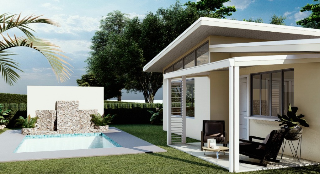 Privacy abounds on this property with a long driveway from the main public road to the house. A beautiful modern 2 bed, 1 bath home with sliding glass windows in every room on the house to let the air flow through. It will come furnished throughout the kitchen and living room - A/C, sofa, Coffee table and TV in the living room. White quartz counter tops in the kitchen decorated with backsplash tile, stainless steel stove/oven, refrigerator and dishwasher. Two full bedrooms with queen size beds, 2 night table, A/C and built in closets. The spacious bathroom has a beautiful combination of tiles. The dining area is outside on the covered terrace with a view of the water coming down the waterfall into the swimming pool, creating a relaxing sound of the water.