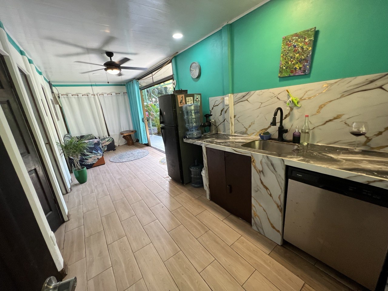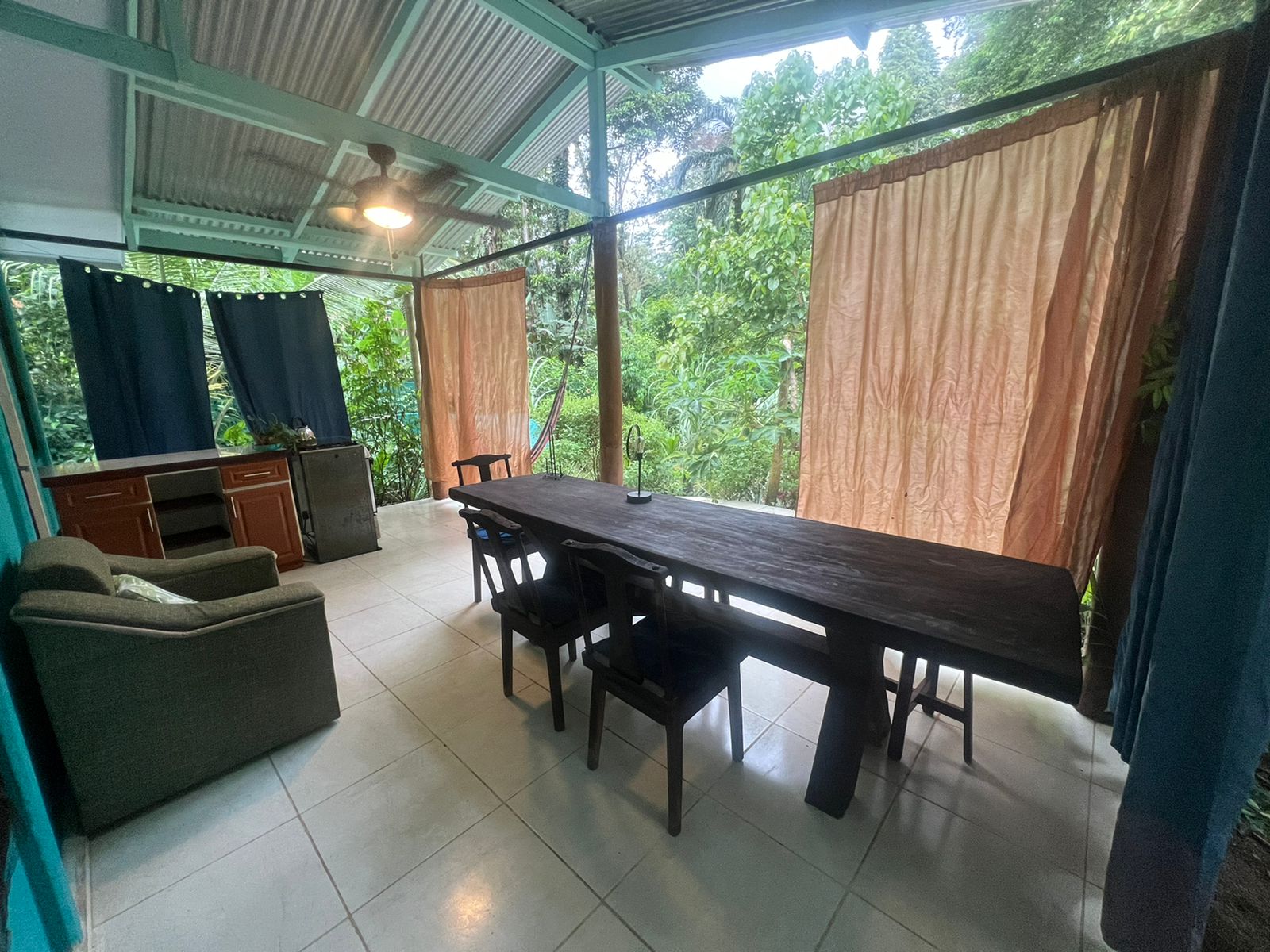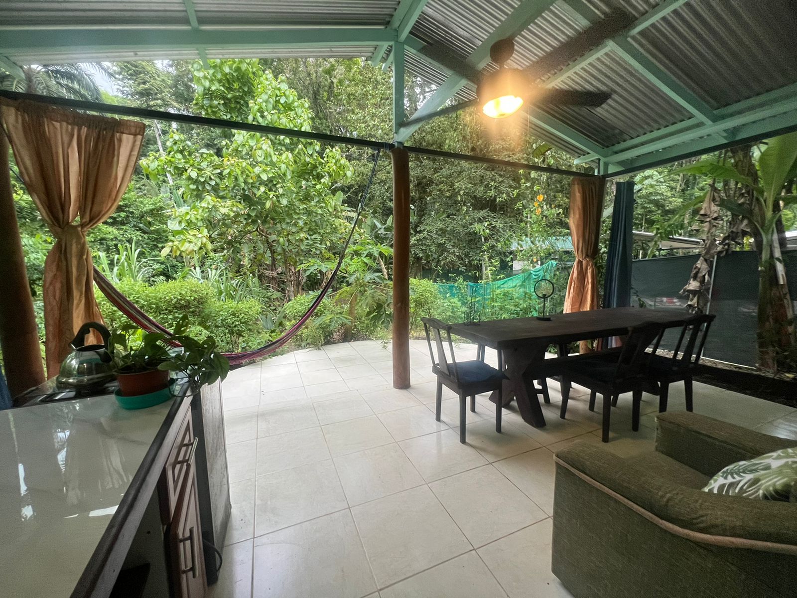 This Cocles vacation rental includes all utilities—water, electricity, and high-speed internet—for a seamless living experience. Stay cool with ceiling fans in every room, perfect for the tropical climate. The standout feature is the spacious open seating area overlooking lush tropical vegetation, offering a serene space to relax and disconnect.