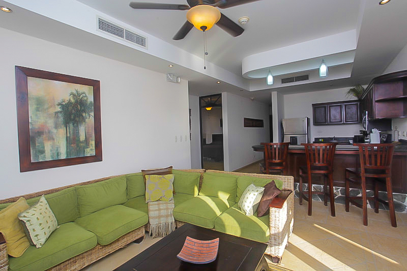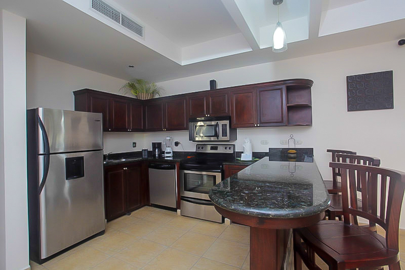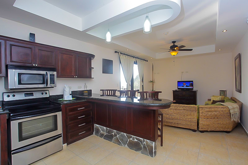 This unit comes completely furnished and outfitted down to the linens and utensils. The living area has plush sofas to relax on and a flat screen TV. The kitchen has stainless steel appliances, granite counters and a breakfast bar.