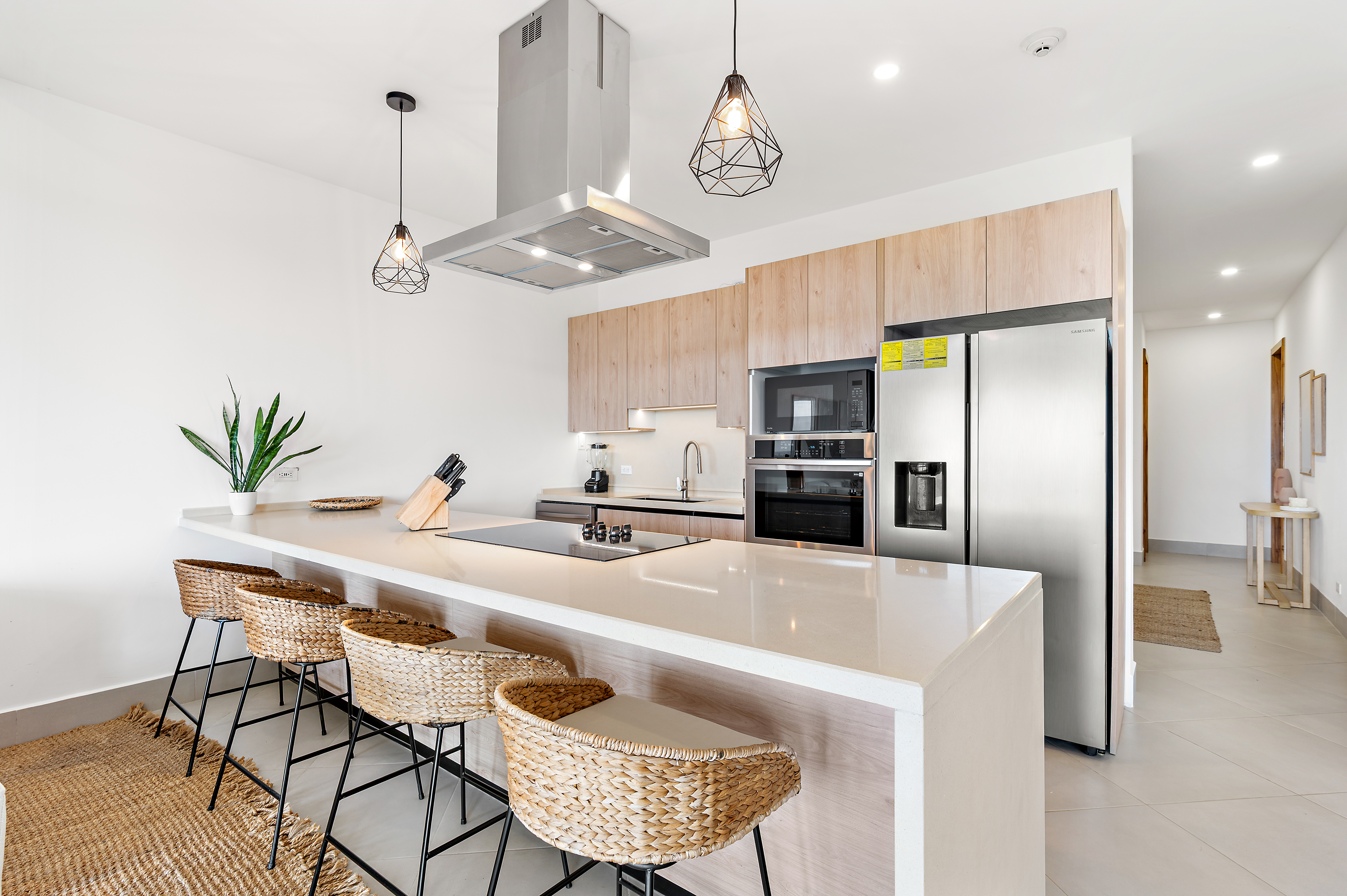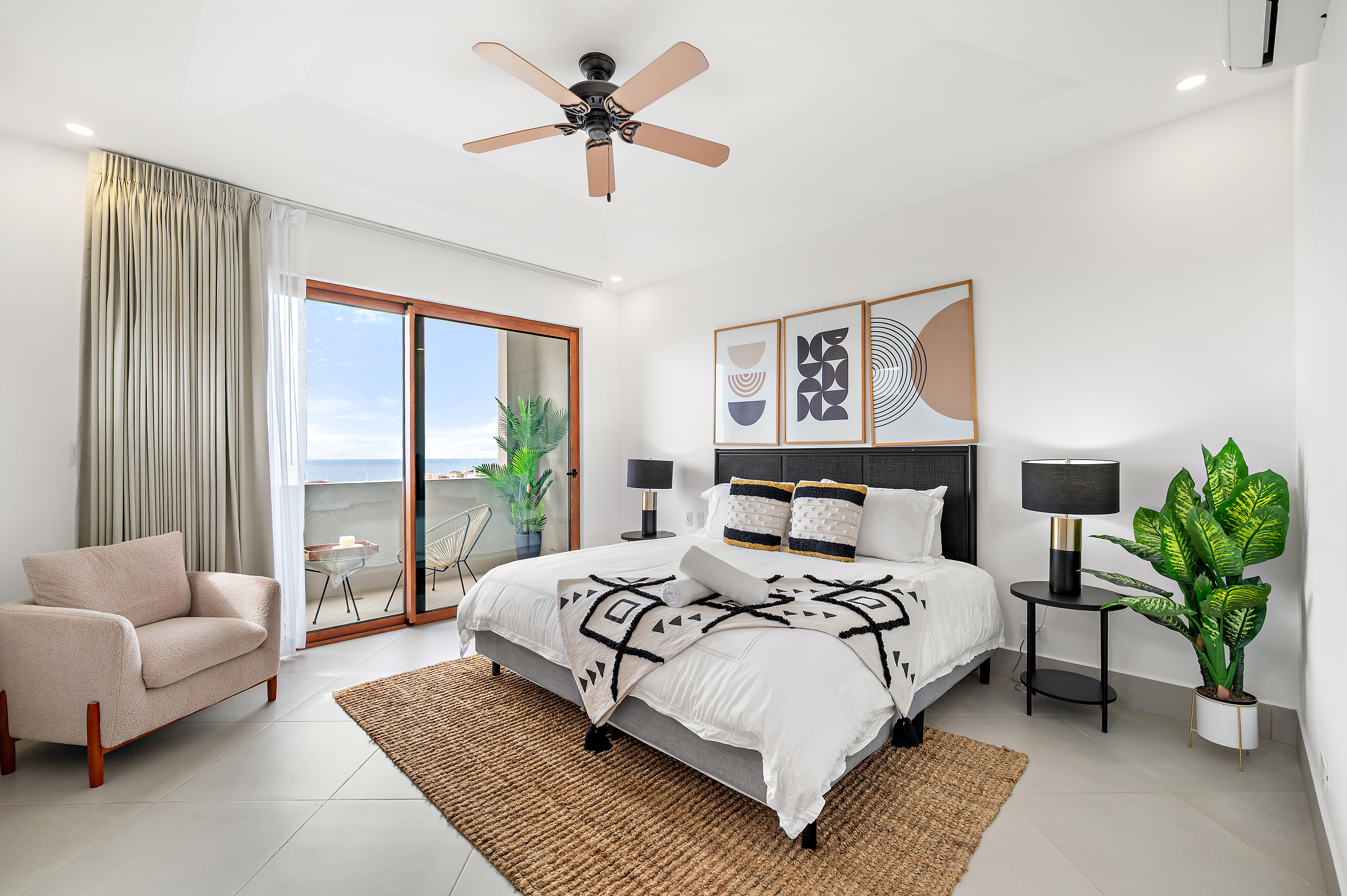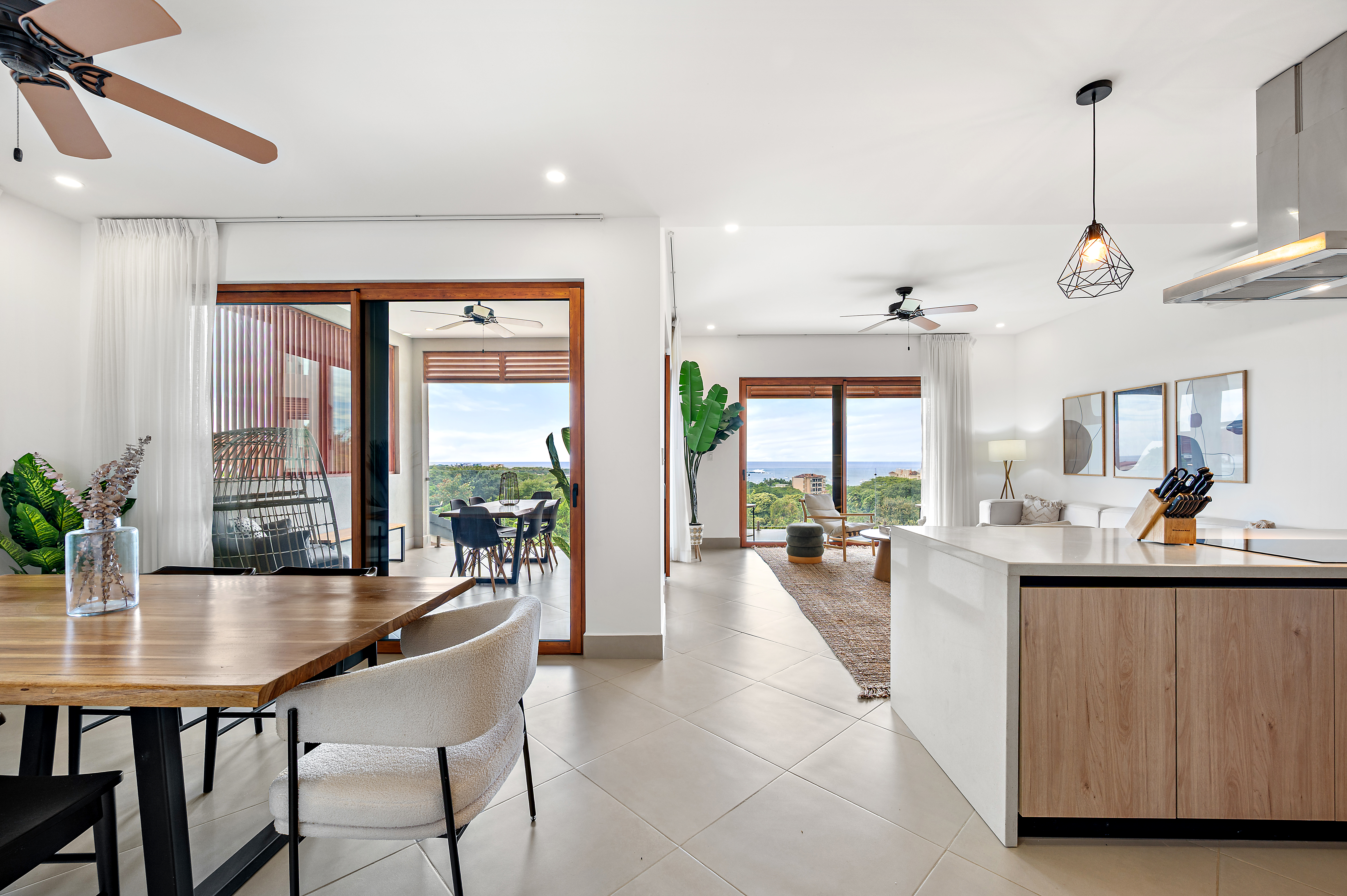 Puesta del Sol Unit #8 features three spacious bedrooms, three and a half bathrooms, and approximately 3,186 square feet of thoughtfully designed living space. The open-concept layout flows effortlessly onto a generous ocean-view balcony, creating a seamless indoor-outdoor living experience ideal for entertaining or relaxing in the tropical breeze. Soaring ceilings and expansive glass doors fill the home with natural light while framing the stunning coastal scenery.